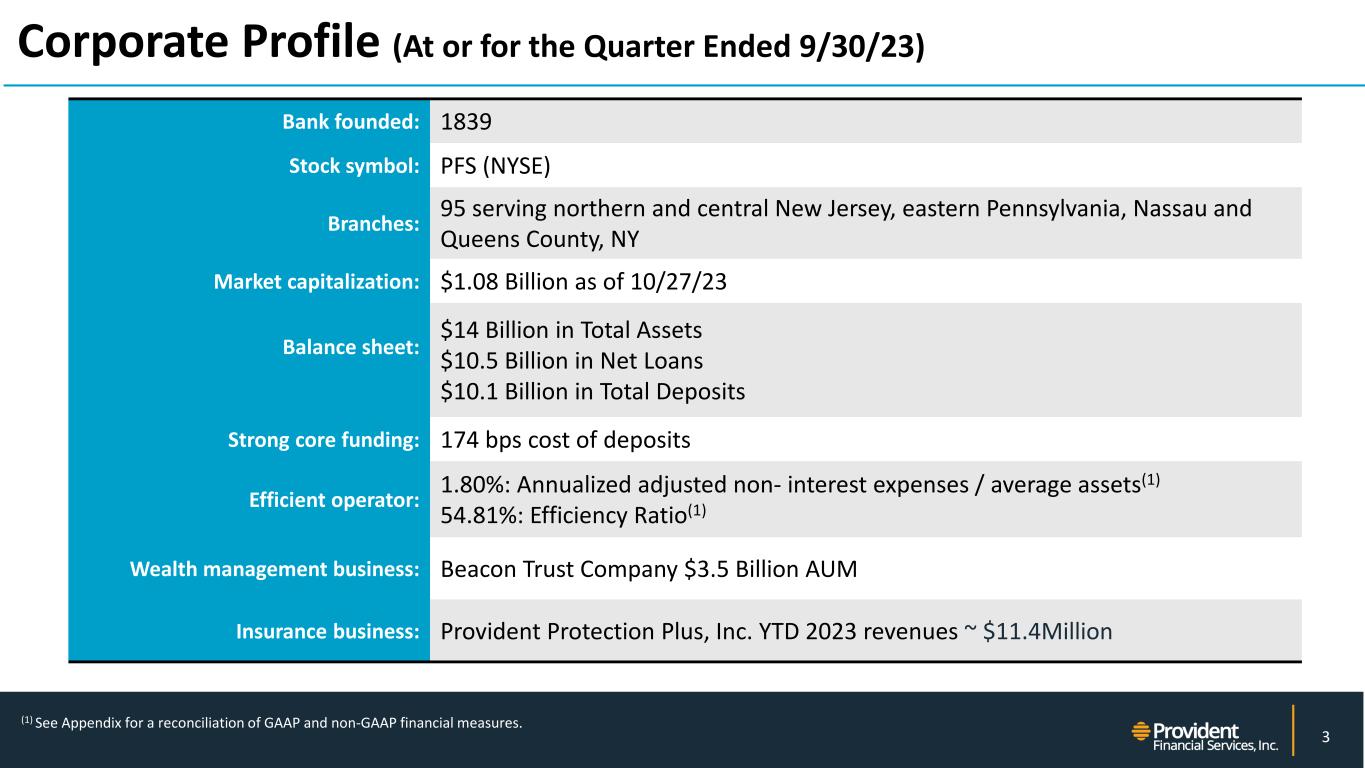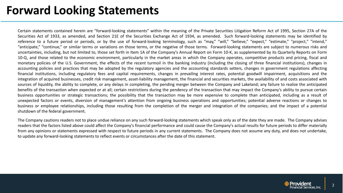 NYSE: PFS Forward Looking Statements Certain statements contained herein are “forward-looking statements” within the meaning of the Private Securities Litigation Reform Act of 1995, Section 27A of the Securities Act of 1933, as amended, and Section 21E of the Securities Exchange Act of 1934, as amended. Such forward-looking statements may be identified by reference to a future period or periods, or by the use of forward-looking terminology, such as “may,” “will,” “believe,” “expect,” “estimate,” "project," "intend," “anticipate,” “continue,” or similar terms or variations on those terms, or the negative of those terms. Forward-looking statements are subject to numerous risks and uncertainties, including, but not limited to, those set forth in Item 1A of the Company's Annual Report on Form 10-K, as supplemented by its Quarterly Reports on Form 10-Q, and those related to the economic environment, particularly in the market areas in which the Company operates, competitive products and pricing, fiscal and monetary policies of the U.S. Government, the effects of the recent turmoil in the banking industry (including the closing of three financial institutions), changes in accounting policies and practices that may be adopted by the regulatory agencies and the accounting standards setters, changes in government regulations affecting financial institutions, including regulatory fees and capital requirements, changes in prevailing interest rates, potential goodwill impairment, acquisitions and the integration of acquired businesses, credit risk management, asset-liability management, the financial and securities markets, the availability of and costs associated with sources of liquidity, the ability to complete, or any delays in completing, the pending merger between the Company and Lakeland; any failure to realize the anticipated benefits of the transaction when expected or at all; certain restrictions during the pendency of the transaction that may impact the Company’s ability to pursue certain business opportunities or strategic transactions; the possibility that the transaction may be more expensive to complete than anticipated, including as a result of unexpected factors or events, diversion of management’s attention from ongoing business operations and opportunities; potential adverse reactions or changes to business or employee relationships, including those resulting from the completion of the merger and integration of the companies; and the impact of a potential shutdown of the federal government. The Company cautions readers not to place undue reliance on any such forward-looking statements which speak only as of the date they are made. The Company advises readers that the factors listed above could affect the Company's financial performance and could cause the Company's actual results for future periods to differ materially from any opinions or statements expressed with respect to future periods in any current statements. The Company does not assume any duty, and does not undertake, to update any forward-looking statements to reflect events or circumstances after the date of this statement. 2