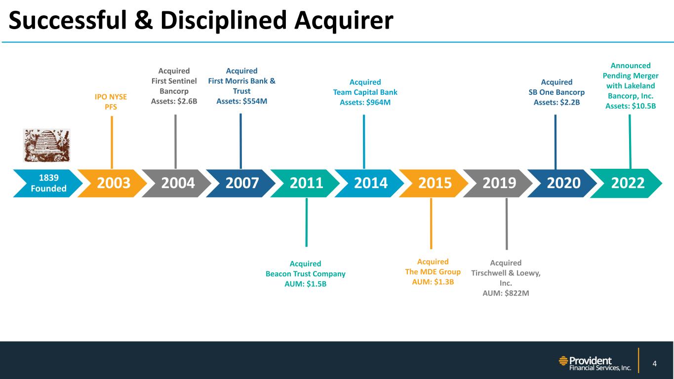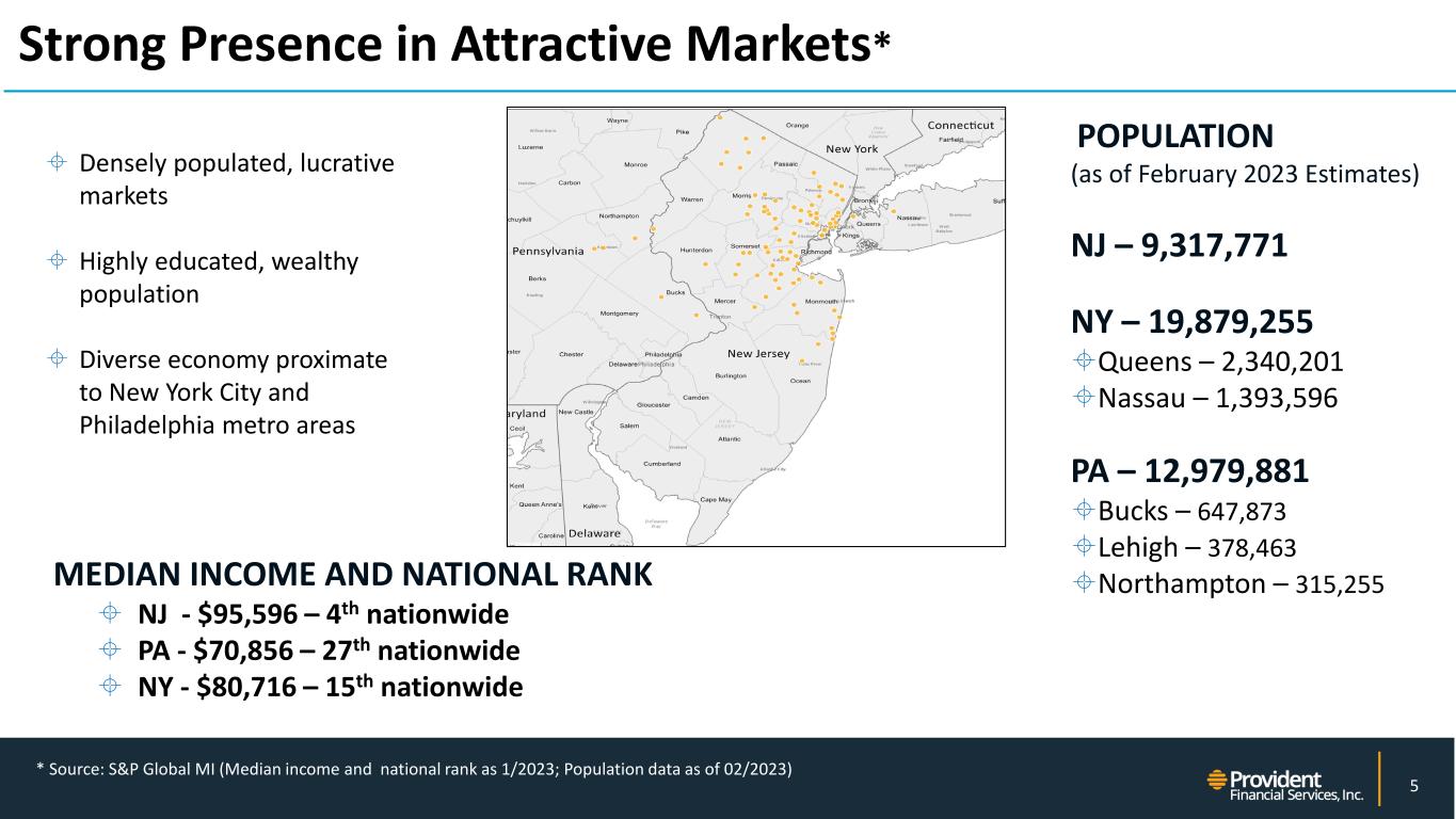 NYSE: PFS Acquired Tirschwell & Loewy, Inc. AUM: $822M Acquired The MDE Group AUM: $1.3B Acquired Team Capital Bank Assets: $964M Acquired First Sentinel Bancorp Assets: $2.6B Acquired First Morris Bank & Trust Assets: $554M Acquired Beacon Trust Company AUM: $1.5B IPO NYSE PFS 1839 Founded 2003 2004 2007 2011 2014 2015 2019 2020 2022 Successful & Disciplined Acquirer Acquired SB One Bancorp Assets: $2.2B 4 Announced Pending Merger with Lakeland Bancorp, Inc. Assets: $10.5B