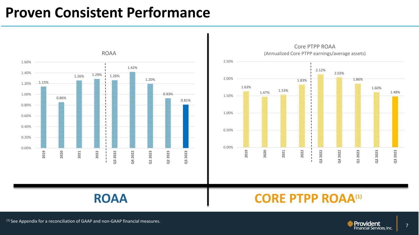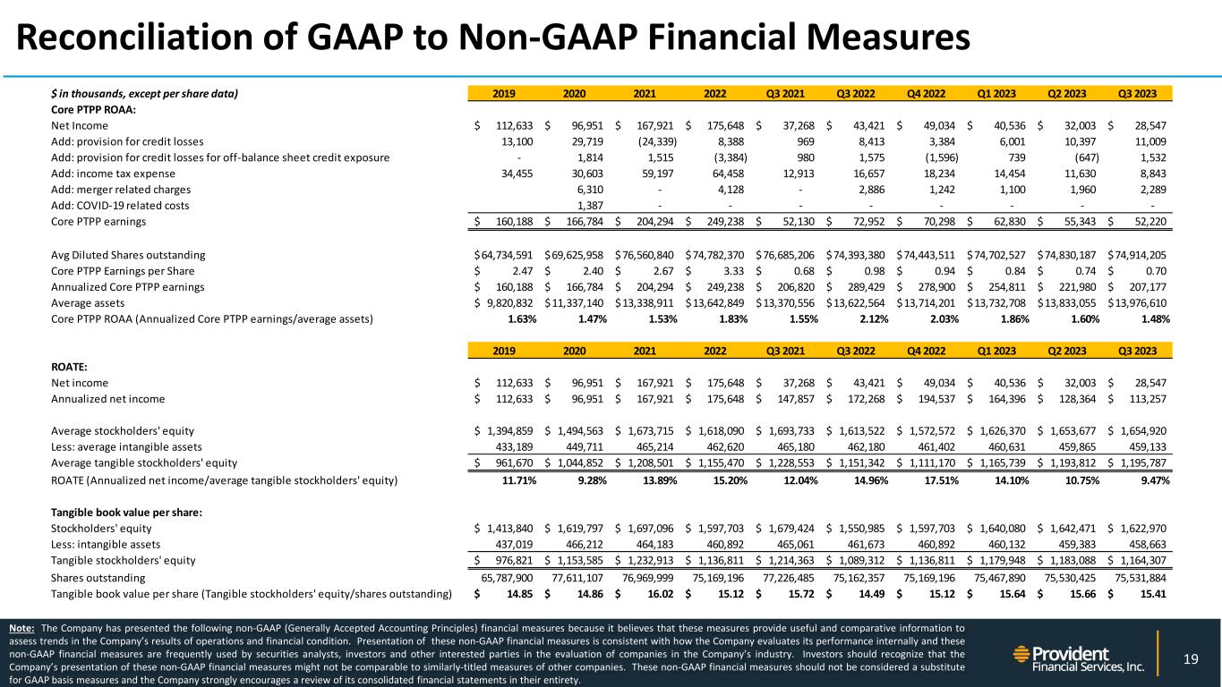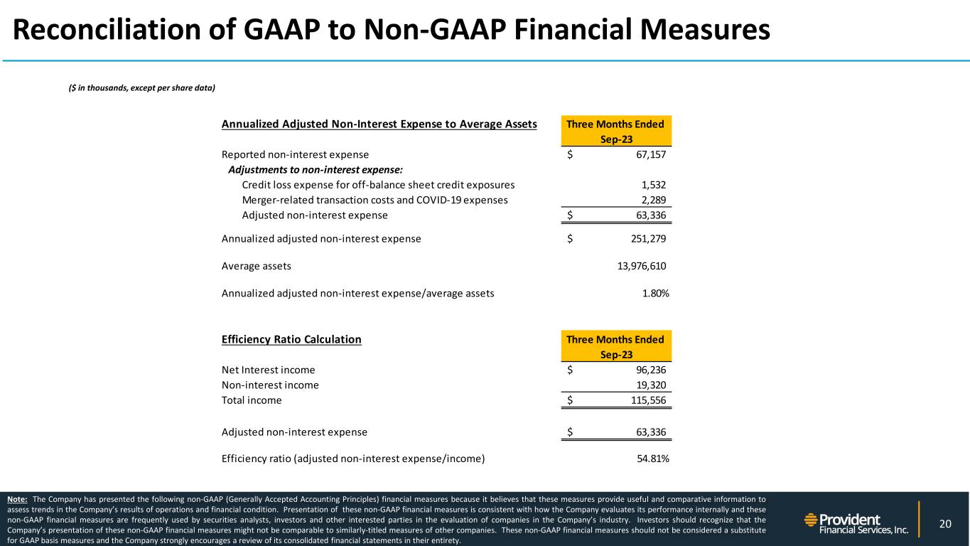 NYSE: PFS Note: The Company has presented the following non-GAAP (Generally Accepted Accounting Principles) financial measures because it believes that these measures provide useful and comparative information to assess trends in the Company’s results of operations and financial condition. Presentation of these non-GAAP financial measures is consistent with how the Company evaluates its performance internally and these non-GAAP financial measures are frequently used by securities analysts, investors and other interested parties in the evaluation of companies in the Company’s industry. Investors should recognize that the Company’s presentation of these non-GAAP financial measures might not be comparable to similarly-titled measures of other companies. These non-GAAP financial measures should not be considered a substitute for GAAP basis measures and the Company strongly encourages a review of its consolidated financial statements in their entirety. Reconciliation of GAAP to Non-GAAP Financial Measures 19 $ in thousands, except per share data) 2019 2020 2021 2022 Q3 2021 Q3 2022 Q4 2022 Q1 2023 Q2 2023 Q3 2023 Core PTPP ROAA: Net Income 112,633$ 96,951$ 167,921$ 175,648$ 37,268$ 43,421$ 49,034$ 40,536$ 32,003$ 28,547$ Add: provision for credit losses 13,100 29,719 (24,339) 8,388 969 8,413 3,384 6,001 10,397 11,009 Add: provision for credit losses for off-balance sheet credit exposure - 1,814 1,515 (3,384) 980 1,575 (1,596) 739 (647) 1,532 Add: income tax expense 34,455 30,603 59,197 64,458 12,913 16,657 18,234 14,454 11,630 8,843 Add: merger related charges 6,310 - 4,128 - 2,886 1,242 1,100 1,960 2,289 Add: COVID-19 related costs 1,387 - - - - - - - - Core PTPP earnings 160,188$ 166,784$ 204,294$ 249,238$ 52,130$ 72,952$ 70,298$ 62,830$ 55,343$ 52,220$ Avg Diluted Shares outstanding 64,734,591$ 69,625,958$ 76,560,840$ 74,782,370$ 76,685,206$ 74,393,380$ 74,443,511$ 74,702,527$ 74,830,187$ 74,914,205$ Core PTPP Earnings per Share 2.47$ 2.40$ 2.67$ 3.33$ 0.68$ 0.98$ 0.94$ 0.84$ 0.74$ 0.70$ Annualized Core PTPP earnings 160,188$ 166,784$ 204,294$ 249,238$ 206,820$ 289,429$ 278,900$ 254,811$ 221,980$ 207,177$ Average assets 9,820,832$ 11,337,140$ 13,338,911$ 13,642,849$ 13,370,556$ 13,622,564$ 13,714,201$ 13,732,708$ 13,833,055$ 13,976,610$ Core PTPP ROAA (Annualized Core PTPP earnings/average assets) 1.63% 1.47% 1.53% 1.83% 1.55% 2.12% 2.03% 1.86% 1.60% 1.48% 2019 2020 2021 2022 Q3 2021 Q3 2022 Q4 2022 Q1 2023 Q2 2023 Q3 2023 ROATE: Net income 112,633$ 96,951$ 167,921$ 175,648$ 37,268$ 43,421$ 49,034$ 40,536$ 32,003$ 28,547$ Annualized net income 112,633$ 96,951$ 167,921$ 175,648$ 147,857$ 172,268$ 194,537$ 164,396$ 128,364$ 113,257$ Average stockholders' equity 1,394,859$ 1,494,563$ 1,673,715$ 1,618,090$ 1,693,733$ 1,613,522$ 1,572,572$ 1,626,370$ 1,653,677$ 1,654,920$ Less: average intangible assets 433,189 449,711 465,214 462,620 465,180 462,180 461,402 460,631 459,865 459,133 Average tangible stockholders' equity 961,670$ 1,044,852$ 1,208,501$ 1,155,470$ 1,228,553$ 1,151,342$ 1,111,170$ 1,165,739$ 1,193,812$ 1,195,787$ ROATE (Annualized net income/average tangible stockholders' equity) 11.71% 9.28% 13.89% 15.20% 12.04% 14.96% 17.51% 14.10% 10.75% 9.47% Tangible book value per share: Stockholders' equity 1,413,840$ 1,619,797$ 1,697,096$ 1,597,703$ 1,679,424$ 1,550,985$ 1,597,703$ 1,640,080$ 1,642,471$ 1,622,970$ Less: intangible assets 437,019 466,212 464,183 460,892 465,061 461,673 460,892 460,132 459,383 458,663 Tangible stockholders' equity 976,821$ 1,153,585$ 1,232,913$ 1,136,811$ 1,214,363$ 1,089,312$ 1,136,811$ 1,179,948$ 1,183,088$ 1,164,307$ Shares outstanding 65,787,900 77,611,107 76,969,999 75,169,196 77,226,485 75,162,357 75,169,196 75,467,890 75,530,425 75,531,884 Tangible book value per share (Tangible stockholders' equity/shares outstanding) 14.85$ 14.86$ 16.02$ 15.12$ 15.72$ 14.49$ 15.12$ 15.64$ 15.66$ 15.41$