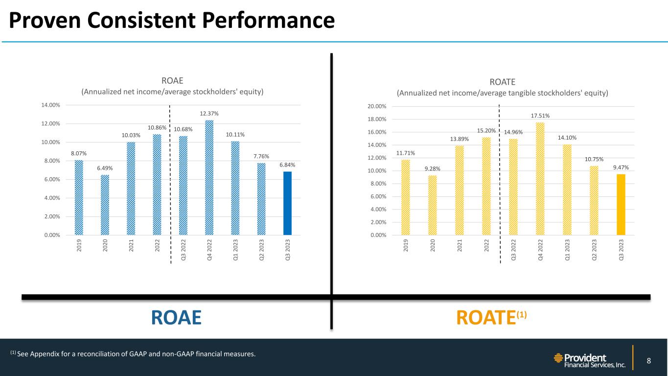 NYSE: PFS ROAA CORE PTPP ROAA(1) (1) See Appendix for a reconciliation of GAAP and non-GAAP financial measures. Proven Consistent Performance 7 1.15% 0.86% 1.26% 1.29% 1.26% 1.42% 1.20% 0.93% 0.81% 0.00% 0.20% 0.40% 0.60% 0.80% 1.00% 1.20% 1.40% 1.60% 20 19 20 20 20 21 20 22 Q 3 20 22 Q 4 20 22 Q 1 20 23 Q 2 20 23 Q 3 20 23 ROAA 1.63% 1.47% 1.53% 1.83% 2.12% 2.03% 1.86% 1.60% 1.48% 0.00% 0.50% 1.00% 1.50% 2.00% 2.50% 20 19 20 20 20 21 20 22 Q 3 20 22 Q 4 20 22 Q 1 20 23 Q 2 20 23 Q 3 20 23 Core PTPP ROAA (Annualized Core PTPP earnings/average assets)