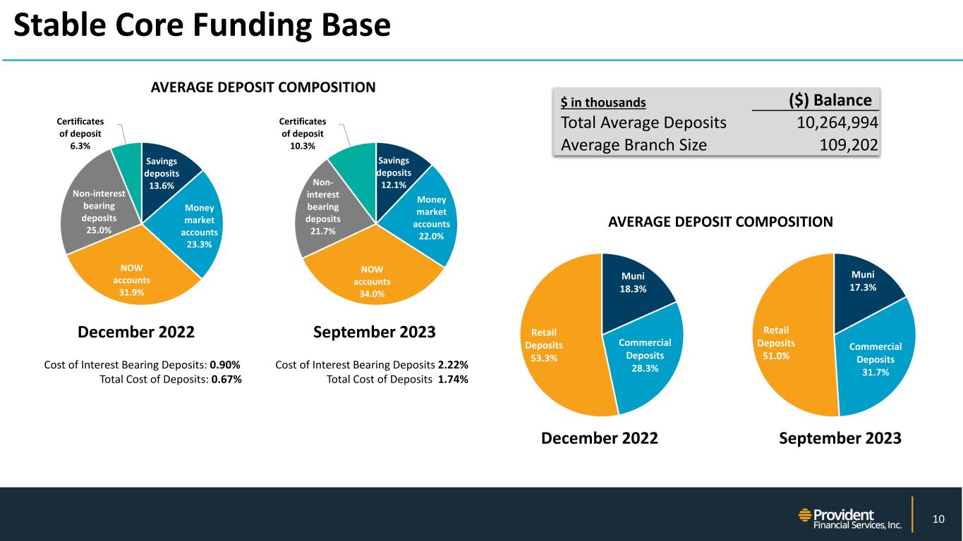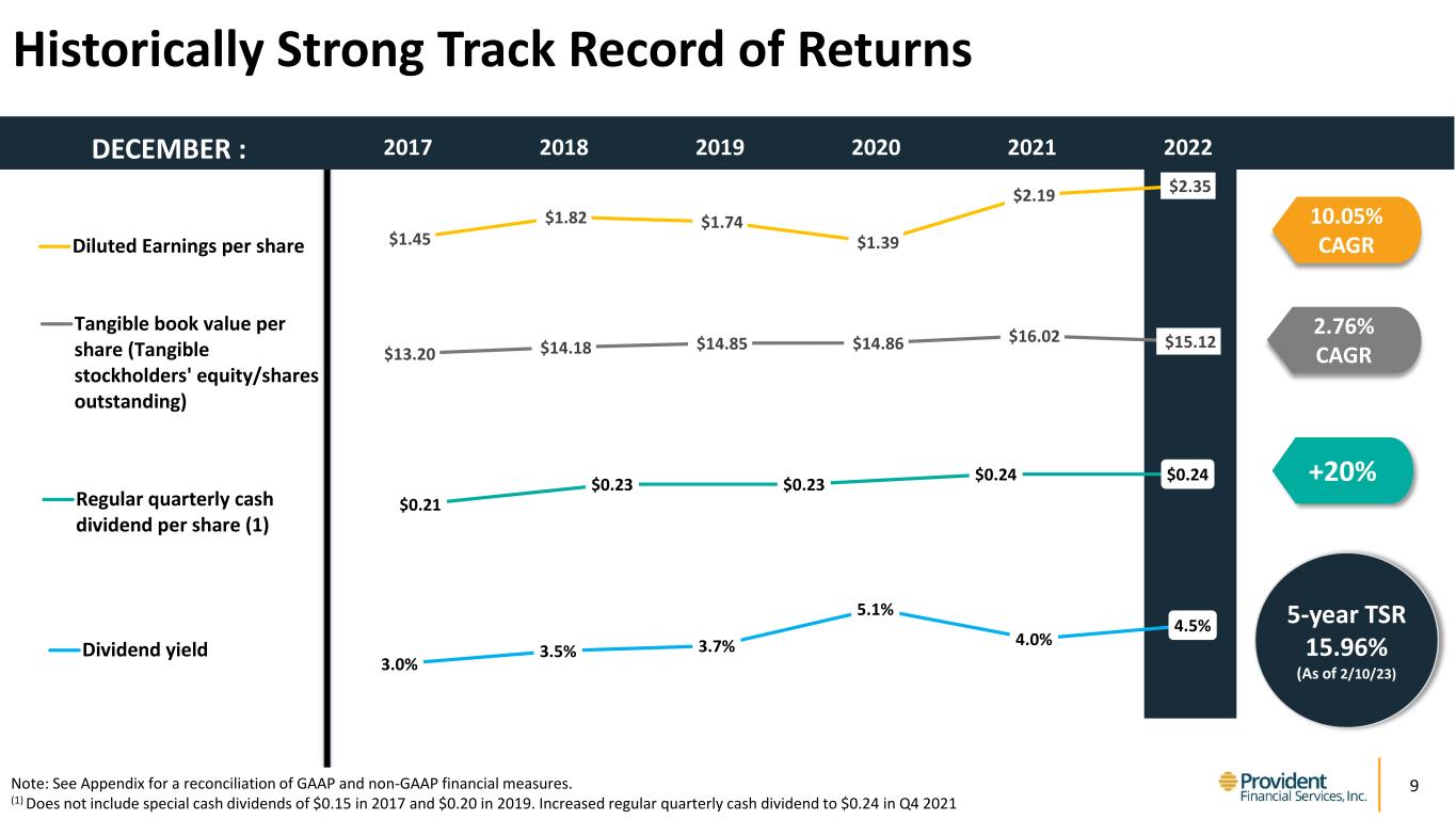 NYSE: PFS ROAE ROATE(1) (1) See Appendix for a reconciliation of GAAP and non-GAAP financial measures. Proven Consistent Performance 8 8.07% 6.49% 10.03% 10.86% 10.68% 12.37% 10.11% 7.76% 6.84% 0.00% 2.00% 4.00% 6.00% 8.00% 10.00% 12.00% 14.00% 20 19 20 20 20 21 20 22 Q 3 20 22 Q 4 20 22 Q 1 20 23 Q 2 20 23 Q 3 20 23 ROAE (Annualized net income/average stockholders' equity) 11.71% 9.28% 13.89% 15.20% 14.96% 17.51% 14.10% 10.75% 9.47% 0.00% 2.00% 4.00% 6.00% 8.00% 10.00% 12.00% 14.00% 16.00% 18.00% 20.00% 20 19 20 20 20 21 20 22 Q 3 20 22 Q 4 20 22 Q 1 20 23 Q 2 20 23 Q 3 20 23 ROATE (Annualized net income/average tangible stockholders' equity)