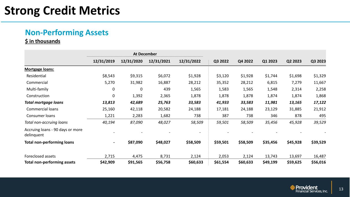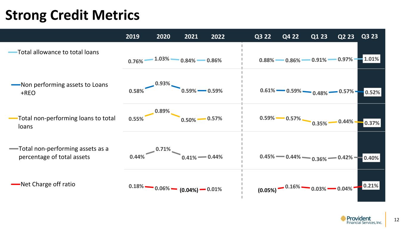 Strong Credit Metrics 12 0.76% 1.03% 0.84% 0.86% 0.88% 0.86% 0.91% 0.97% 1.01% Total allowance to total loans 0.58% 0.93% 0.59% 0.59% 0.61% 0.59% 0.48% 0.57% 0.52% Non performing assets to Loans +REO 0.55% 0.89% 0.50% 0.57% 0.59% 0.57% 0.35% 0.44% 0.37% Total non-performing loans to total loans 0.44% 0.71% 0.41% 0.44% 0.45% 0.44% 0.36% 0.42% 0.40% Total non-performing assets as a percentage of total assets 0.18% 0.06% (0.04%) 0.01% (0.05%) 0.16% 0.03% 0.04% 0.21%Net Charge off ratio Q1 2320202019 2021 Q3 22 Q4 222022 Q2 23 Q3 23