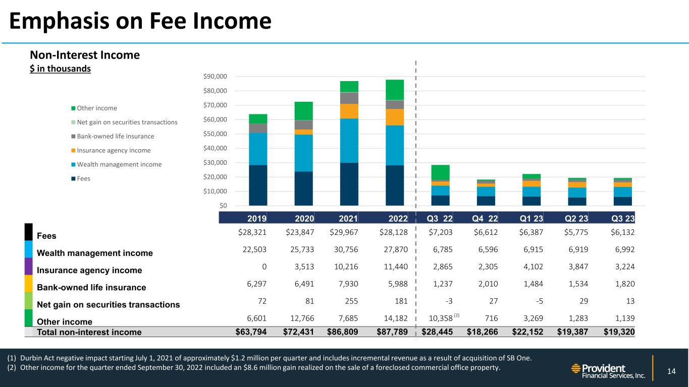 NYSE: PFS $0 $10,000 $20,000 $30,000 $40,000 $50,000 $60,000 $70,000 $80,000 $90,000 2019 2020 2021 2022 Q3 22 Q4 22 Q1 23 Q2 23 Q3 23 Other income Net gain on securities transactions Bank-owned life insurance Insurance agency income Wealth management income Fees 2019 2020 2021 2022 Q3 22 Q4 22 Q1 23 Q2 23 Q3 23 Fees $28,321 $23,847 $29,967 $28,128 $7,203 $6,612 $6,387 $5,775 $6,132 Wealth management income 22,503 25,733 30,756 27,870 6,785 6,596 6,915 6,919 6,992 Insurance agency income 0 3,513 10,216 11,440 2,865 2,305 4,102 3,847 3,224 Bank-owned life insurance 6,297 6,491 7,930 5,988 1,237 2,010 1,484 1,534 1,820 Net gain on securities transactions 72 81 255 181 -3 27 -5 29 13 Other income 6,601 12,766 7,685 14,182 10,358 716 3,269 1,283 1,139 Total non-interest income $63,794 $72,431 $86,809 $87,789 $28,445 $18,266 $22,152 $19,387 $19,320 Emphasis on Fee Income Non-Interest Income $ in thousands 14 (1) Durbin Act negative impact starting July 1, 2021 of approximately $1.2 million per quarter and includes incremental revenue as a result of acquisition of SB One. (2) Other income for the quarter ended September 30, 2022 included an $8.6 million gain realized on the sale of a foreclosed commercial office property. (2)