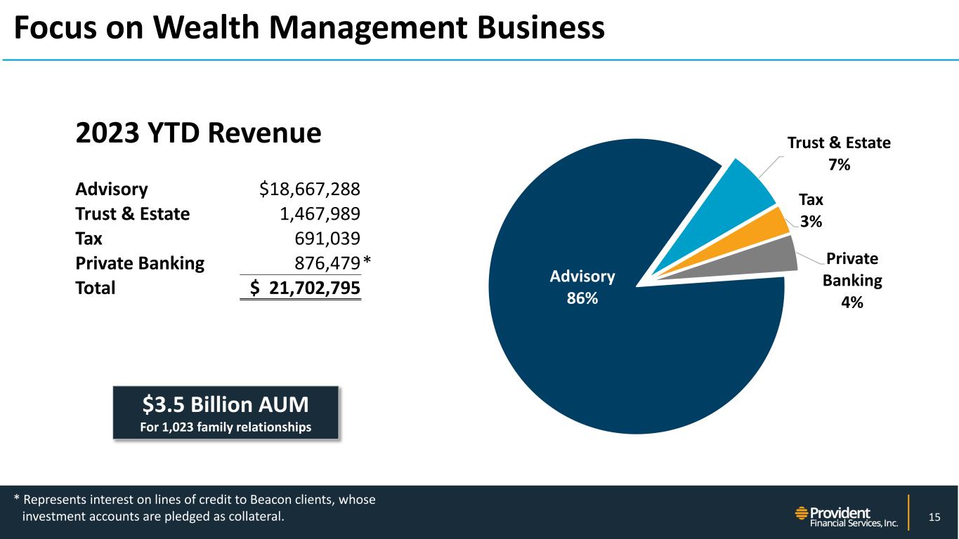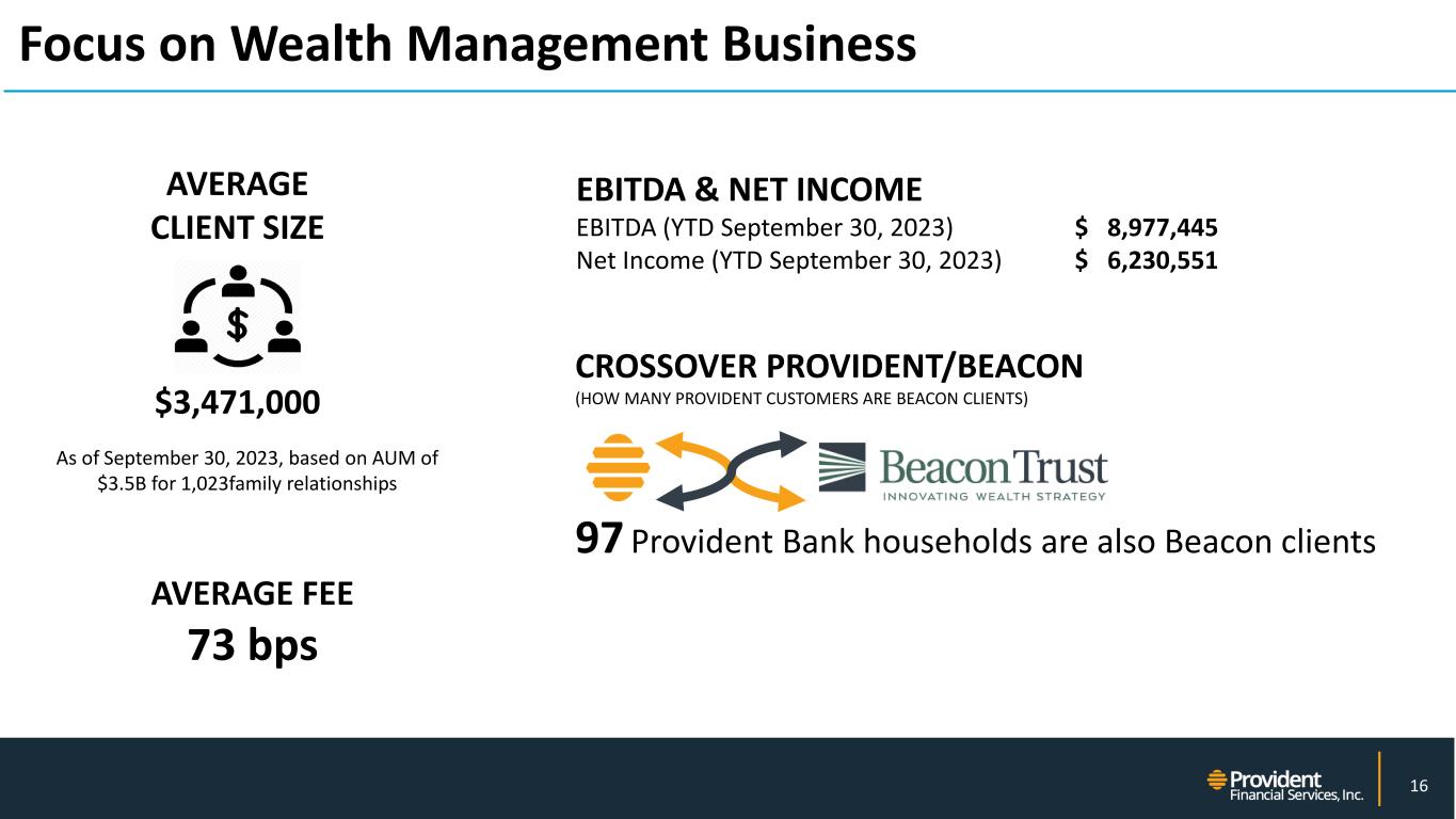 NYSE: PFS * Represents interest on lines of credit to Beacon clients, whose investment accounts are pledged as collateral. Advisory 86% Trust & Estate 7% Tax 3% Private Banking 4% Focus on Wealth Management Business 2023 YTD Revenue Advisory $18,667,288 Trust & Estate 1,467,989 Tax 691,039 Private Banking 876,479 * Total $ 21,702,795 15 $3.5 Billion AUM For 1,023 family relationships