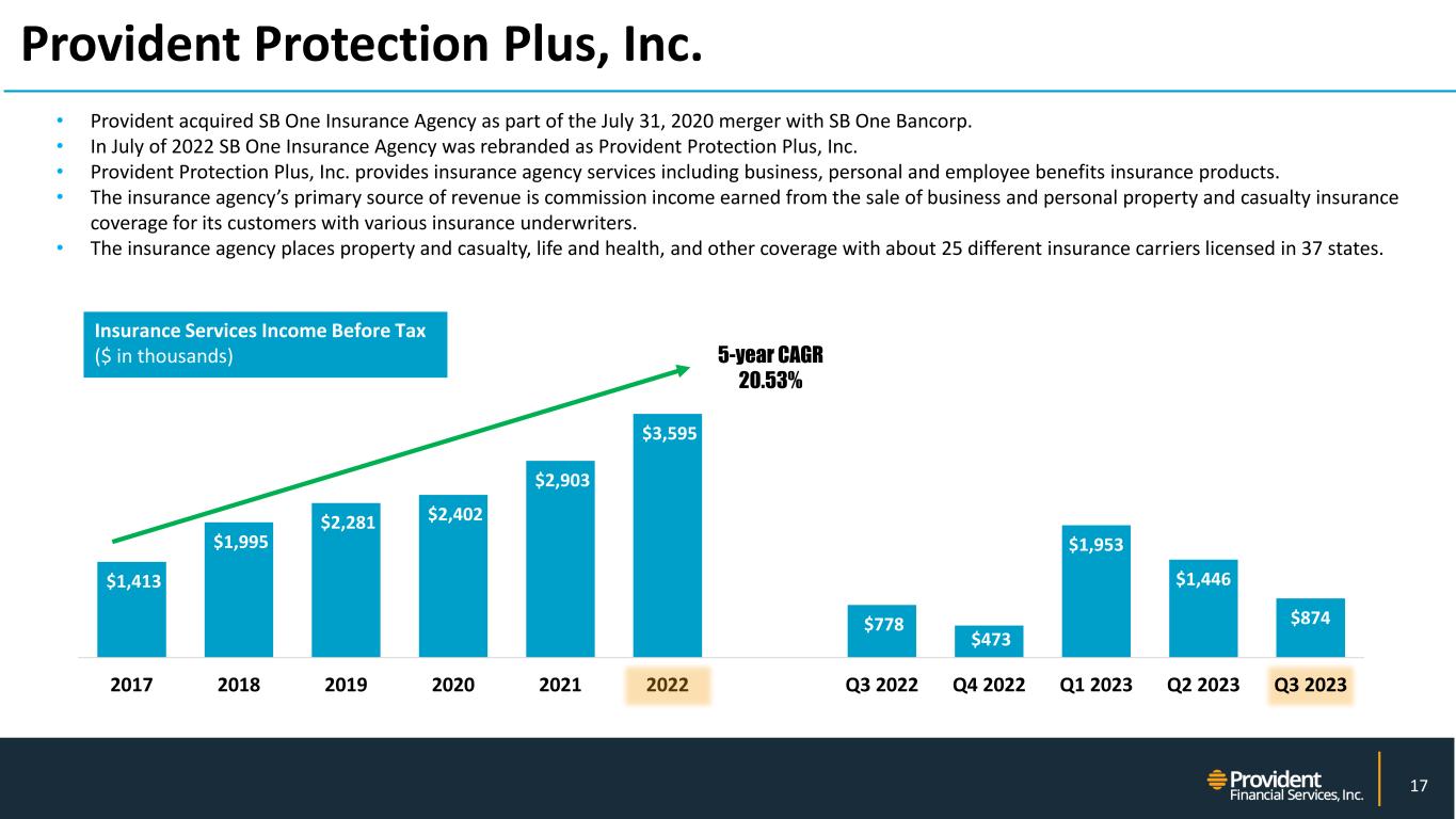 NYSE: PFS AVERAGE CLIENT SIZE $3,471,000 As of September 30, 2023, based on AUM of $3.5B for 1,023family relationships AVERAGE FEE 73 bps EBITDA & NET INCOME EBITDA (YTD September 30, 2023) $ 8,977,445 Net Income (YTD September 30, 2023) $ 6,230,551 CROSSOVER PROVIDENT/BEACON (HOW MANY PROVIDENT CUSTOMERS ARE BEACON CLIENTS) 97 Provident Bank households are also Beacon clients Focus on Wealth Management Business 16
