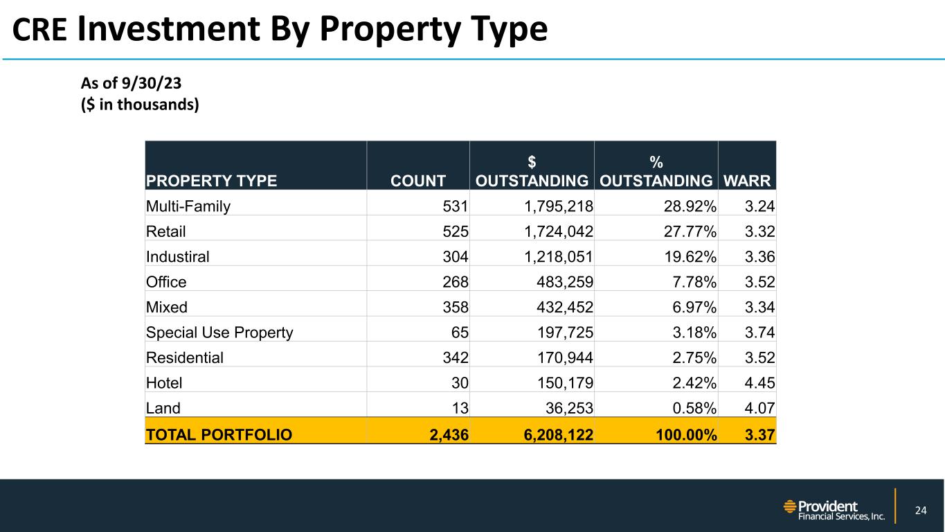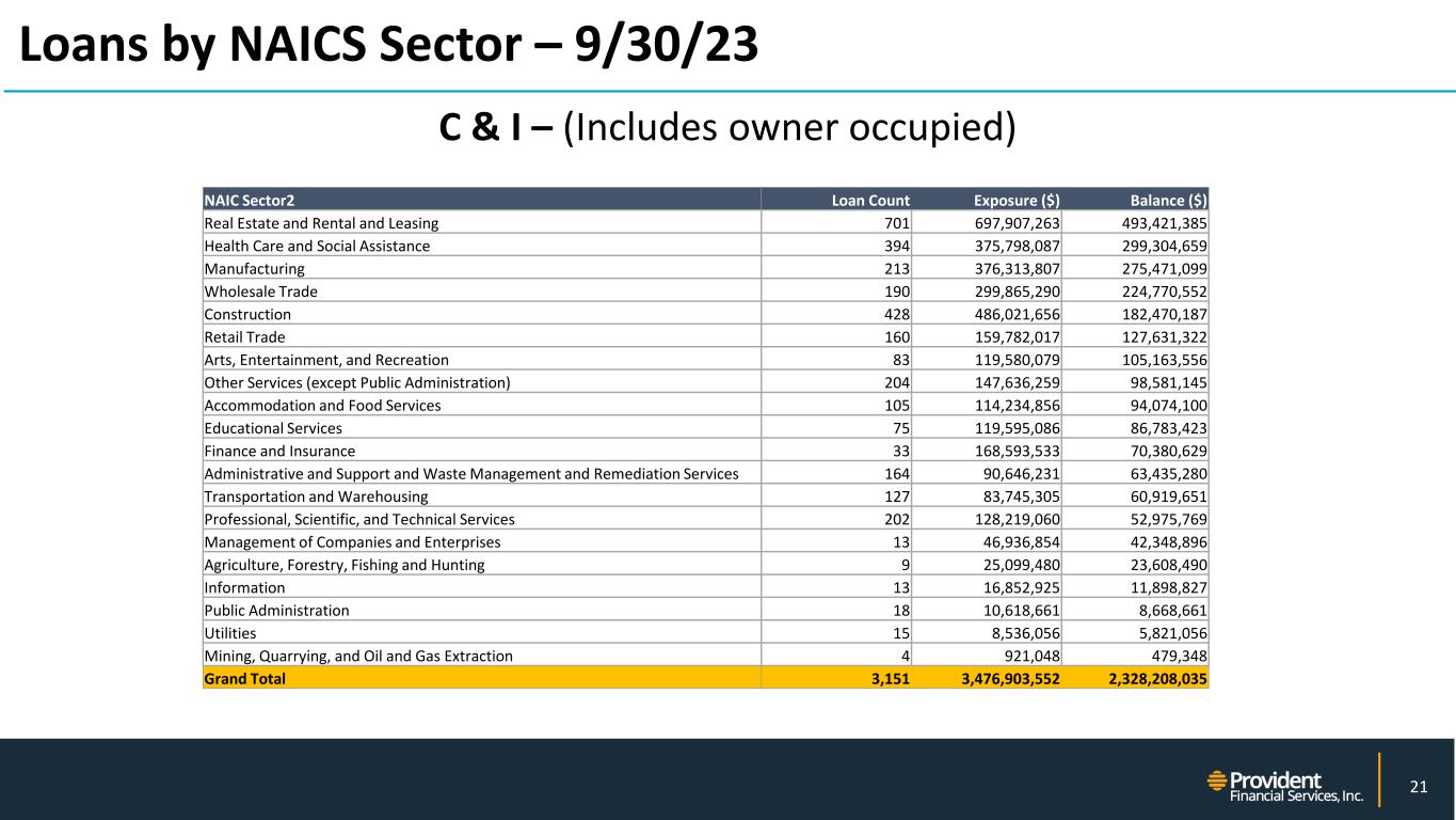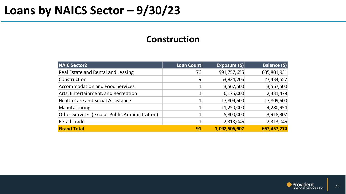 NYSE: PFS Commercial Real Estate Loans by NAICS Sector – 9/30/23 22 NAIC Sector2 Loan Count Exposure ($) Balance ($) Real Estate and Rental and Leasing 2,210 5,926,678,170 5,820,848,783 Accommodation and Food Services 42 159,778,065 159,593,393 Other Services (except Public Administration) 37 28,795,837 26,830,837 Construction 32 64,066,639 57,411,634 Health Care and Social Assistance 24 49,107,688 48,888,444 Public Administration 21 1,827,229 827,229 Retail Trade 16 22,422,596 22,422,596 Finance and Insurance 6 4,020,645 4,020,645 Manufacturing 5 4,673,284 4,673,284 Professional, Scientific, and Technical Services 5 2,410,142 2,410,142 Transportation and Warehousing 5 19,880,834 19,878,587 Arts, Entertainment, and Recreation 4 19,965,938 19,965,938 Management of Companies and Enterprises 3 2,554,812 2,554,812 Educational Services 2 6,966,506 6,966,506 Administrative and Support and Waste Management and Remediation Services 1 589,741 589,741 Information 1 1,761,046 1,761,046 Grand Total 2,414 6,315,499,174 6,199,643,617