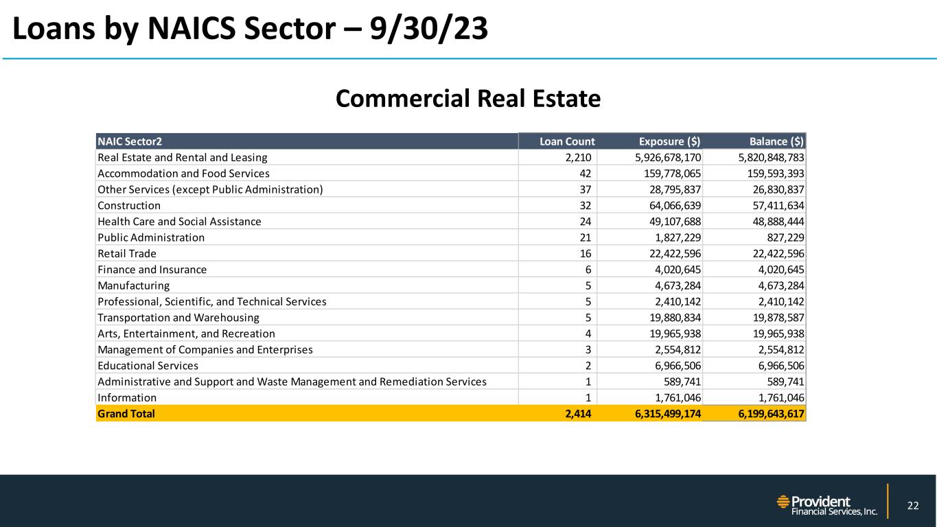 NYSE: PFS C & I – (Includes owner occupied) Loans by NAICS Sector – 9/30/23 21 NAIC Sector2 Loan Count Exposure ($) Balance ($) Real Estate and Rental and Leasing 701 697,907,263 493,421,385 Health Care and Social Assistance 394 375,798,087 299,304,659 Manufacturing 213 376,313,807 275,471,099 Wholesale Trade 190 299,865,290 224,770,552 Construction 428 486,021,656 182,470,187 Retail Trade 160 159,782,017 127,631,322 Arts, Entertainment, and Recreation 83 119,580,079 105,163,556 Other Services (except Public Administration) 204 147,636,259 98,581,145 Accommodation and Food Services 105 114,234,856 94,074,100 Educational Services 75 119,595,086 86,783,423 Finance and Insurance 33 168,593,533 70,380,629 Administrative and Support and Waste Management and Remediation Services 164 90,646,231 63,435,280 Transportation and Warehousing 127 83,745,305 60,919,651 Professional, Scientific, and Technical Services 202 128,219,060 52,975,769 Management of Companies and Enterprises 13 46,936,854 42,348,896 Agriculture, Forestry, Fishing and Hunting 9 25,099,480 23,608,490 Information 13 16,852,925 11,898,827 Public Administration 18 10,618,661 8,668,661 Utilities 15 8,536,056 5,821,056 Mining, Quarrying, and Oil and Gas Extraction 4 921,048 479,348 Grand Total 3,151 3,476,903,552 2,328,208,035