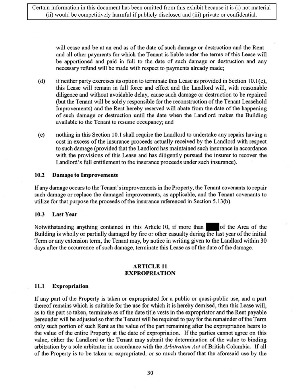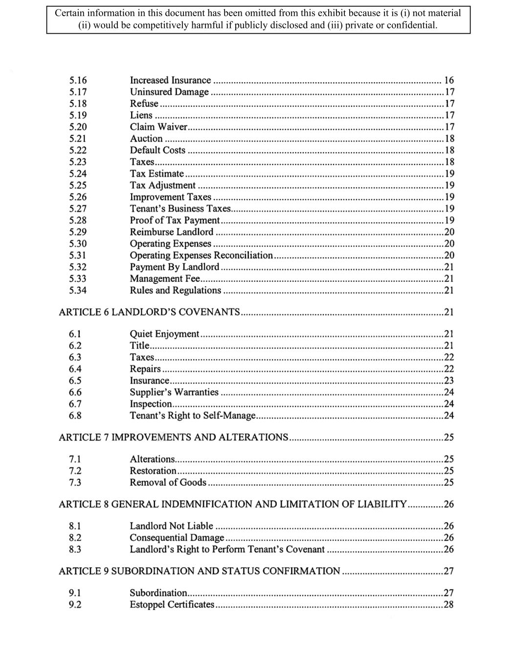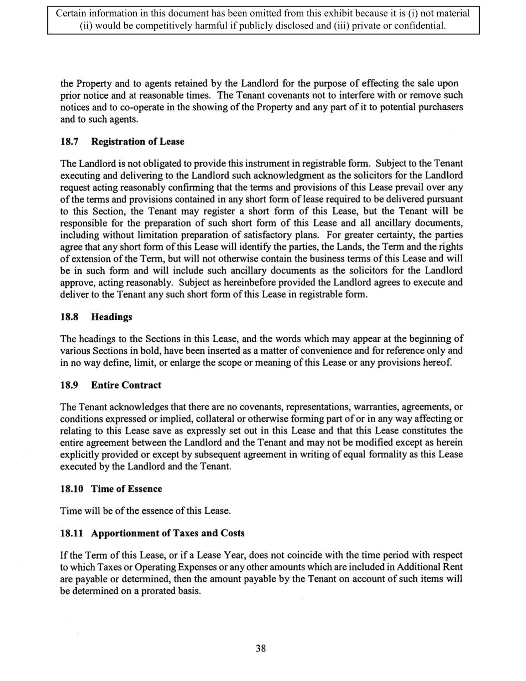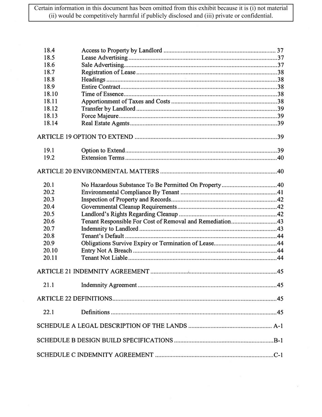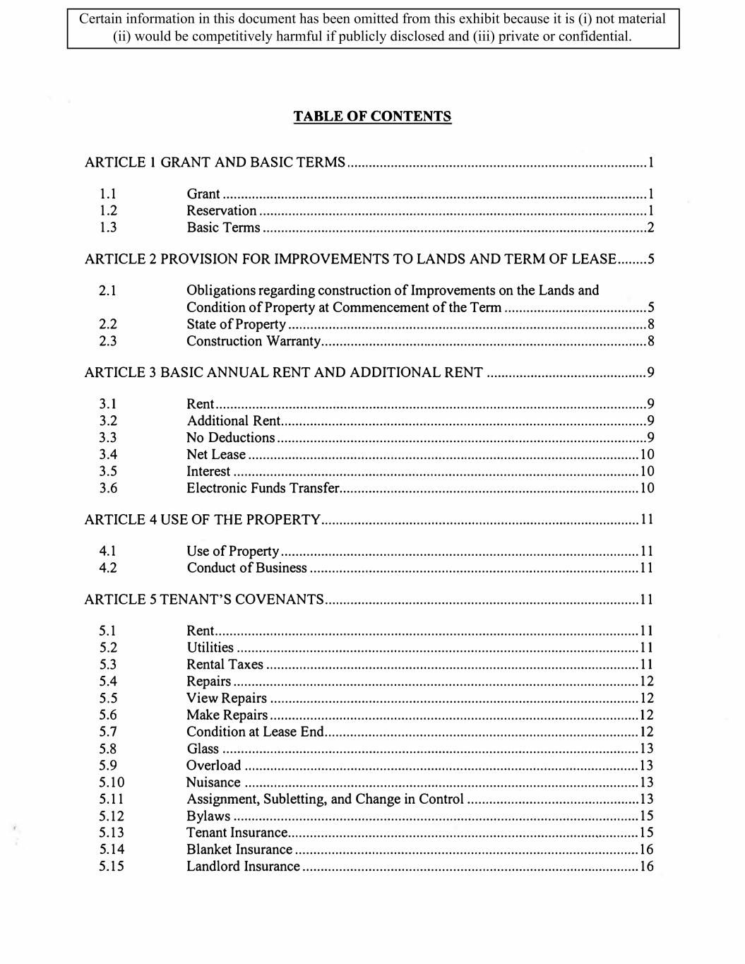 TABLE OF CONTENTS ARTICLE 1 GRANT AND BASIC TERMS .................................................................................. 1 1.1 Grant .................................................................................................................... 1 1.2 Reservation .......................................................................................................... 1 1.3 Basic Terms ......................................................................................................... 2 ARTICLE 2 PROVISION FOR IMPROVEMENTS TO LANDS AND TERM OF LEASE ........ 5 2.1 Obligations regarding construction of Improvements on the Lands and Condition of Property at Commencement of the Term ....................................... 5 2.2 State of Property .................................................................................................. 8 2.3 Construction Warranty ......................................................................................... 8 ARTICLE 3 BASIC ANNUAL RENT AND ADDITIONAL RENT ............................................ 9 3.1 Rent ...................................................................................................................... 9 3.2 Additional Rent. ................................................................................................... 9 3.3 No Deductions ..................................................................................................... 9 3.4 Net Lease ........................................................................................................... 10 3.5 Interest ............................................................................................................... 10 3.6 Electronic Funds Transfer .................................................................................. 10 ARTICLE 4 USE OF THE PROPERTY ....................................................................................... 11 4.1 Use of Property .................................................................................................. 11 4.2 Conduct of Business .......................................................................................... 11 ARTICLE 5 TENANT'S COVENANTS ...................................................................................... 11 5.1 Rent .................................................................................................................... 11 5.2 Utilities .............................................................................................................. 11 5.3 Rental Taxes ...................................................................................................... 11 5.4 Repairs ............................................................................................................... 12 5.5 View Repairs ..................................................................................................... 12 5.6 Make Repairs ..................................................................................................... 12 5.7 Condition at Lease End ...................................................................................... 12 5.8 Glass .................................................................................................................. 13 5.9 Overload ............................................................................................................ 13 5.10 Nuisance ............................................................................................................ 13 5.11 Assignment, Subletting, and Change in Control ............................................... 13 5.12 Bylaws ............................................................................................................... 15 5.13 Tenant Insurance ................................................................................................ 15 5 .14 Blanket Insurance .............................................................................................. 16 5.15 Landlord Insurance ............................................................................................ 16 Certain information in this document has been omitted from this exhibit because it is (i) not material (ii) would be competitively harmful if publicly disclosed and (iii) private or confidential.