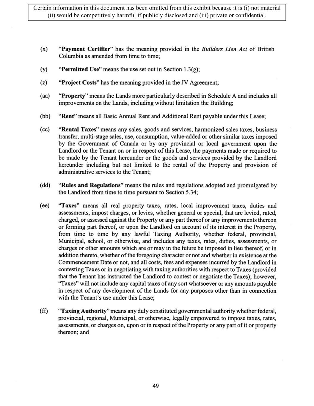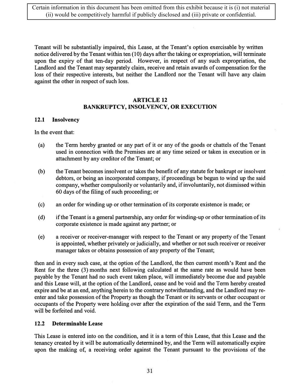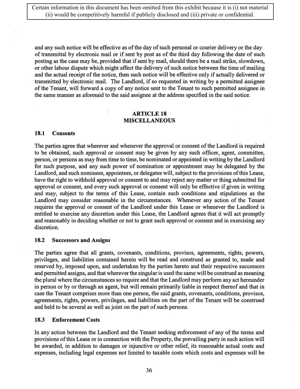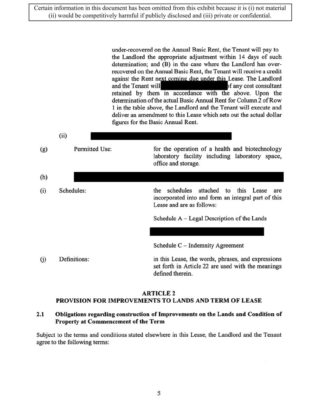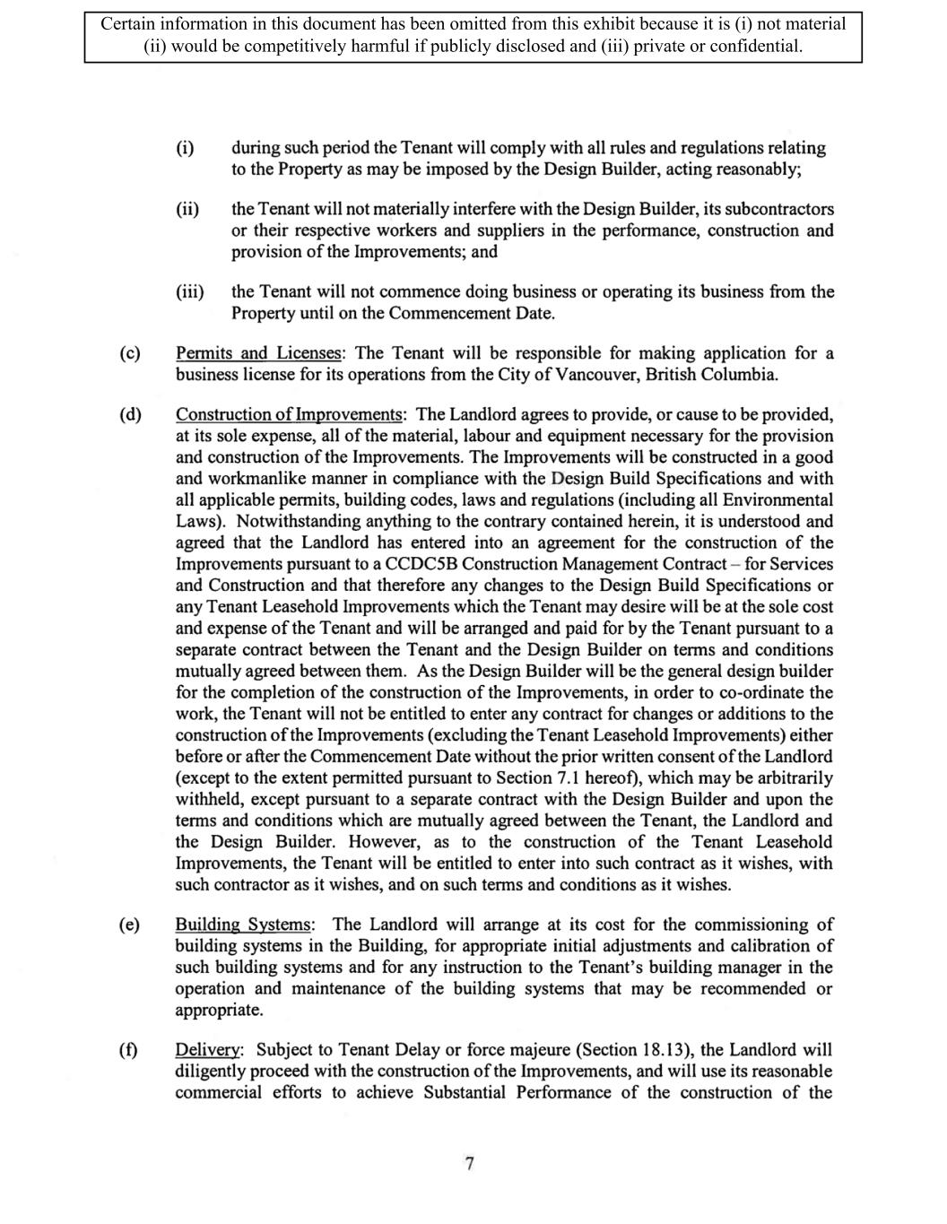 TABLE OF CONTENTS ARTICLE 1 GRANT AND BASIC TERMS .................................................................................. 1 1.1 Grant .................................................................................................................... 1 1.2 Reservation .......................................................................................................... 1 1.3 Basic Terms ......................................................................................................... 2 ARTICLE 2 PROVISION FOR IMPROVEMENTS TO LANDS AND TERM OF LEASE ........ 5 2.1 Obligations regarding construction of Improvements on the Lands and Condition of Property at Commencement of the Term ....................................... 5 2.2 State of Property .................................................................................................. 8 2.3 Construction Warranty ......................................................................................... 8 ARTICLE 3 BASIC ANNUAL RENT AND ADDITIONAL RENT ............................................ 9 3.1 Rent ...................................................................................................................... 9 3.2 Additional Rent. ................................................................................................... 9 3.3 No Deductions ..................................................................................................... 9 3.4 Net Lease ........................................................................................................... 10 3.5 Interest ............................................................................................................... 10 3.6 Electronic Funds Transfer .................................................................................. 10 ARTICLE 4 USE OF THE PROPERTY ....................................................................................... 11 4.1 Use of Property .................................................................................................. 11 4.2 Conduct of Business .......................................................................................... 11 ARTICLE 5 TENANT'S COVENANTS ...................................................................................... 11 5.1 Rent .................................................................................................................... 11 5.2 Utilities .............................................................................................................. 11 5.3 Rental Taxes ...................................................................................................... 11 5.4 Repairs ............................................................................................................... 12 5.5 View Repairs ..................................................................................................... 12 5.6 Make Repairs ..................................................................................................... 12 5.7 Condition at Lease End ...................................................................................... 12 5.8 Glass .................................................................................................................. 13 5.9 Overload ............................................................................................................ 13 5.10 Nuisance ............................................................................................................ 13 5.11 Assignment, Subletting, and Change in Control ............................................... 13 5.12 Bylaws ............................................................................................................... 15 5.13 Tenant Insurance ................................................................................................ 15 5 .14 Blanket Insurance .............................................................................................. 16 5.15 Landlord Insurance ............................................................................................ 16 Certain information in this document has been omitted from this exhibit because it is (i) not material (ii) would be competitively harmful if publicly disclosed and (iii) private or confidential.