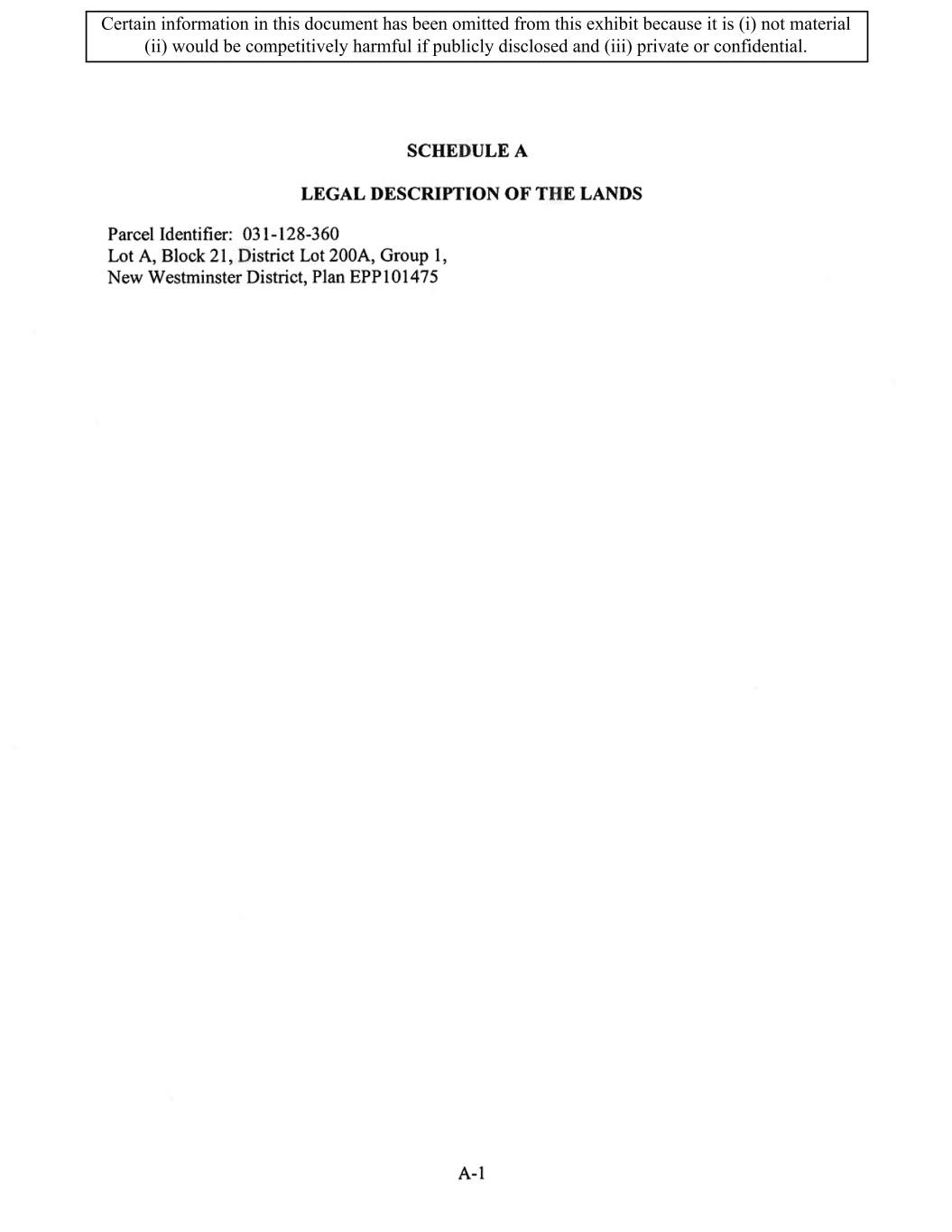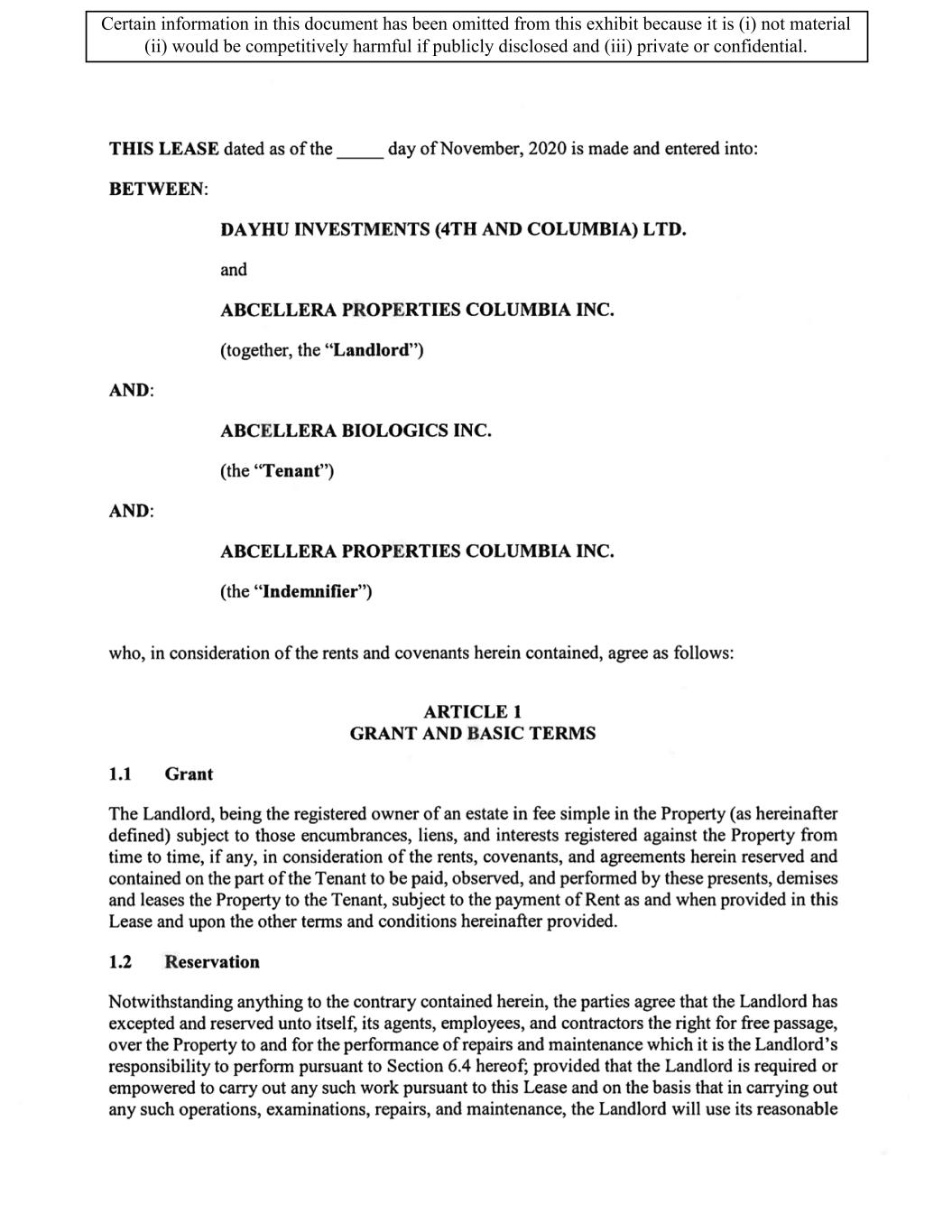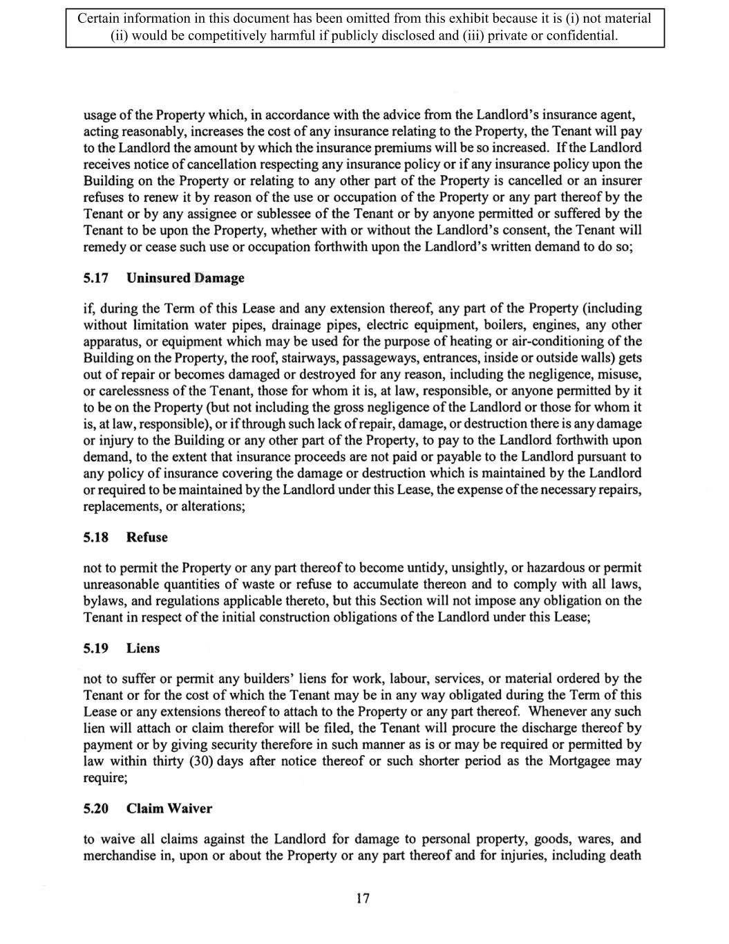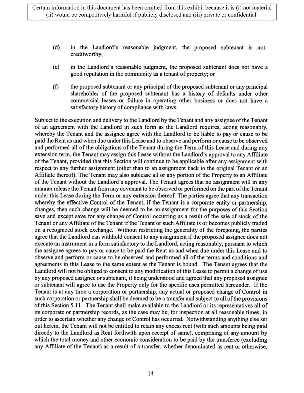 TABLE OF CONTENTS ARTICLE 1 GRANT AND BASIC TERMS .................................................................................. 1 1.1 Grant .................................................................................................................... 1 1.2 Reservation .......................................................................................................... 1 1.3 Basic Terms ......................................................................................................... 2 ARTICLE 2 PROVISION FOR IMPROVEMENTS TO LANDS AND TERM OF LEASE ........ 5 2.1 Obligations regarding construction of Improvements on the Lands and Condition of Property at Commencement of the Term ....................................... 5 2.2 State of Property .................................................................................................. 8 2.3 Construction Warranty ......................................................................................... 8 ARTICLE 3 BASIC ANNUAL RENT AND ADDITIONAL RENT ............................................ 9 3.1 Rent ...................................................................................................................... 9 3.2 Additional Rent. ................................................................................................... 9 3.3 No Deductions ..................................................................................................... 9 3.4 Net Lease ........................................................................................................... 10 3.5 Interest ............................................................................................................... 10 3.6 Electronic Funds Transfer .................................................................................. 10 ARTICLE 4 USE OF THE PROPERTY ....................................................................................... 11 4.1 Use of Property .................................................................................................. 11 4.2 Conduct of Business .......................................................................................... 11 ARTICLE 5 TENANT'S COVENANTS ...................................................................................... 11 5.1 Rent .................................................................................................................... 11 5.2 Utilities .............................................................................................................. 11 5.3 Rental Taxes ...................................................................................................... 11 5.4 Repairs ............................................................................................................... 12 5.5 View Repairs ..................................................................................................... 12 5.6 Make Repairs ..................................................................................................... 12 5.7 Condition at Lease End ...................................................................................... 12 5.8 Glass .................................................................................................................. 13 5.9 Overload ............................................................................................................ 13 5.10 Nuisance ............................................................................................................ 13 5.11 Assignment, Subletting, and Change in Control ............................................... 13 5.12 Bylaws ............................................................................................................... 15 5.13 Tenant Insurance ................................................................................................ 15 5 .14 Blanket Insurance .............................................................................................. 16 5.15 Landlord Insurance ............................................................................................ 16 Certain information in this document has been omitted from this exhibit because it is (i) not material (ii) would be competitively harmful if publicly disclosed and (iii) private or confidential.