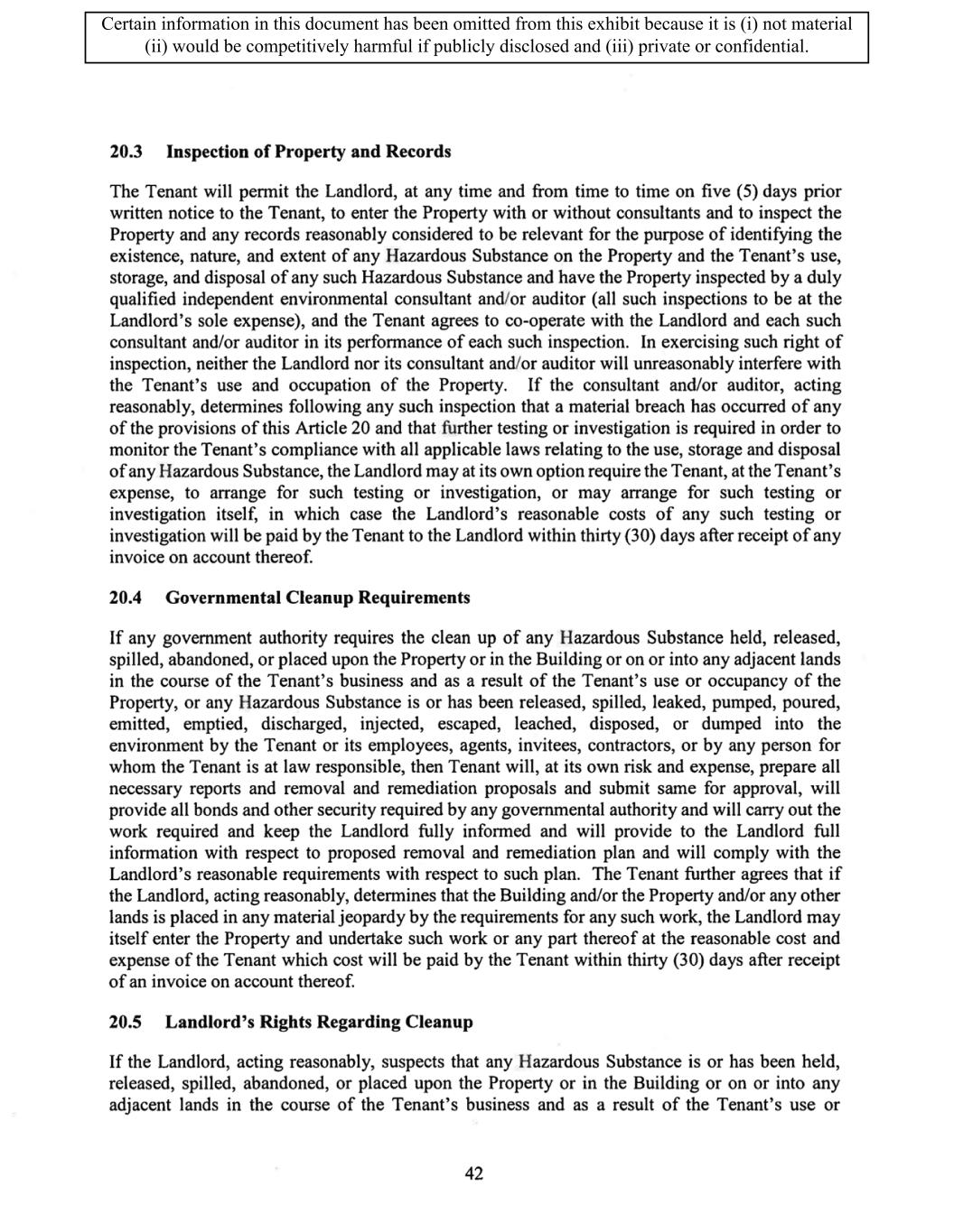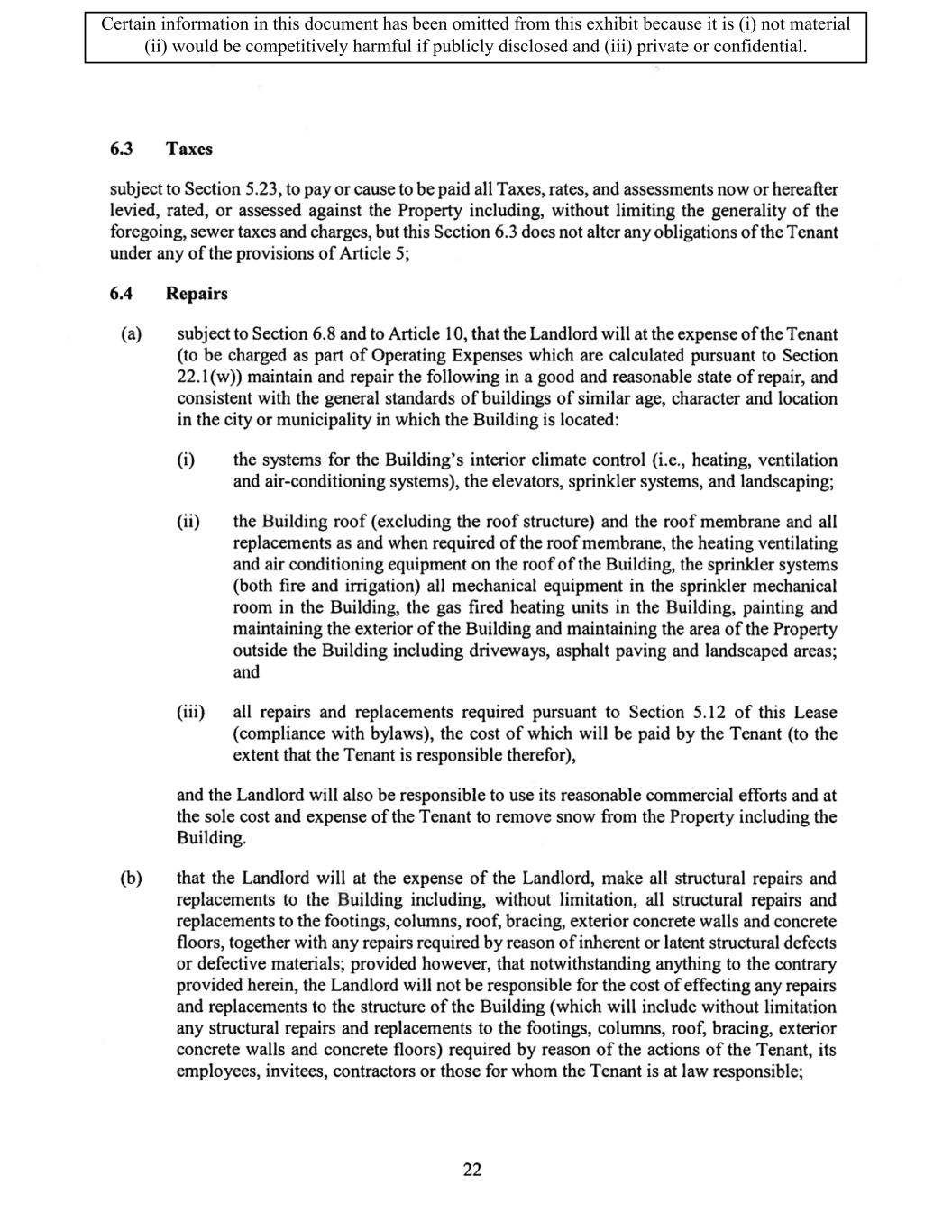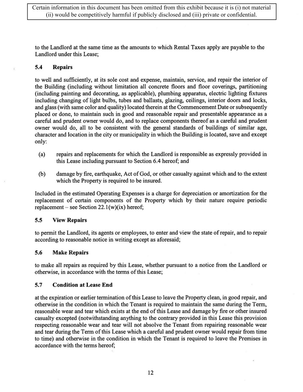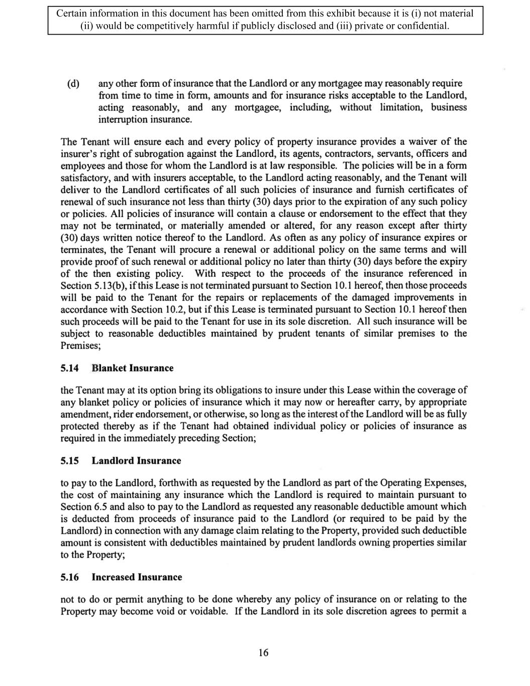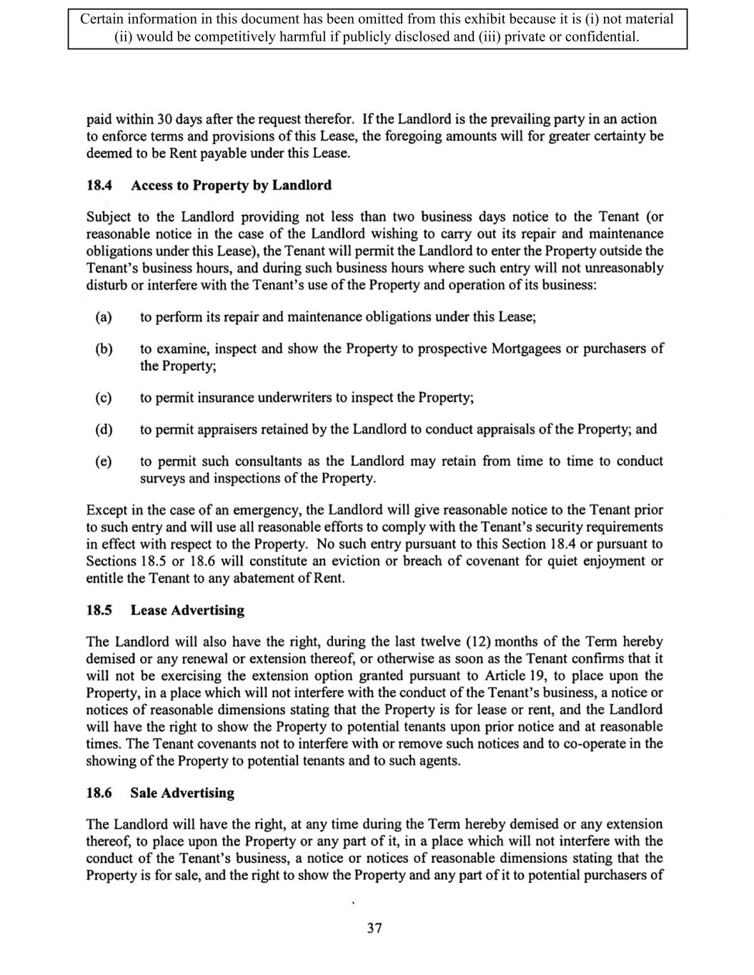 TABLE OF CONTENTS ARTICLE 1 GRANT AND BASIC TERMS .................................................................................. 1 1.1 Grant .................................................................................................................... 1 1.2 Reservation .......................................................................................................... 1 1.3 Basic Terms ......................................................................................................... 2 ARTICLE 2 PROVISION FOR IMPROVEMENTS TO LANDS AND TERM OF LEASE ........ 5 2.1 Obligations regarding construction of Improvements on the Lands and Condition of Property at Commencement of the Term ....................................... 5 2.2 State of Property .................................................................................................. 8 2.3 Construction Warranty ......................................................................................... 8 ARTICLE 3 BASIC ANNUAL RENT AND ADDITIONAL RENT ............................................ 9 3.1 Rent ...................................................................................................................... 9 3.2 Additional Rent. ................................................................................................... 9 3.3 No Deductions ..................................................................................................... 9 3.4 Net Lease ........................................................................................................... 10 3.5 Interest ............................................................................................................... 10 3.6 Electronic Funds Transfer .................................................................................. 10 ARTICLE 4 USE OF THE PROPERTY ....................................................................................... 11 4.1 Use of Property .................................................................................................. 11 4.2 Conduct of Business .......................................................................................... 11 ARTICLE 5 TENANT'S COVENANTS ...................................................................................... 11 5.1 Rent .................................................................................................................... 11 5.2 Utilities .............................................................................................................. 11 5.3 Rental Taxes ...................................................................................................... 11 5.4 Repairs ............................................................................................................... 12 5.5 View Repairs ..................................................................................................... 12 5.6 Make Repairs ..................................................................................................... 12 5.7 Condition at Lease End ...................................................................................... 12 5.8 Glass .................................................................................................................. 13 5.9 Overload ............................................................................................................ 13 5.10 Nuisance ............................................................................................................ 13 5.11 Assignment, Subletting, and Change in Control ............................................... 13 5.12 Bylaws ............................................................................................................... 15 5.13 Tenant Insurance ................................................................................................ 15 5 .14 Blanket Insurance .............................................................................................. 16 5.15 Landlord Insurance ............................................................................................ 16 Certain information in this document has been omitted from this exhibit because it is (i) not material (ii) would be competitively harmful if publicly disclosed and (iii) private or confidential.