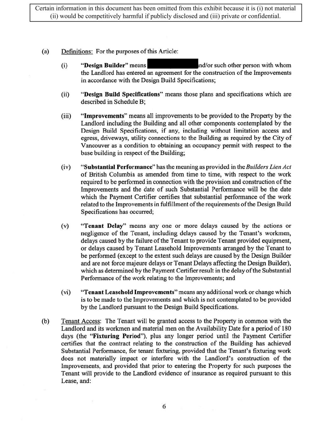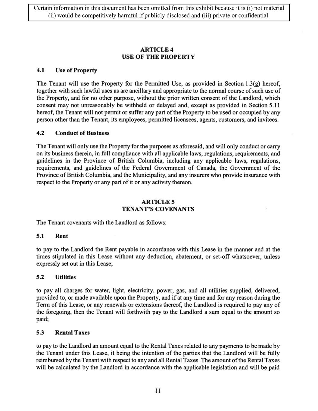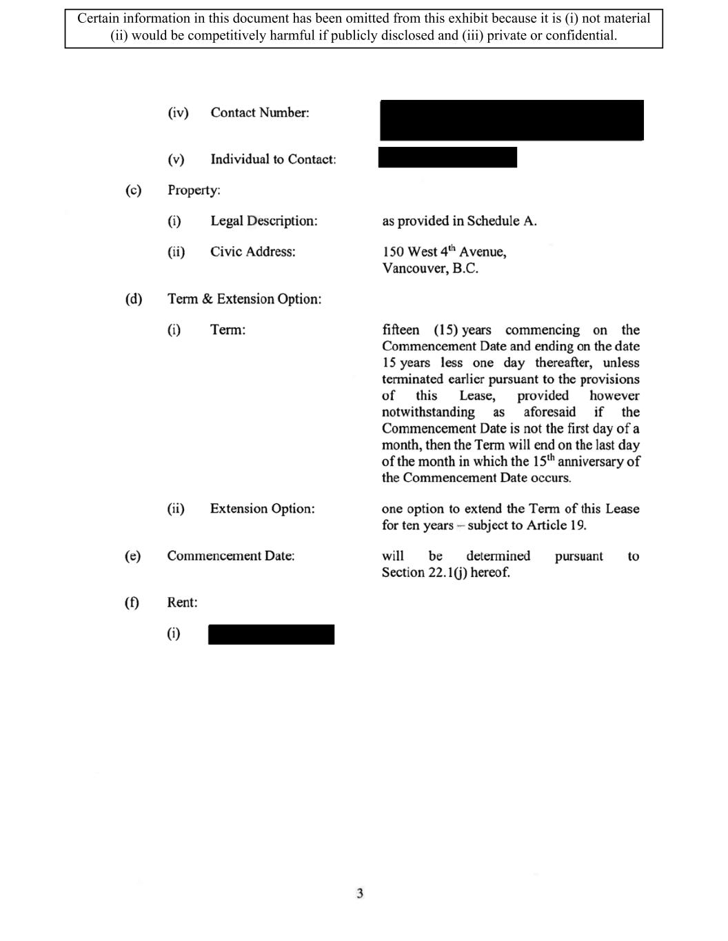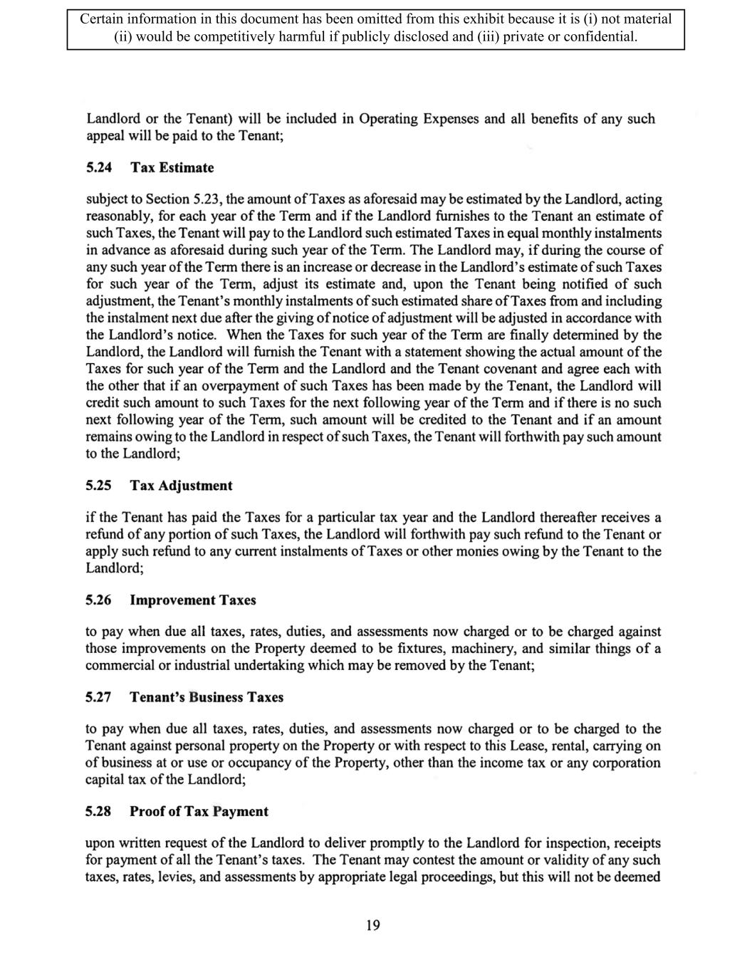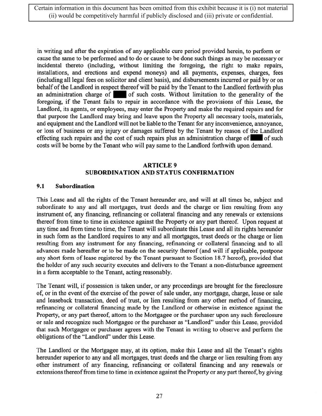 TABLE OF CONTENTS ARTICLE 1 GRANT AND BASIC TERMS .................................................................................. 1 1.1 Grant .................................................................................................................... 1 1.2 Reservation .......................................................................................................... 1 1.3 Basic Terms ......................................................................................................... 2 ARTICLE 2 PROVISION FOR IMPROVEMENTS TO LANDS AND TERM OF LEASE ........ 5 2.1 Obligations regarding construction of Improvements on the Lands and Condition of Property at Commencement of the Term ....................................... 5 2.2 State of Property .................................................................................................. 8 2.3 Construction Warranty ......................................................................................... 8 ARTICLE 3 BASIC ANNUAL RENT AND ADDITIONAL RENT ............................................ 9 3.1 Rent ...................................................................................................................... 9 3.2 Additional Rent. ................................................................................................... 9 3.3 No Deductions ..................................................................................................... 9 3.4 Net Lease ........................................................................................................... 10 3.5 Interest ............................................................................................................... 10 3.6 Electronic Funds Transfer .................................................................................. 10 ARTICLE 4 USE OF THE PROPERTY ....................................................................................... 11 4.1 Use of Property .................................................................................................. 11 4.2 Conduct of Business .......................................................................................... 11 ARTICLE 5 TENANT'S COVENANTS ...................................................................................... 11 5.1 Rent .................................................................................................................... 11 5.2 Utilities .............................................................................................................. 11 5.3 Rental Taxes ...................................................................................................... 11 5.4 Repairs ............................................................................................................... 12 5.5 View Repairs ..................................................................................................... 12 5.6 Make Repairs ..................................................................................................... 12 5.7 Condition at Lease End ...................................................................................... 12 5.8 Glass .................................................................................................................. 13 5.9 Overload ............................................................................................................ 13 5.10 Nuisance ............................................................................................................ 13 5.11 Assignment, Subletting, and Change in Control ............................................... 13 5.12 Bylaws ............................................................................................................... 15 5.13 Tenant Insurance ................................................................................................ 15 5 .14 Blanket Insurance .............................................................................................. 16 5.15 Landlord Insurance ............................................................................................ 16 Certain information in this document has been omitted from this exhibit because it is (i) not material (ii) would be competitively harmful if publicly disclosed and (iii) private or confidential.