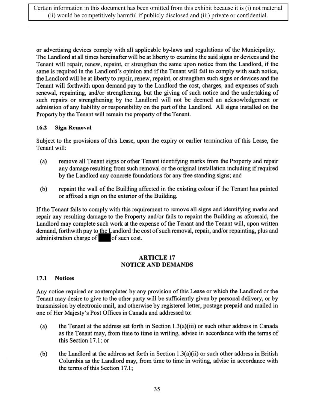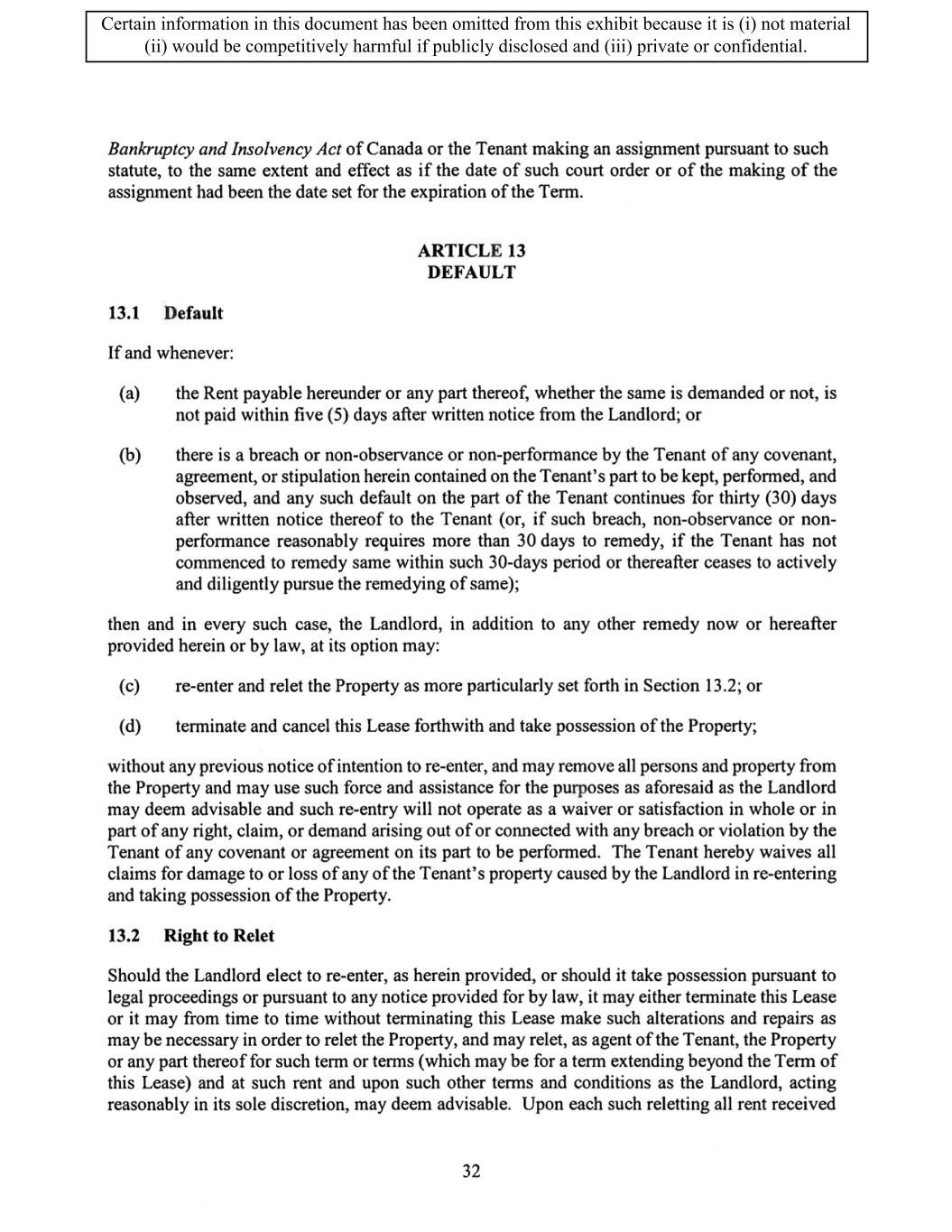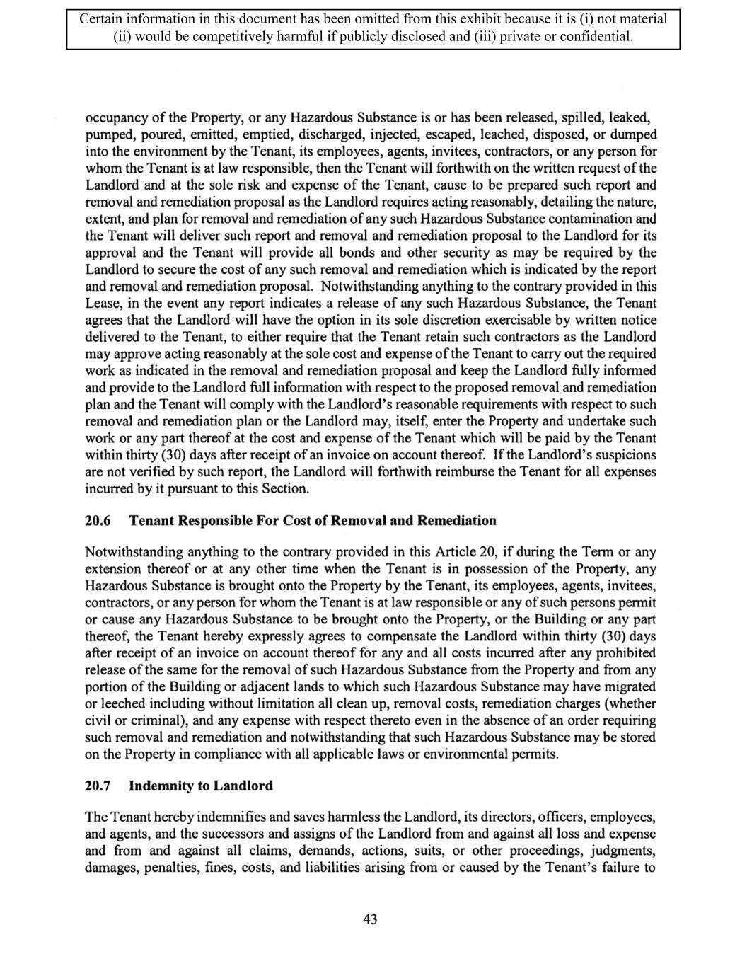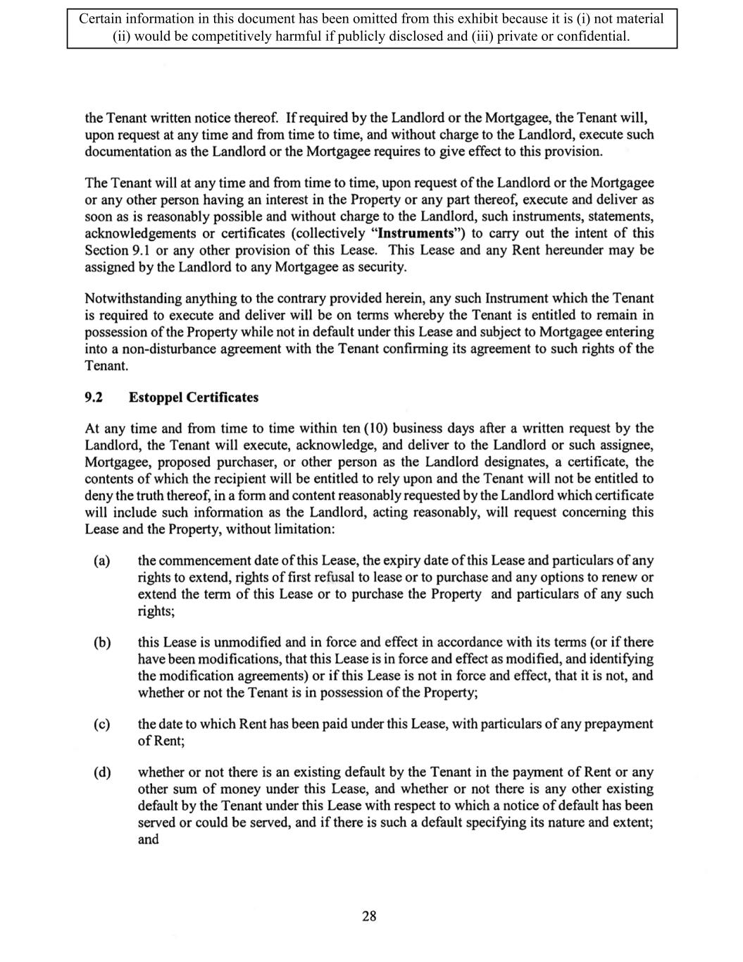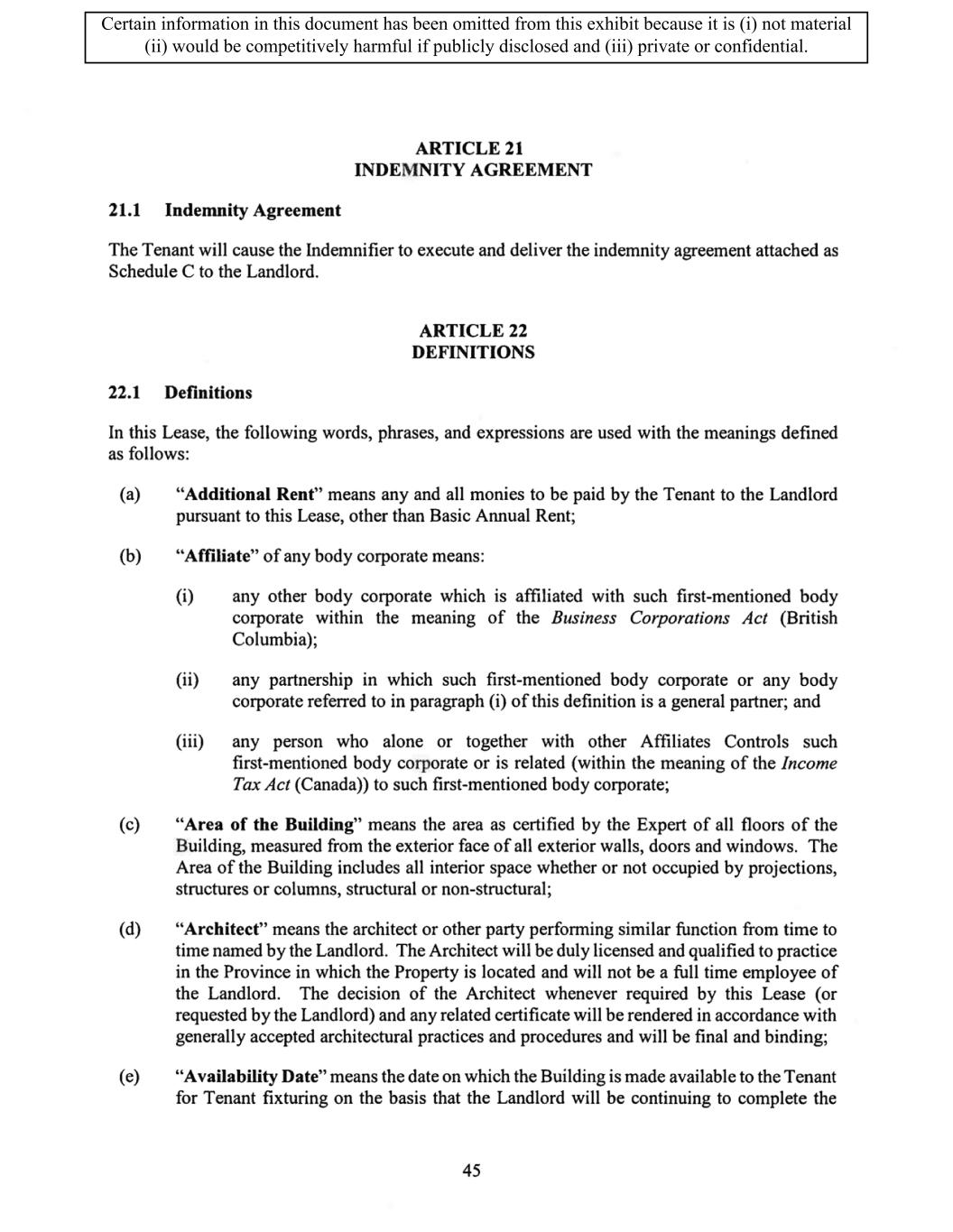TABLE OF CONTENTS ARTICLE 1 GRANT AND BASIC TERMS .................................................................................. 1 1.1 Grant .................................................................................................................... 1 1.2 Reservation .......................................................................................................... 1 1.3 Basic Terms ......................................................................................................... 2 ARTICLE 2 PROVISION FOR IMPROVEMENTS TO LANDS AND TERM OF LEASE ........ 5 2.1 Obligations regarding construction of Improvements on the Lands and Condition of Property at Commencement of the Term ....................................... 5 2.2 State of Property .................................................................................................. 8 2.3 Construction Warranty ......................................................................................... 8 ARTICLE 3 BASIC ANNUAL RENT AND ADDITIONAL RENT ............................................ 9 3.1 Rent ...................................................................................................................... 9 3.2 Additional Rent. ................................................................................................... 9 3.3 No Deductions ..................................................................................................... 9 3.4 Net Lease ........................................................................................................... 10 3.5 Interest ............................................................................................................... 10 3.6 Electronic Funds Transfer .................................................................................. 10 ARTICLE 4 USE OF THE PROPERTY ....................................................................................... 11 4.1 Use of Property .................................................................................................. 11 4.2 Conduct of Business .......................................................................................... 11 ARTICLE 5 TENANT'S COVENANTS ...................................................................................... 11 5.1 Rent .................................................................................................................... 11 5.2 Utilities .............................................................................................................. 11 5.3 Rental Taxes ...................................................................................................... 11 5.4 Repairs ............................................................................................................... 12 5.5 View Repairs ..................................................................................................... 12 5.6 Make Repairs ..................................................................................................... 12 5.7 Condition at Lease End ...................................................................................... 12 5.8 Glass .................................................................................................................. 13 5.9 Overload ............................................................................................................ 13 5.10 Nuisance ............................................................................................................ 13 5.11 Assignment, Subletting, and Change in Control ............................................... 13 5.12 Bylaws ............................................................................................................... 15 5.13 Tenant Insurance ................................................................................................ 15 5 .14 Blanket Insurance .............................................................................................. 16 5.15 Landlord Insurance ............................................................................................ 16 Certain information in this document has been omitted from this exhibit because it is (i) not material (ii) would be competitively harmful if publicly disclosed and (iii) private or confidential.
