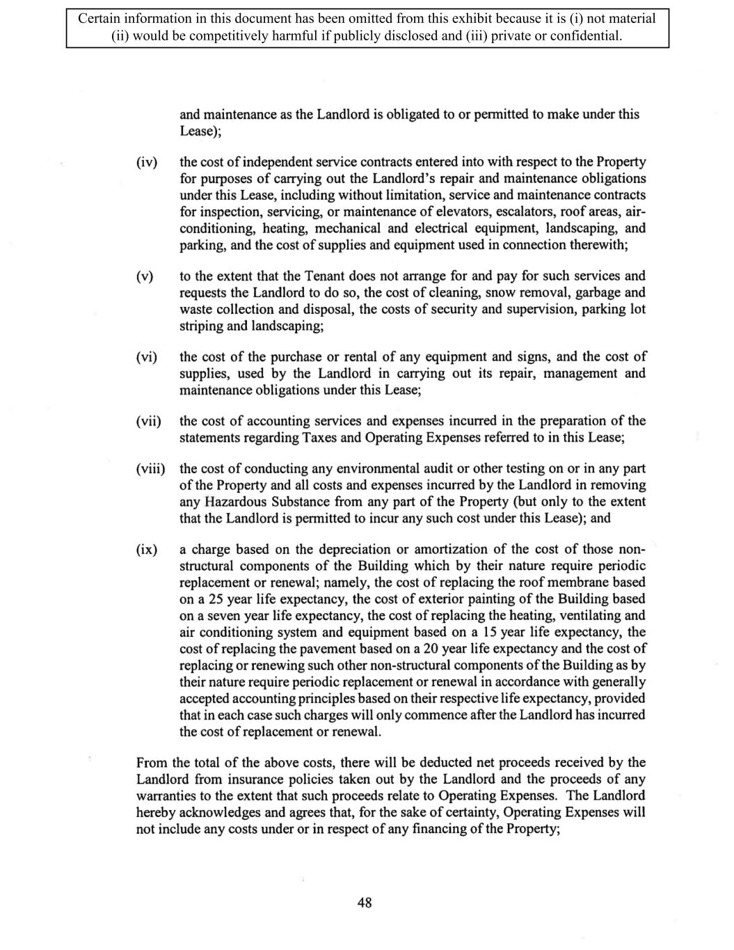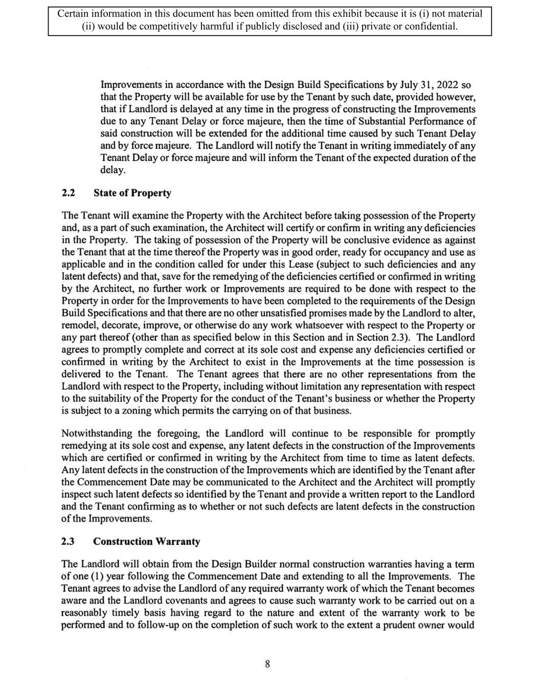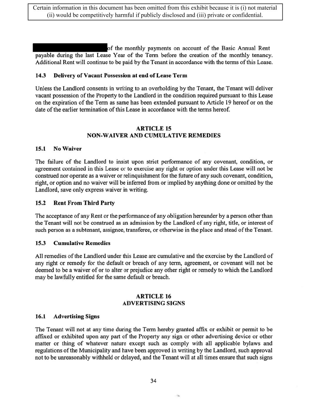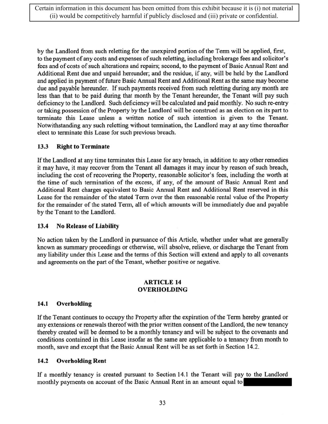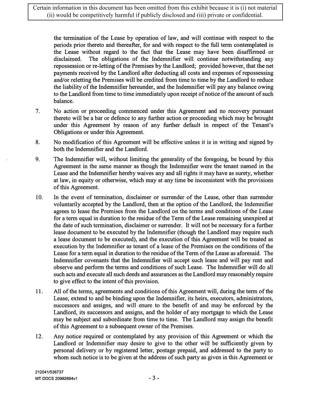 TABLE OF CONTENTS ARTICLE 1 GRANT AND BASIC TERMS .................................................................................. 1 1.1 Grant .................................................................................................................... 1 1.2 Reservation .......................................................................................................... 1 1.3 Basic Terms ......................................................................................................... 2 ARTICLE 2 PROVISION FOR IMPROVEMENTS TO LANDS AND TERM OF LEASE ........ 5 2.1 Obligations regarding construction of Improvements on the Lands and Condition of Property at Commencement of the Term ....................................... 5 2.2 State of Property .................................................................................................. 8 2.3 Construction Warranty ......................................................................................... 8 ARTICLE 3 BASIC ANNUAL RENT AND ADDITIONAL RENT ............................................ 9 3.1 Rent ...................................................................................................................... 9 3.2 Additional Rent. ................................................................................................... 9 3.3 No Deductions ..................................................................................................... 9 3.4 Net Lease ........................................................................................................... 10 3.5 Interest ............................................................................................................... 10 3.6 Electronic Funds Transfer .................................................................................. 10 ARTICLE 4 USE OF THE PROPERTY ....................................................................................... 11 4.1 Use of Property .................................................................................................. 11 4.2 Conduct of Business .......................................................................................... 11 ARTICLE 5 TENANT'S COVENANTS ...................................................................................... 11 5.1 Rent .................................................................................................................... 11 5.2 Utilities .............................................................................................................. 11 5.3 Rental Taxes ...................................................................................................... 11 5.4 Repairs ............................................................................................................... 12 5.5 View Repairs ..................................................................................................... 12 5.6 Make Repairs ..................................................................................................... 12 5.7 Condition at Lease End ...................................................................................... 12 5.8 Glass .................................................................................................................. 13 5.9 Overload ............................................................................................................ 13 5.10 Nuisance ............................................................................................................ 13 5.11 Assignment, Subletting, and Change in Control ............................................... 13 5.12 Bylaws ............................................................................................................... 15 5.13 Tenant Insurance ................................................................................................ 15 5 .14 Blanket Insurance .............................................................................................. 16 5.15 Landlord Insurance ............................................................................................ 16 Certain information in this document has been omitted from this exhibit because it is (i) not material (ii) would be competitively harmful if publicly disclosed and (iii) private or confidential.