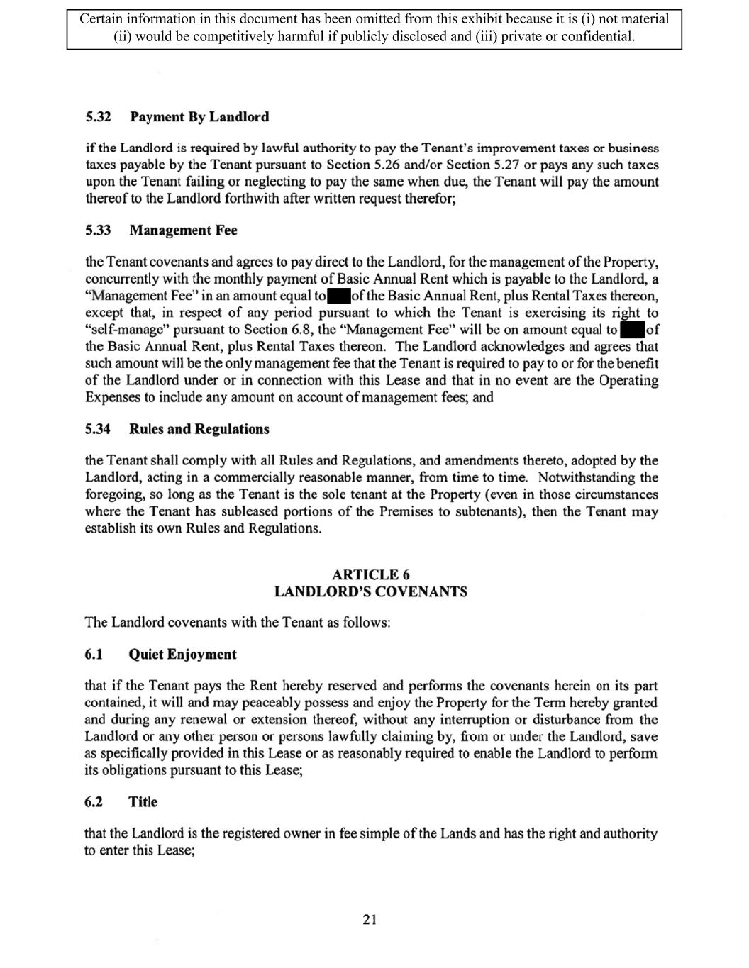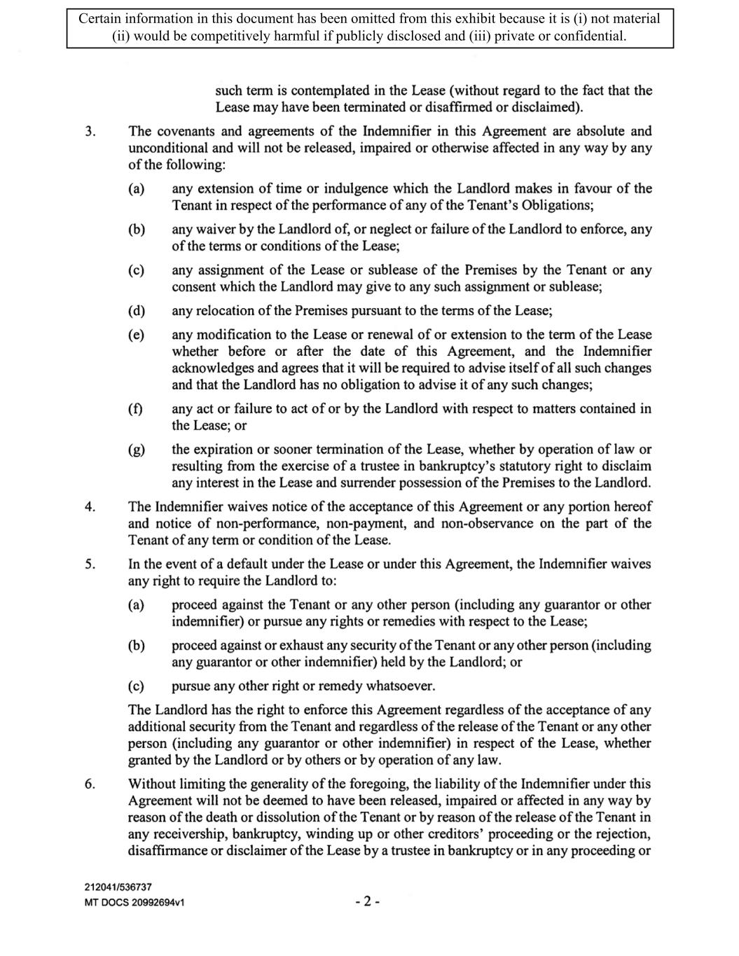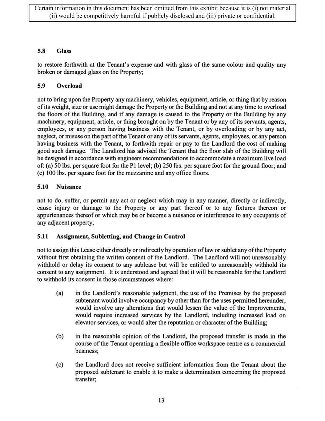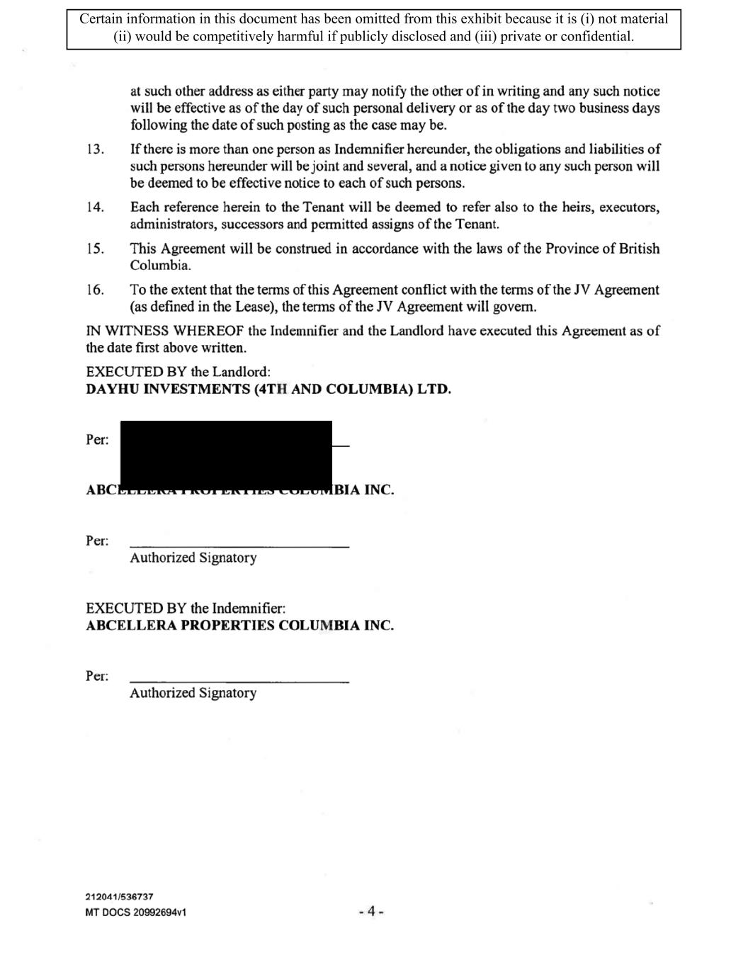 TABLE OF CONTENTS ARTICLE 1 GRANT AND BASIC TERMS .................................................................................. 1 1.1 Grant .................................................................................................................... 1 1.2 Reservation .......................................................................................................... 1 1.3 Basic Terms ......................................................................................................... 2 ARTICLE 2 PROVISION FOR IMPROVEMENTS TO LANDS AND TERM OF LEASE ........ 5 2.1 Obligations regarding construction of Improvements on the Lands and Condition of Property at Commencement of the Term ....................................... 5 2.2 State of Property .................................................................................................. 8 2.3 Construction Warranty ......................................................................................... 8 ARTICLE 3 BASIC ANNUAL RENT AND ADDITIONAL RENT ............................................ 9 3.1 Rent ...................................................................................................................... 9 3.2 Additional Rent. ................................................................................................... 9 3.3 No Deductions ..................................................................................................... 9 3.4 Net Lease ........................................................................................................... 10 3.5 Interest ............................................................................................................... 10 3.6 Electronic Funds Transfer .................................................................................. 10 ARTICLE 4 USE OF THE PROPERTY ....................................................................................... 11 4.1 Use of Property .................................................................................................. 11 4.2 Conduct of Business .......................................................................................... 11 ARTICLE 5 TENANT'S COVENANTS ...................................................................................... 11 5.1 Rent .................................................................................................................... 11 5.2 Utilities .............................................................................................................. 11 5.3 Rental Taxes ...................................................................................................... 11 5.4 Repairs ............................................................................................................... 12 5.5 View Repairs ..................................................................................................... 12 5.6 Make Repairs ..................................................................................................... 12 5.7 Condition at Lease End ...................................................................................... 12 5.8 Glass .................................................................................................................. 13 5.9 Overload ............................................................................................................ 13 5.10 Nuisance ............................................................................................................ 13 5.11 Assignment, Subletting, and Change in Control ............................................... 13 5.12 Bylaws ............................................................................................................... 15 5.13 Tenant Insurance ................................................................................................ 15 5 .14 Blanket Insurance .............................................................................................. 16 5.15 Landlord Insurance ............................................................................................ 16 Certain information in this document has been omitted from this exhibit because it is (i) not material (ii) would be competitively harmful if publicly disclosed and (iii) private or confidential.