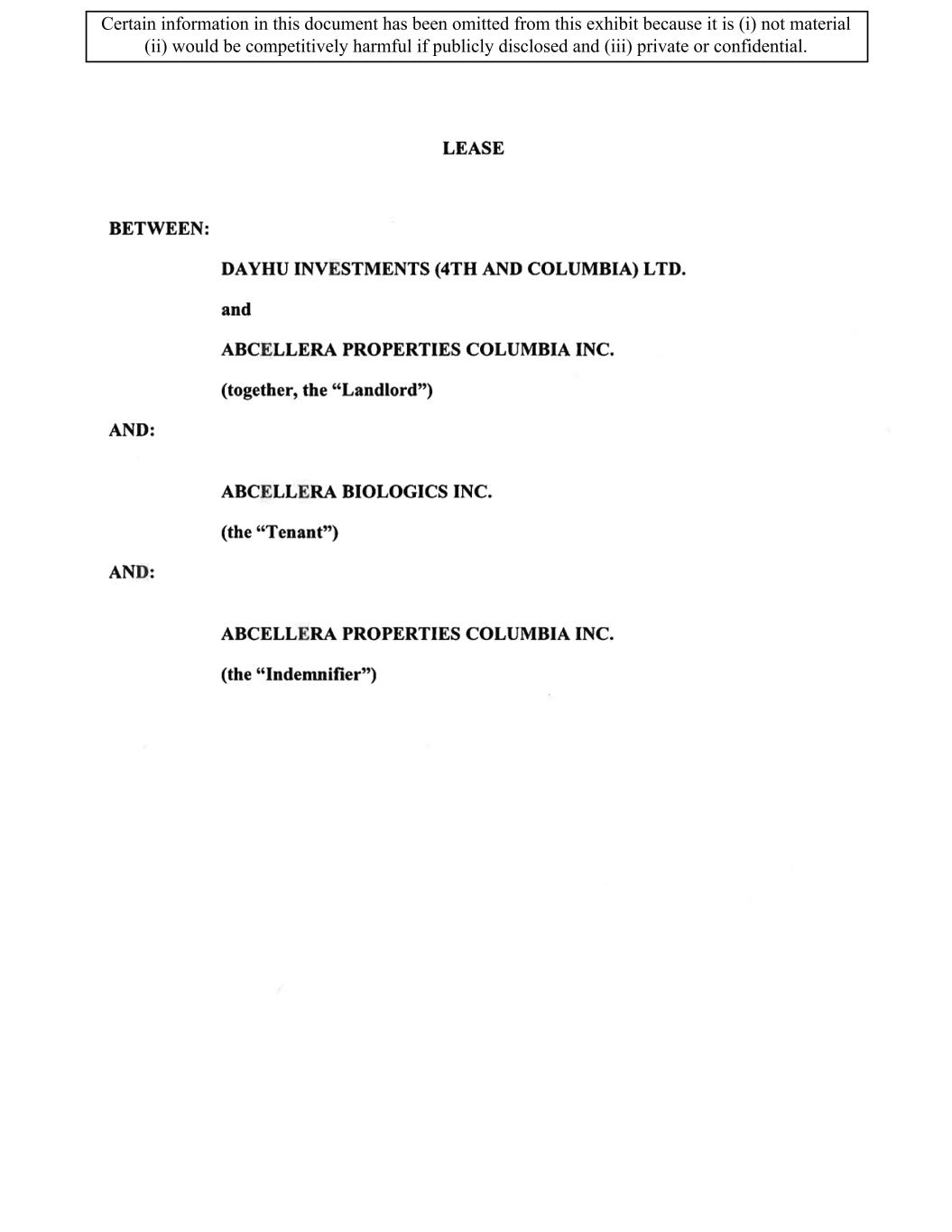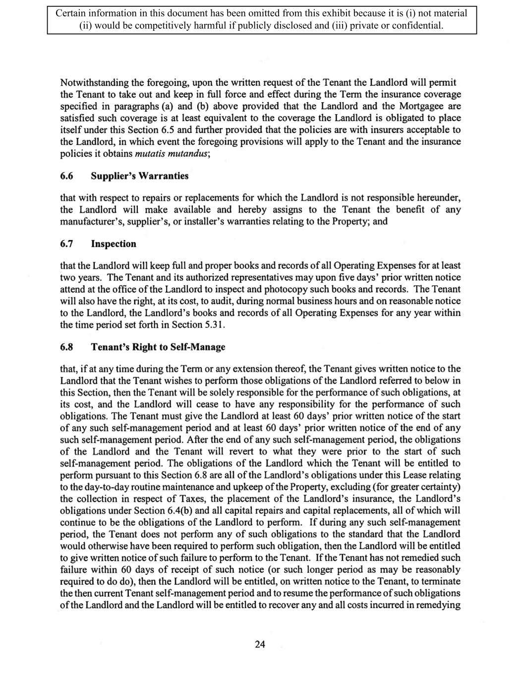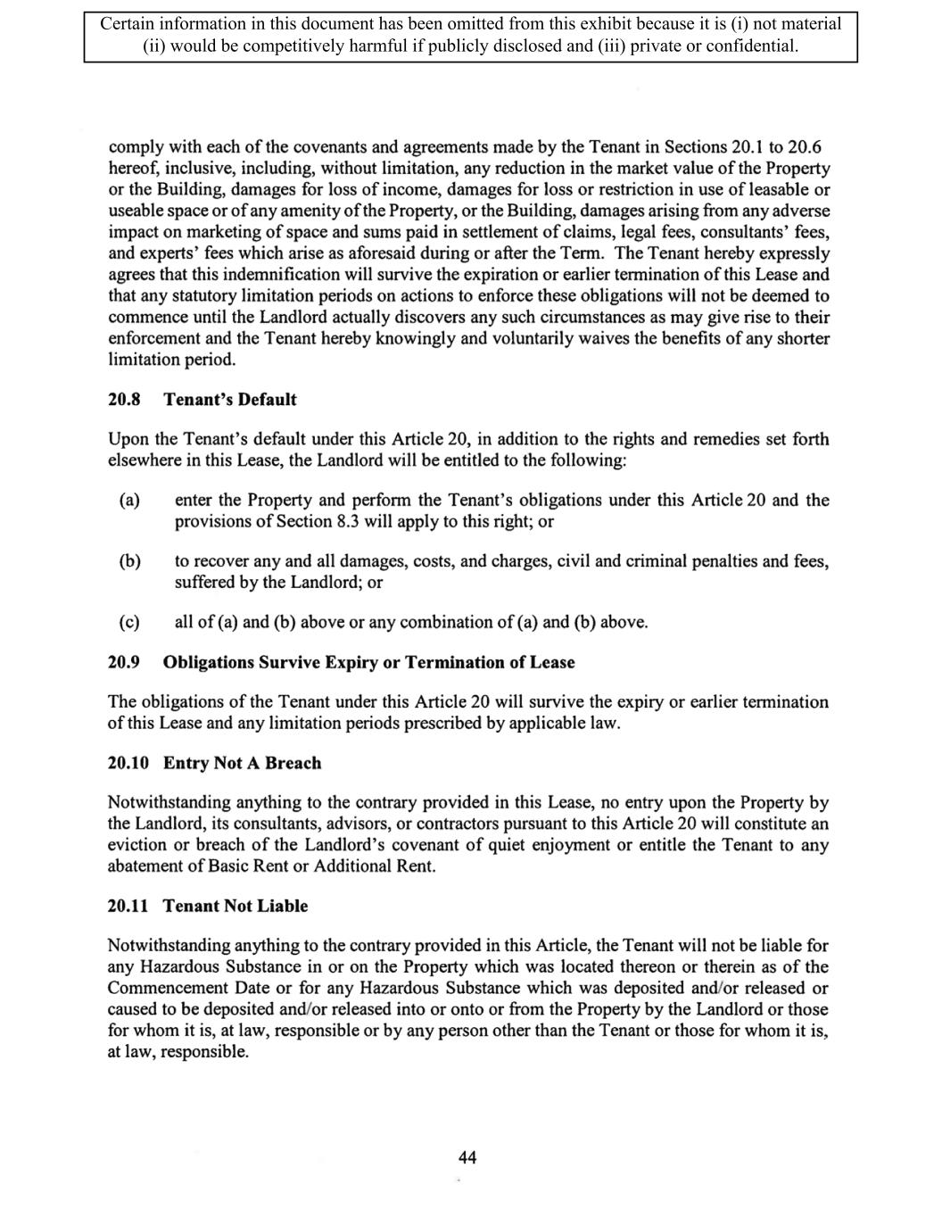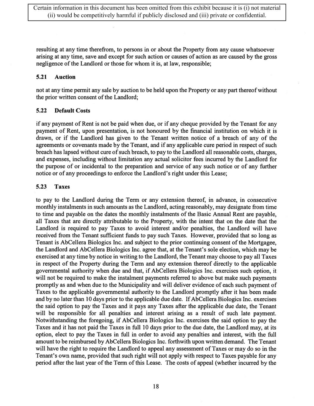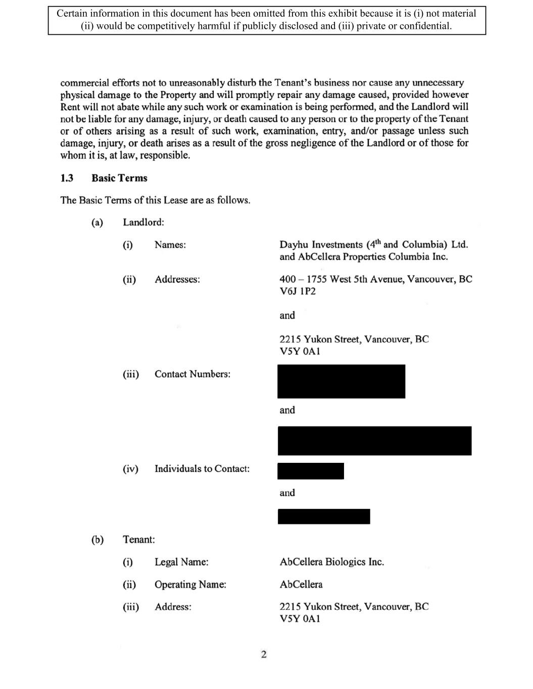 TABLE OF CONTENTS ARTICLE 1 GRANT AND BASIC TERMS .................................................................................. 1 1.1 Grant .................................................................................................................... 1 1.2 Reservation .......................................................................................................... 1 1.3 Basic Terms ......................................................................................................... 2 ARTICLE 2 PROVISION FOR IMPROVEMENTS TO LANDS AND TERM OF LEASE ........ 5 2.1 Obligations regarding construction of Improvements on the Lands and Condition of Property at Commencement of the Term ....................................... 5 2.2 State of Property .................................................................................................. 8 2.3 Construction Warranty ......................................................................................... 8 ARTICLE 3 BASIC ANNUAL RENT AND ADDITIONAL RENT ............................................ 9 3.1 Rent ...................................................................................................................... 9 3.2 Additional Rent. ................................................................................................... 9 3.3 No Deductions ..................................................................................................... 9 3.4 Net Lease ........................................................................................................... 10 3.5 Interest ............................................................................................................... 10 3.6 Electronic Funds Transfer .................................................................................. 10 ARTICLE 4 USE OF THE PROPERTY ....................................................................................... 11 4.1 Use of Property .................................................................................................. 11 4.2 Conduct of Business .......................................................................................... 11 ARTICLE 5 TENANT'S COVENANTS ...................................................................................... 11 5.1 Rent .................................................................................................................... 11 5.2 Utilities .............................................................................................................. 11 5.3 Rental Taxes ...................................................................................................... 11 5.4 Repairs ............................................................................................................... 12 5.5 View Repairs ..................................................................................................... 12 5.6 Make Repairs ..................................................................................................... 12 5.7 Condition at Lease End ...................................................................................... 12 5.8 Glass .................................................................................................................. 13 5.9 Overload ............................................................................................................ 13 5.10 Nuisance ............................................................................................................ 13 5.11 Assignment, Subletting, and Change in Control ............................................... 13 5.12 Bylaws ............................................................................................................... 15 5.13 Tenant Insurance ................................................................................................ 15 5 .14 Blanket Insurance .............................................................................................. 16 5.15 Landlord Insurance ............................................................................................ 16 Certain information in this document has been omitted from this exhibit because it is (i) not material (ii) would be competitively harmful if publicly disclosed and (iii) private or confidential.
