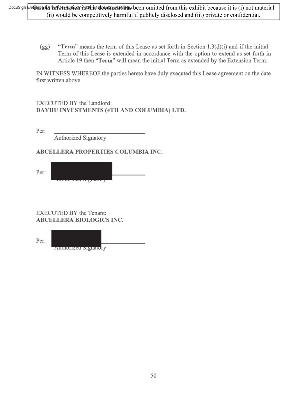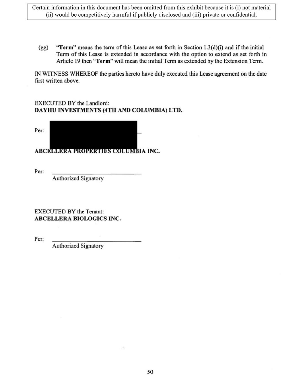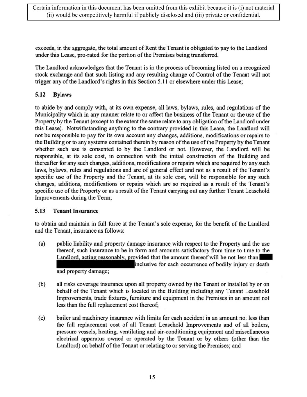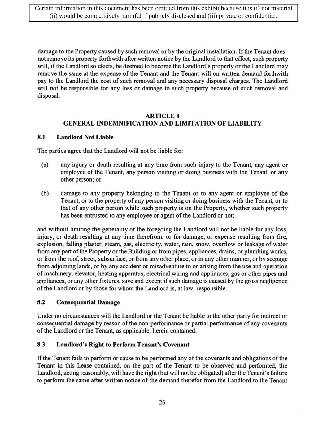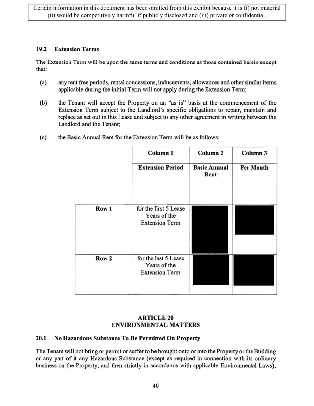 TABLE OF CONTENTS ARTICLE 1 GRANT AND BASIC TERMS .................................................................................. 1 1.1 Grant .................................................................................................................... 1 1.2 Reservation .......................................................................................................... 1 1.3 Basic Terms ......................................................................................................... 2 ARTICLE 2 PROVISION FOR IMPROVEMENTS TO LANDS AND TERM OF LEASE ........ 5 2.1 Obligations regarding construction of Improvements on the Lands and Condition of Property at Commencement of the Term ....................................... 5 2.2 State of Property .................................................................................................. 8 2.3 Construction Warranty ......................................................................................... 8 ARTICLE 3 BASIC ANNUAL RENT AND ADDITIONAL RENT ............................................ 9 3.1 Rent ...................................................................................................................... 9 3.2 Additional Rent. ................................................................................................... 9 3.3 No Deductions ..................................................................................................... 9 3.4 Net Lease ........................................................................................................... 10 3.5 Interest ............................................................................................................... 10 3.6 Electronic Funds Transfer .................................................................................. 10 ARTICLE 4 USE OF THE PROPERTY ....................................................................................... 11 4.1 Use of Property .................................................................................................. 11 4.2 Conduct of Business .......................................................................................... 11 ARTICLE 5 TENANT'S COVENANTS ...................................................................................... 11 5.1 Rent .................................................................................................................... 11 5.2 Utilities .............................................................................................................. 11 5.3 Rental Taxes ...................................................................................................... 11 5.4 Repairs ............................................................................................................... 12 5.5 View Repairs ..................................................................................................... 12 5.6 Make Repairs ..................................................................................................... 12 5.7 Condition at Lease End ...................................................................................... 12 5.8 Glass .................................................................................................................. 13 5.9 Overload ............................................................................................................ 13 5.10 Nuisance ............................................................................................................ 13 5.11 Assignment, Subletting, and Change in Control ............................................... 13 5.12 Bylaws ............................................................................................................... 15 5.13 Tenant Insurance ................................................................................................ 15 5 .14 Blanket Insurance .............................................................................................. 16 5.15 Landlord Insurance ............................................................................................ 16 Certain information in this document has been omitted from this exhibit because it is (i) not material (ii) would be competitively harmful if publicly disclosed and (iii) private or confidential.