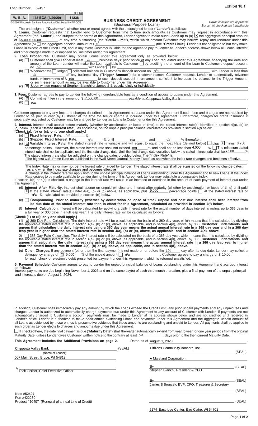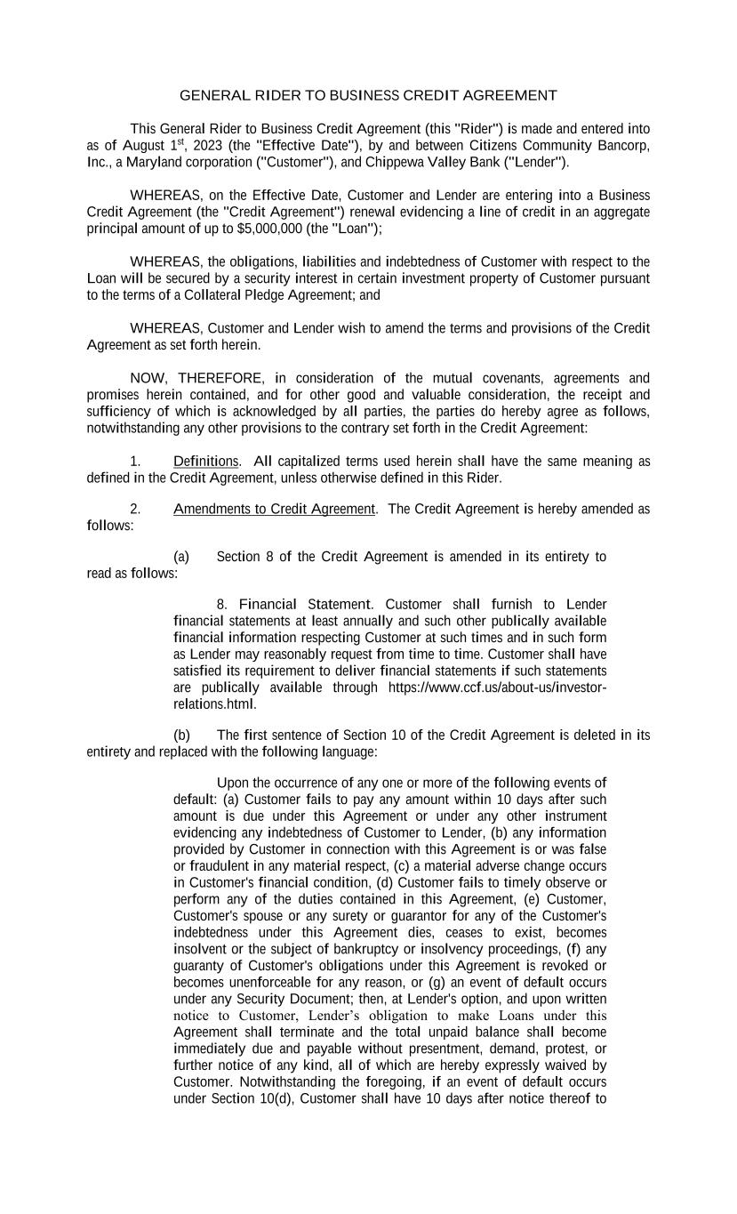GENERAL RIDER TO BUSINESS CREDIT AGREEMENT This General Rider to Business Credit Agreement (this "Rider") is made and entered into as of August 1st, 2023 (the "Effective Date"), by and between Citizens Community Bancorp, Inc., a Maryland corporation ("Customer"), and Chippewa Valley Bank ("Lender"). WHEREAS, on the Effective Date, Customer and Lender are entering into a Business Credit Agreement (the "Credit Agreement") renewal evidencing a line of credit in an aggregate principal amount of up to $5,000,000 (the "Loan"); WHEREAS, the obligations, liabilities and indebtedness of Customer with respect to the Loan will be secured by a security interest in certain investment property of Customer pursuant to the terms of a Collateral Pledge Agreement; and WHEREAS, Customer and Lender wish to amend the terms and provisions of the Credit Agreement as set forth herein. NOW, THEREFORE, in consideration of the mutual covenants, agreements and promises herein contained, and for other good and valuable consideration, the receipt and sufficiency of which is acknowledged by all parties, the parties do hereby agree as follows, notwithstanding any other provisions to the contrary set forth in the Credit Agreement: 1. Definitions. All capitalized terms used herein shall have the same meaning as defined in the Credit Agreement, unless otherwise defined in this Rider. 2. Amendments to Credit Agreement. The Credit Agreement is hereby amended as follows: (a) Section 8 of the Credit Agreement is amended in its entirety to read as follows: 8. Financial Statement. Customer shall furnish to Lender financial statements at least annually and such other publically available financial information respecting Customer at such times and in such form as Lender may reasonably request from time to time. Customer shall have satisfied its requirement to deliver financial statements if such statements are publically available through https://www.ccf.us/about-us/investor- relations.html. (b) The first sentence of Section 10 of the Credit Agreement is deleted in its entirety and replaced with the following language: Upon the occurrence of any one or more of the following events of default: (a) Customer fails to pay any amount within 10 days after such amount is due under this Agreement or under any other instrument evidencing any indebtedness of Customer to Lender, (b) any information provided by Customer in connection with this Agreement is or was false or fraudulent in any material respect, (c) a material adverse change occurs in Customer's financial condition, (d) Customer fails to timely observe or perform any of the duties contained in this Agreement, (e) Customer, Customer's spouse or any surety or guarantor for any of the Customer's indebtedness under this Agreement dies, ceases to exist, becomes insolvent or the subject of bankruptcy or insolvency proceedings, (f) any guaranty of Customer's obligations under this Agreement is revoked or becomes unenforceable for any reason, or (g) an event of default occurs under any Security Document; then, at Lender's option, and upon written notice to Customer, Lender’s obligation to make Loans under this Agreement shall terminate and the total unpaid balance shall become immediately due and payable without presentment, demand, protest, or further notice of any kind, all of which are hereby expressly waived by Customer. Notwithstanding the foregoing, if an event of default occurs under Section 10(d), Customer shall have 10 days after notice thereof to