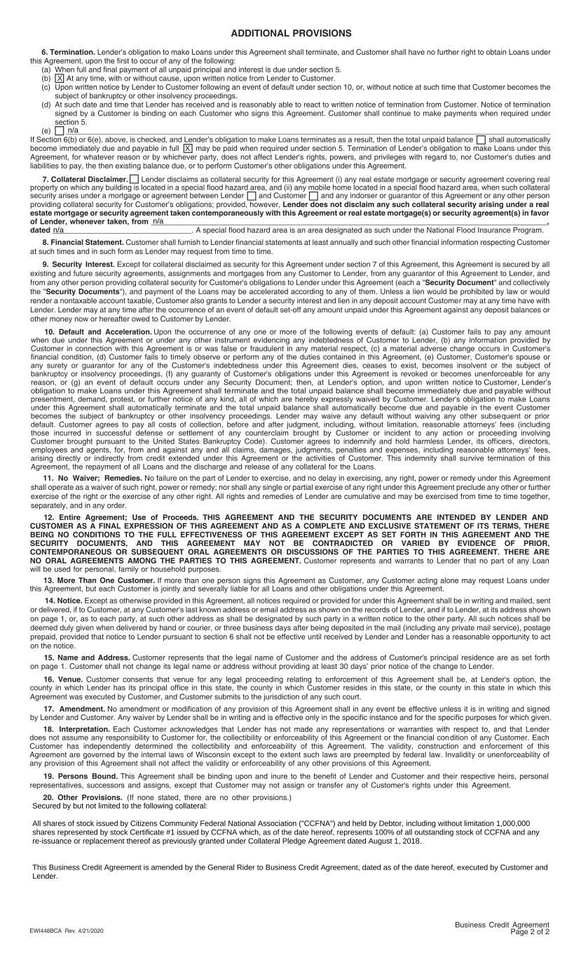 PROVISIONSADDITIONAL Customer consents that venue for any legal proceeding relating to enforcement of this Agreement shall be, at Lender's option, the16. Venue. Upon the occurrence of any one or more of the following events of default: (a) Customer fails to pay any amount10. Default and Acceleration. when due under this Agreement or under any other instrument evidencing any indebtedness of Customer to Lender, (b) any information provided by Customer in connection with this Agreement is or was false or fraudulent in any material respect, (c) a material adverse change occurs in Customer's orfinancial condition, (d) Customer fails to timely observe or perform any of the duties contained in this Agreement, (e) Customer, Customer's spouse ofany surety or guarantor for any of the Customer's indebtedness under this Agreement dies, ceases to exist, becomes insolvent or the subject anybankruptcy or insolvency proceedings, (f) any guaranty of Customer's obligations under this Agreement is revoked or becomes unenforceable for reason, or (g) an event of default occurs under any Security Document; then, at Lender's option, and upon written notice to Customer, Lender’s obligation to make Loans under this Agreement shall terminate and the total unpaid balance shall become immediately due and payable without Loanspresentment, demand, protest, or further notice of any kind, all of which are hereby expressly waived by Customer. Lender's obligation to make Customerunder this Agreement shall automatically terminate and the total unpaid balance shall automatically become due and payable in the event priorbecomes the subject of bankruptcy or other insolvency proceedings. Lender may waive any default without waiving any other subsequent or (includingdefault. Customer agrees to pay all costs of collection, before and after judgment, including, without limitation, reasonable attorneys' fees involvingthose incurred in successful defense or settlement of any counterclaim brought by Customer or incident to any action or proceeding directors,Customer brought pursuant to the United States Bankruptcy Code). Customer agrees to indemnify and hold harmless Lender, its officers, fees,employees and agents, for, from and against any and all claims, damages, judgments, penalties and expenses, including reasonable attorneys' thisarising directly or indirectly from credit extended under this Agreement or the activities of Customer. This indemnity shall survive termination of Loans.Agreement, the repayment of all Loans and the discharge and release of any collateral for the No amendment or modification of any provision of this Agreement shall in any event be effective unless it is in writing and signed17. Amendment. by Lender and Customer. Any waiver by Lender shall be in writing and is effective only in the specific instance and for the specific purposes for which given. THIS AGREEMENT AND THE SECURITY DOCUMENTS ARE INTENDED BY LENDER AND12. Entire Agreement; Use of Proceeds. CUSTOMER AS A FINAL EXPRESSION OF THIS AGREEMENT AND AS A COMPLETE AND EXCLUSIVE STATEMENT OF ITS TERMS, THERE BEING NO CONDITIONS TO THE FULL EFFECTIVENESS OF THIS AGREEMENT EXCEPT AS SET FORTH IN THIS AGREEMENT AND THE SECURITY DOCUMENTS, AND THIS AGREEMENT MAY NOT BE CONTRADICTED OR VARIED BY EVIDENCE OF PRIOR, CONTEMPORANEOUS OR SUBSEQUENT ORAL AGREEMENTS OR DISCUSSIONS OF THE PARTIES TO THIS AGREEMENT. THERE ARE Customer represents and warrants to Lender that no part of any LoanNO ORAL AGREEMENTS AMONG THE PARTIES TO THIS AGREEMENT. will be used for personal, family or household purposes. If more than one person signs this Agreement as Customer, any Customer acting alone may request Loans under13. More Than One Customer. this Agreement, but each Customer is jointly and severally liable for all Loans and other obligations under this Agreement. Customer represents that the legal name of Customer and the address of Customer's principal residence are as set forth15. Name and Address. on page 1. Customer shall not change its legal name or address without providing at least 30 days’ prior notice of the change to Lender. Each Customer acknowledges that Lender has not made any representations or warranties with respect to, and that Lender18. Interpretation. does not assume any responsibility to Customer for, the collectibility or enforceability of this Agreement or the financial condition of any Customer. Each Customer has independently determined the collectibility and enforceability of this Agreement. The validity, construction and enforcement of this Agreement are governed by the internal laws of Wisconsin except to the extent such laws are preempted by federal law. Invalidity or unenforceability of any provision of this Agreement shall not affect the validity or enforceability of any other provisions of this Agreement. provisions.)(If none stated, there are no other Provisions.20. Other This Agreement shall be binding upon and inure to the benefit of Lender and Customer and their respective heirs, personal19. Persons Bound. under this Agreement. representatives, successors and assigns, except that Customer may not assign or transfer any of Customer's rights Business Credit Agreement Page 2 of 2EWI448BCA Rev. 4/21/2020 7. Collateral Disclaimer. Lender disclaims as collateral security for this Agreement (i) any real estate mortgage or security agreement covering real property on which any building is located in a special flood hazard area, and (ii) any mobile home located in a special flood hazard area, when such collateral security arises under a mortgage or agreement between Lender and Customer and any indorser or guarantor of this Agreement or any other person 8. Financial Statement. Customer shall furnish to Lender financial statements at least annually and such other financial information respecting Customer at such times and in such form as Lender may request from time to time. 9. Security Interest. Except for collateral disclaimed as security fo