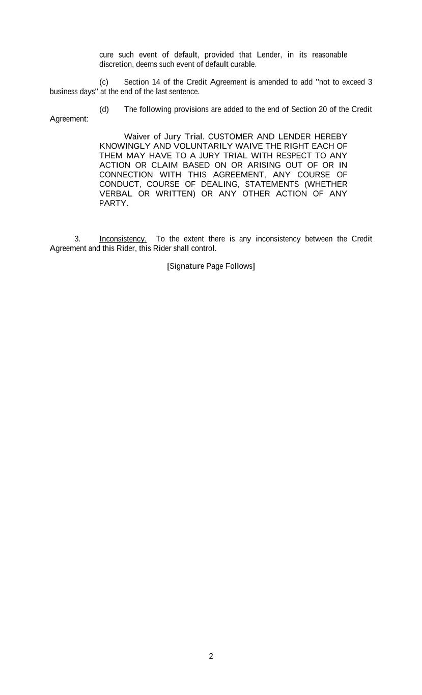 2 cure such event of default, provided that Lender, in its reasonable discretion, deems such event of default curable. (c) Section 14 of the Credit Agreement is amended to add "not to exceed 3 business days" at the end of the last sentence. (d) The following provisions are added to the end of Section 20 of the Credit Agreement: Waiver of Jury Trial. CUSTOMER AND LENDER HEREBY KNOWINGLY AND VOLUNTARILY WAIVE THE RIGHT EACH OF THEM MAY HAVE TO A JURY TRIAL WITH RESPECT TO ANY ACTION OR CLAIM BASED ON OR ARISING OUT OF OR IN CONNECTION WITH THIS AGREEMENT, ANY COURSE OF CONDUCT, COURSE OF DEALING, STATEMENTS (WHETHER VERBAL OR WRITTEN) OR ANY OTHER ACTION OF ANY PARTY. 3. Inconsistency. To the extent there is any inconsistency between the Credit Agreement and this Rider, this Rider shall control. [Signature Page Follows]