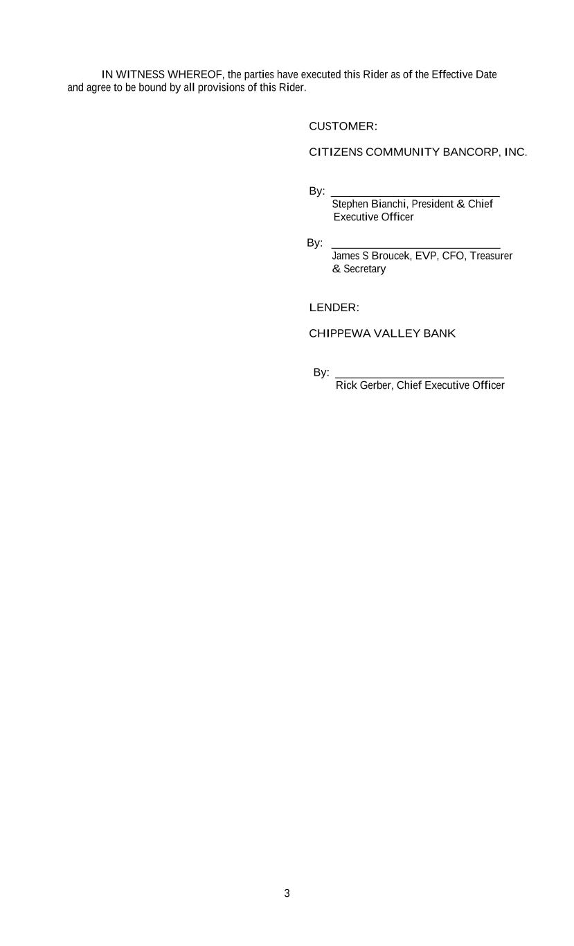 3 IN WITNESS WHEREOF, the parties have executed this Rider as of the Effective Date and agree to be bound by all provisions of this Rider. CUSTOMER: CITIZENS COMMUNITY BANCORP, INC. By: ______________________________ Stephen Bianchi, President & Chief Executive Officer By: ______________________________ James S Broucek, EVP, CFO, Treasurer & Secretary LENDER: CHIPPEWA VALLEY BANK By: ______________________________ Rick Gerber, Chief Executive Officer