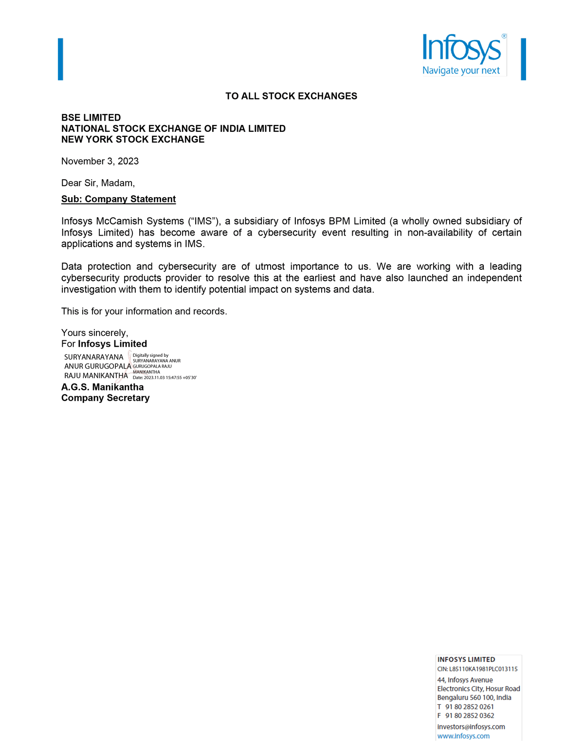 A copy of the intimation as disseminated by Infosys Limited to the stock exchanges in this regard is attached to this Form 6-K as Exhibit 99.1.