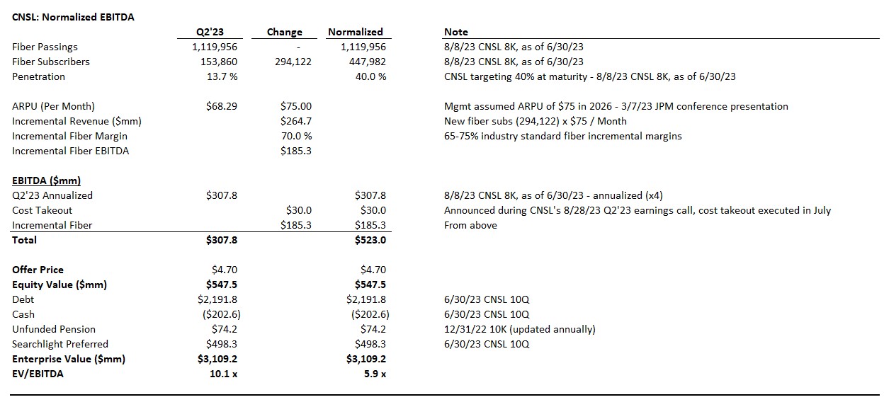 As management stated on the second quarter 2023 earnings call, EBITDA and margins are expected to improve beginning in the second half of 2023.5 Accounting for the maturation of just the current fiber passings already built to 40% penetration and the actions taken by the Company in July 2023 to drive $30 million in annualized cost savings, we believe CNSL’s normalized EBITDA should be approximately $520 million, or ~70% higher than its run-rate in the second quarter of 2023. At a purchase price of $4.70 per share, CNSL is valued at approximately six times normalized EBITDA.6 Mature fiber and cable assets have historically been acquired by strategic or financial sponsors at implied valuations of between 10 to 15 times EBITDA.7 We believe that the vast majority of CNSL’s normalized EBITDA is residential fiber-to-the-home or commercial fiber, not legacy voice.