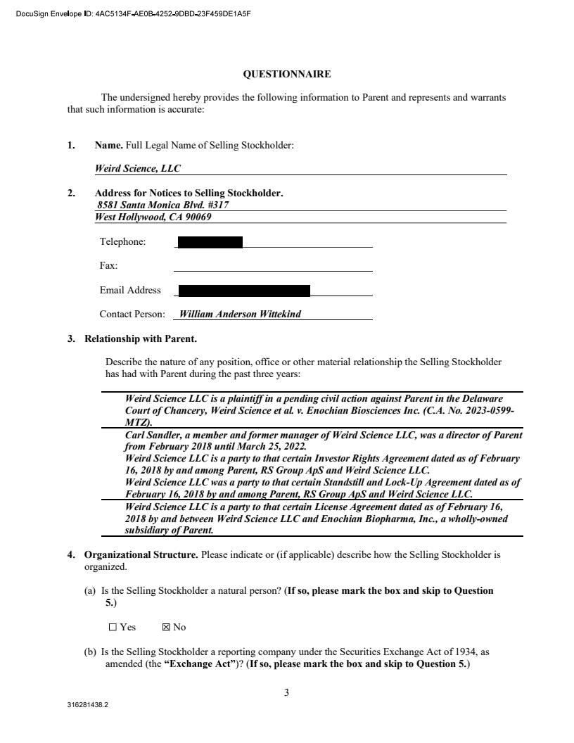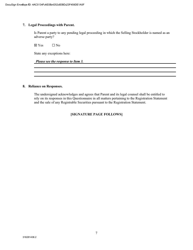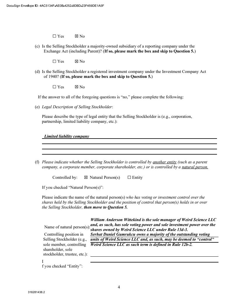 Similarly, if the Issuer continues to take the position that Wittekind and the Trusts are not entitled to the registration rights under the Investor Rights Agreement and/or the Delaware Court of Chancery rejects specific performance and/or declaratory relief on this issue, the Reporting Person may, in his capacity as attorney-in-fact under a power of attorney dated June 24, 2022 (see Exhibit 9 to Amendment No. 10), cause all or any portion of Gumrukcu’s 12,438,431 shares of Common Stock to be transferred to Weird Science for the purpose of enabling Weird Science to avail itself of the registration rights as a “Stockholder” (as defined in the Investor Rights Agreement) with respect to the shares of Common Stock so transferred to Weird Science (and any other shares of Common Stock held by Weird Science that were issued under the Merger Agreement) to the fullest extent provided under the Investor Rights Agreement. Since the shares of Common Stock owned by Gumrukcu are currently subject to a writ of attachment issued by the Vermont District Court, any such transfer would require advance relief from the Vermont District Court.
