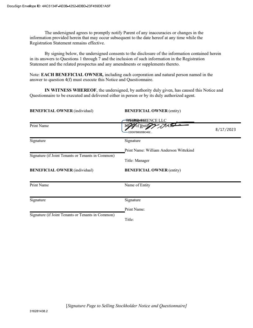 1 Consists of (a) 3,615,757 shares owned by William Anderson Wittekind (“Wittekind”); (b) 1,313,499 shares owned by Weird Science LLC (“Weird Science”); (c) 633,921 shares owned by the William Anderson Wittekind 2020 Annuity Trust, a grantor retained annuity trust of which Wittekind is the sole trustee (the “Wittekind 2020 Annuity Trust”); (d) 450,568 shares owned by the Dybul 2020 Angel Annuity Trust, a grantor retained trust of which Wittekind is the sole trustee (the “Dybul 2020 Annuity Trust”); (e) 50,000 shares owned by the Ty Mabry 2021 Annuity Trust, a grantor retained annuity trust of which Wittekind is sole trustee (the “Mabry 2021 Annuity Trust”); and (f) 366,079 shares owned by the William Anderson Wittekind 2021 Annuity Trust, a grantor retained annuity trust of which Wittekind is the sole trustee (the “Wittekind 2021 Annuity Trust” and, together with the Wittekind 2020 Annuity Trust, the Dybul 2020 Annuity Trust and the Mabry 2021 Annuity Trust, the “Trusts”). In his capacity as the sole manager of Weird Science, Wittekind has sole voting and sole dispositive power over the shares owned by Weird Science. In his capacity as the sole trustee of the Trusts, Wittekind has sole voting power and sole dispositive power over the shares owned by the Trusts.