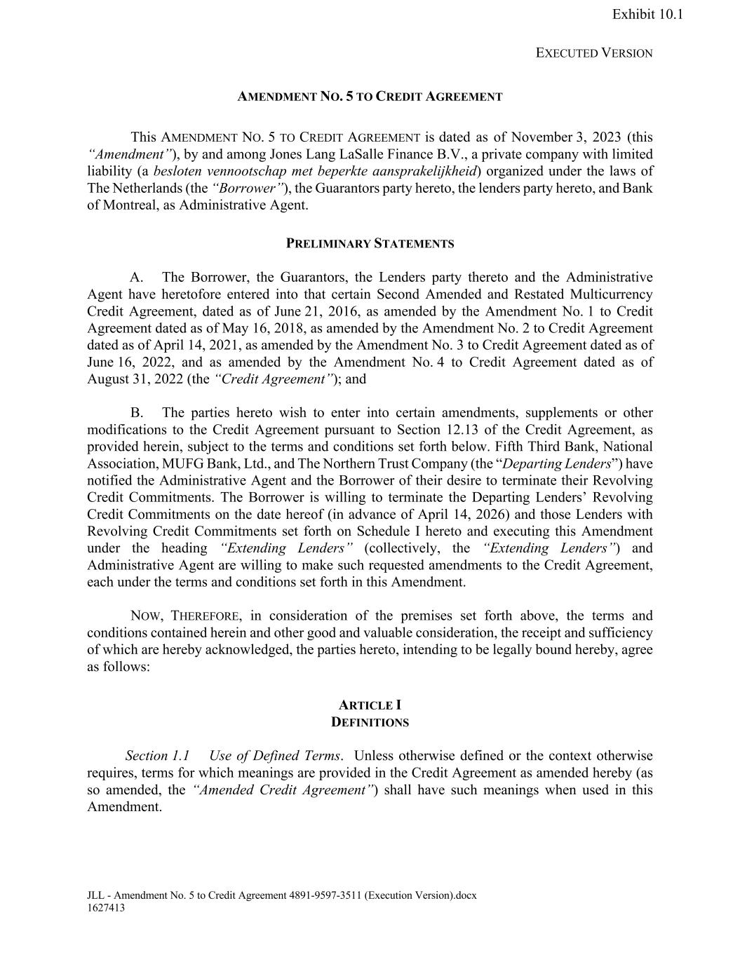 EXECUTED VERSION JLL - Amendment No. 5 to Credit Agreement 4891-9597-3511 (Execution Version).docx 1627413 AMENDMENT NO. 5 TO CREDIT AGREEMENT This AMENDMENT NO. 5 TO CREDIT AGREEMENT is dated as of November 3, 2023 (this “Amendment”), by and among Jones Lang LaSalle Finance B.V., a private company with limited liability (a besloten vennootschap met beperkte aansprakelijkheid) organized under the laws of The Netherlands (the “Borrower”), the Guarantors party hereto, the lenders party hereto, and Bank of Montreal, as Administrative Agent. PRELIMINARY STATEMENTS A. The Borrower, the Guarantors, the Lenders party thereto and the Administrative Agent have heretofore entered into that certain Second Amended and Restated Multicurrency Credit Agreement, dated as of June 21, 2016, as amended by the Amendment No. 1 to Credit Agreement dated as of May 16, 2018, as amended by the Amendment No. 2 to Credit Agreement dated as of April 14, 2021, as amended by the Amendment No. 3 to Credit Agreement dated as of June 16, 2022, and as amended by the Amendment No. 4 to Credit Agreement dated as of August 31, 2022 (the “Credit Agreement”); and B. The parties hereto wish to enter into certain amendments, supplements or other modifications to the Credit Agreement pursuant to Section 12.13 of the Credit Agreement, as provided herein, subject to the terms and conditions set forth below. Fifth Third Bank, National Association, MUFG Bank, Ltd., and The Northern Trust Company (the “Departing Lenders”) have notified the Administrative Agent and the Borrower of their desire to terminate their Revolving Credit Commitments. The Borrower is willing to terminate the Departing Lenders’ Revolving Credit Commitments on the date hereof (in advance of April 14, 2026) and those Lenders with Revolving Credit Commitments set forth on Schedule I hereto and executing this Amendment under the heading “Extending Lenders” (collectively, the “Extending Lenders”) and Administrative Agent are willing to make such requested amendments to the Credit Agreement, each under the terms and conditions set forth in this Amendment. NOW, THEREFORE, in consideration of the premises set forth above, the terms and conditions contained herein and other good and valuable consideration, the receipt and sufficiency of which are hereby acknowledged, the parties hereto, intending to be legally bound hereby, agree as follows: ARTICLE I DEFINITIONS Section 1.1 Use of Defined Terms. Unless otherwise defined or the context otherwise requires, terms for which meanings are provided in the Credit Agreement as amended hereby (as so amended, the “Amended Credit Agreement”) shall have such meanings when used in this Amendment. Exhibit 10.1