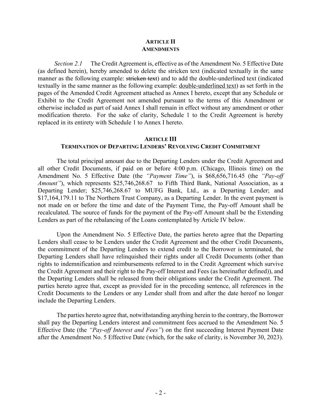 - 2 - ARTICLE II AMENDMENTS Section 2.1 The Credit Agreement is, effective as of the Amendment No. 5 Effective Date (as defined herein), hereby amended to delete the stricken text (indicated textually in the same manner as the following example: stricken text) and to add the double-underlined text (indicated textually in the same manner as the following example: double-underlined text) as set forth in the pages of the Amended Credit Agreement attached as Annex I hereto, except that any Schedule or Exhibit to the Credit Agreement not amended pursuant to the terms of this Amendment or otherwise included as part of said Annex I shall remain in effect without any amendment or other modification thereto. For the sake of clarity, Schedule 1 to the Credit Agreement is hereby replaced in its entirety with Schedule 1 to Annex I hereto. ARTICLE III TERMINATION OF DEPARTING LENDERS’ REVOLVING CREDIT COMMITMENT The total principal amount due to the Departing Lenders under the Credit Agreement and all other Credit Documents, if paid on or before 4:00 p.m. (Chicago, Illinois time) on the Amendment No. 5 Effective Date (the “Payment Time”), is $68,656,716.45 (the “Pay-off Amount”), which represents $25,746,268.67 to Fifth Third Bank, National Association, as a Departing Lender; $25,746,268.67 to MUFG Bank, Ltd., as a Departing Lender; and $17,164,179.11 to The Northern Trust Company, as a Departing Lender. In the event payment is not made on or before the time and date of the Payment Time, the Pay-off Amount shall be recalculated. The source of funds for the payment of the Pay-off Amount shall be the Extending Lenders as part of the rebalancing of the Loans contemplated by Article IV below. Upon the Amendment No. 5 Effective Date, the parties hereto agree that the Departing Lenders shall cease to be Lenders under the Credit Agreement and the other Credit Documents, the commitment of the Departing Lenders to extend credit to the Borrower is terminated, the Departing Lenders shall have relinquished their rights under all Credit Documents (other than rights to indemnification and reimbursements referred to in the Credit Agreement which survive the Credit Agreement and their right to the Pay-off Interest and Fees (as hereinafter defined)), and the Departing Lenders shall be released from their obligations under the Credit Agreement. The parties hereto agree that, except as provided for in the preceding sentence, all references in the Credit Documents to the Lenders or any Lender shall from and after the date hereof no longer include the Departing Lenders. The parties hereto agree that, notwithstanding anything herein to the contrary, the Borrower shall pay the Departing Lenders interest and commitment fees accrued to the Amendment No. 5 Effective Date (the “Pay-off Interest and Fees”) on the first succeeding Interest Payment Date after the Amendment No. 5 Effective Date (which, for the sake of clarity, is November 30, 2023).