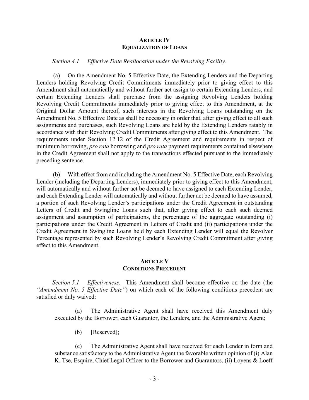 - 3 - ARTICLE IV EQUALIZATION OF LOANS Section 4.1 Effective Date Reallocation under the Revolving Facility. (a) On the Amendment No. 5 Effective Date, the Extending Lenders and the Departing Lenders holding Revolving Credit Commitments immediately prior to giving effect to this Amendment shall automatically and without further act assign to certain Extending Lenders, and certain Extending Lenders shall purchase from the assigning Revolving Lenders holding Revolving Credit Commitments immediately prior to giving effect to this Amendment, at the Original Dollar Amount thereof, such interests in the Revolving Loans outstanding on the Amendment No. 5 Effective Date as shall be necessary in order that, after giving effect to all such assignments and purchases, such Revolving Loans are held by the Extending Lenders ratably in accordance with their Revolving Credit Commitments after giving effect to this Amendment. The requirements under Section 12.12 of the Credit Agreement and requirements in respect of minimum borrowing, pro rata borrowing and pro rata payment requirements contained elsewhere in the Credit Agreement shall not apply to the transactions effected pursuant to the immediately preceding sentence. (b) With effect from and including the Amendment No. 5 Effective Date, each Revolving Lender (including the Departing Lenders), immediately prior to giving effect to this Amendment, will automatically and without further act be deemed to have assigned to each Extending Lender, and each Extending Lender will automatically and without further act be deemed to have assumed, a portion of such Revolving Lender’s participations under the Credit Agreement in outstanding Letters of Credit and Swingline Loans such that, after giving effect to each such deemed assignment and assumption of participations, the percentage of the aggregate outstanding (i) participations under the Credit Agreement in Letters of Credit and (ii) participations under the Credit Agreement in Swingline Loans held by each Extending Lender will equal the Revolver Percentage represented by such Revolving Lender’s Revolving Credit Commitment after giving effect to this Amendment. ARTICLE V CONDITIONS PRECEDENT Section 5.1 Effectiveness. This Amendment shall become effective on the date (the “Amendment No. 5 Effective Date”) on which each of the following conditions precedent are satisfied or duly waived: (a) The Administrative Agent shall have received this Amendment duly executed by the Borrower, each Guarantor, the Lenders, and the Administrative Agent; (b) [Reserved]; (c) The Administrative Agent shall have received for each Lender in form and substance satisfactory to the Administrative Agent the favorable written opinion of (i) Alan K. Tse, Esquire, Chief Legal Officer to the Borrower and Guarantors, (ii) Loyens & Loeff