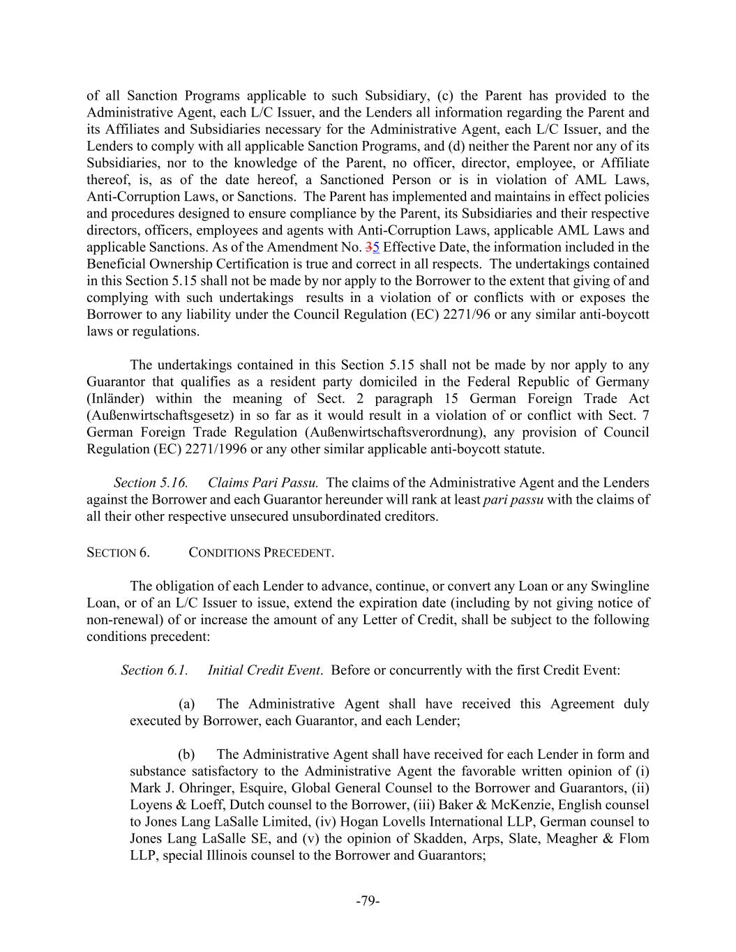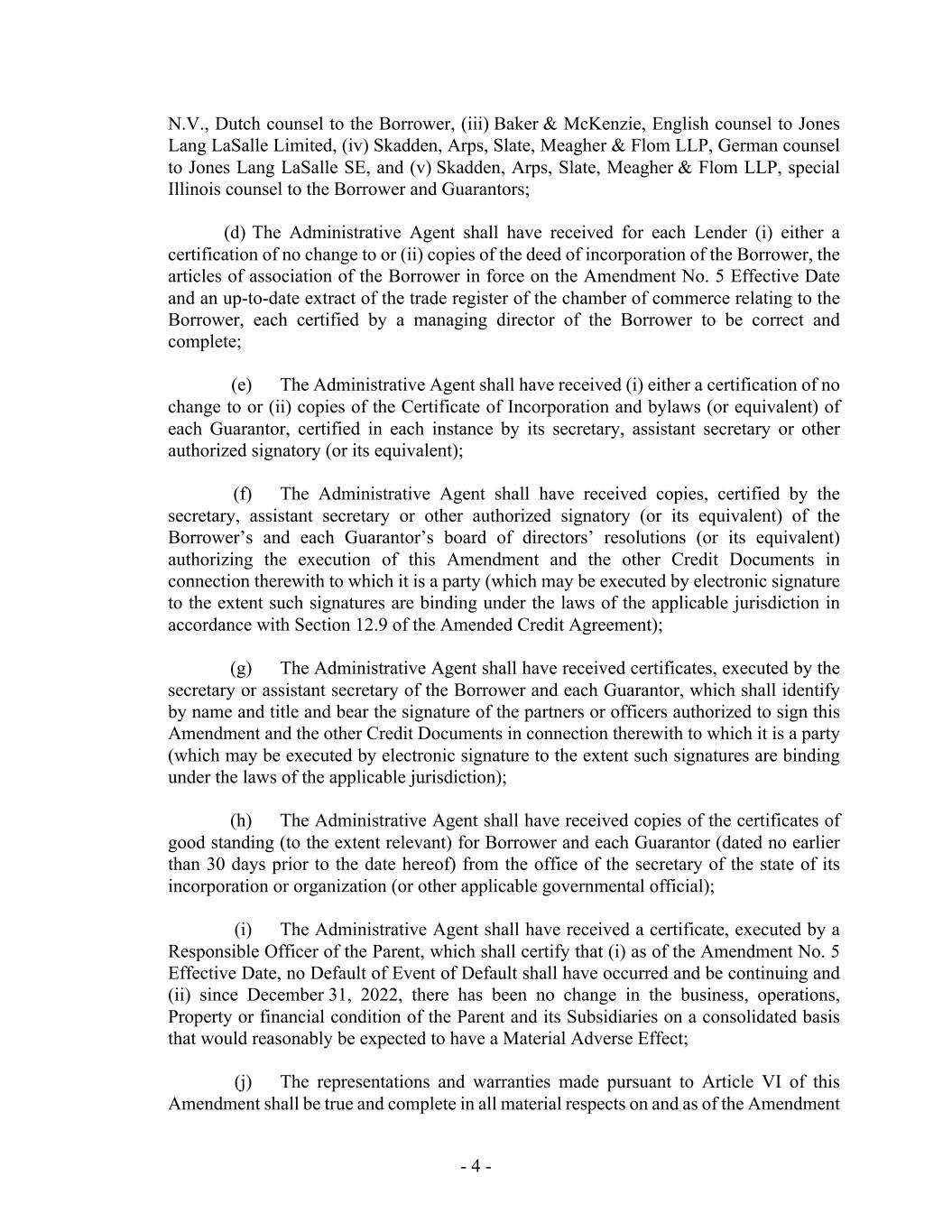- 4 - N.V., Dutch counsel to the Borrower, (iii) Baker & McKenzie, English counsel to Jones Lang LaSalle Limited, (iv) Skadden, Arps, Slate, Meagher & Flom LLP, German counsel to Jones Lang LaSalle SE, and (v) Skadden, Arps, Slate, Meagher & Flom LLP, special Illinois counsel to the Borrower and Guarantors; (d) The Administrative Agent shall have received for each Lender (i) either a certification of no change to or (ii) copies of the deed of incorporation of the Borrower, the articles of association of the Borrower in force on the Amendment No. 5 Effective Date and an up-to-date extract of the trade register of the chamber of commerce relating to the Borrower, each certified by a managing director of the Borrower to be correct and complete; (e) The Administrative Agent shall have received (i) either a certification of no change to or (ii) copies of the Certificate of Incorporation and bylaws (or equivalent) of each Guarantor, certified in each instance by its secretary, assistant secretary or other authorized signatory (or its equivalent); (f) The Administrative Agent shall have received copies, certified by the secretary, assistant secretary or other authorized signatory (or its equivalent) of the Borrower’s and each Guarantor’s board of directors’ resolutions (or its equivalent) authorizing the execution of this Amendment and the other Credit Documents in connection therewith to which it is a party (which may be executed by electronic signature to the extent such signatures are binding under the laws of the applicable jurisdiction in accordance with Section 12.9 of the Amended Credit Agreement); (g) The Administrative Agent shall have received certificates, executed by the secretary or assistant secretary of the Borrower and each Guarantor, which shall identify by name and title and bear the signature of the partners or officers authorized to sign this Amendment and the other Credit Documents in connection therewith to which it is a party (which may be executed by electronic signature to the extent such signatures are binding under the laws of the applicable jurisdiction); (h) The Administrative Agent shall have received copies of the certificates of good standing (to the extent relevant) for Borrower and each Guarantor (dated no earlier than 30 days prior to the date hereof) from the office of the secretary of the state of its incorporation or organization (or other applicable governmental official); (i) The Administrative Agent shall have received a certificate, executed by a Responsible Officer of the Parent, which shall certify that (i) as of the Amendment No. 5 Effective Date, no Default of Event of Default shall have occurred and be continuing and (ii) since December 31, 2022, there has been no change in the business, operations, Property or financial condition of the Parent and its Subsidiaries on a consolidated basis that would reasonably be expected to have a Material Adverse Effect; (j) The representations and warranties made pursuant to Article VI of this Amendment shall be true and complete in all material respects on and as of the Amendment