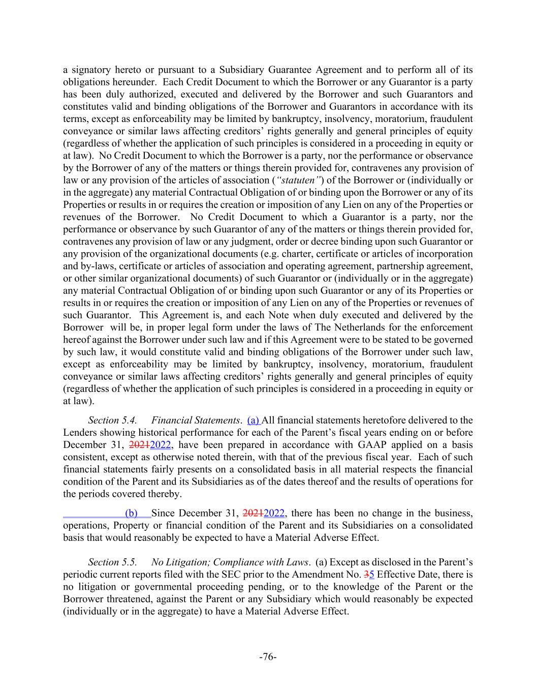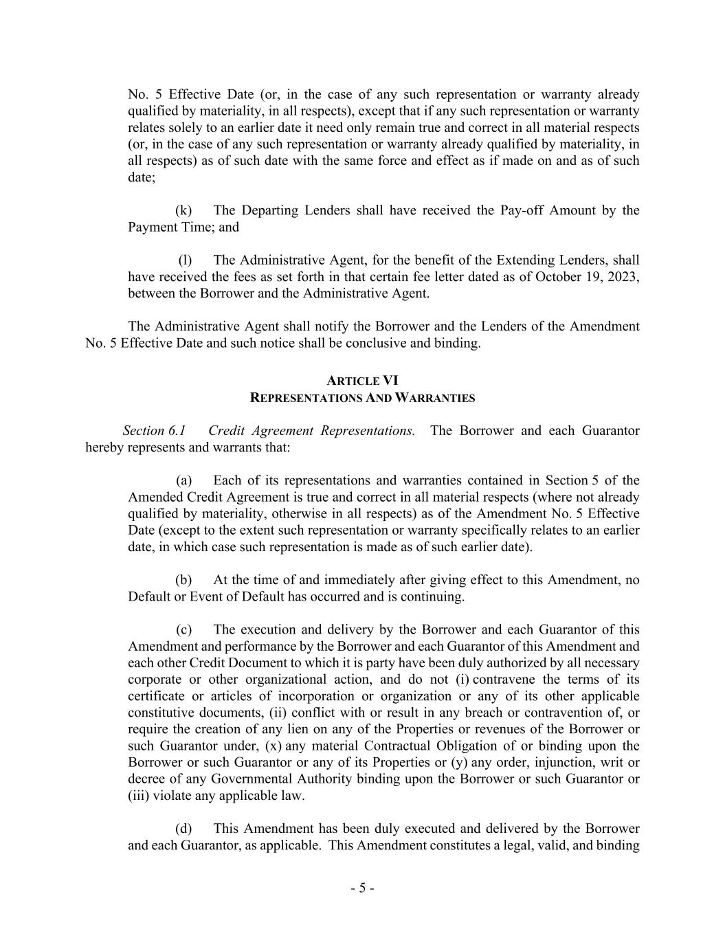 - 5 - No. 5 Effective Date (or, in the case of any such representation or warranty already qualified by materiality, in all respects), except that if any such representation or warranty relates solely to an earlier date it need only remain true and correct in all material respects (or, in the case of any such representation or warranty already qualified by materiality, in all respects) as of such date with the same force and effect as if made on and as of such date; (k) The Departing Lenders shall have received the Pay-off Amount by the Payment Time; and (l) The Administrative Agent, for the benefit of the Extending Lenders, shall have received the fees as set forth in that certain fee letter dated as of October 19, 2023, between the Borrower and the Administrative Agent. The Administrative Agent shall notify the Borrower and the Lenders of the Amendment No. 5 Effective Date and such notice shall be conclusive and binding. ARTICLE VI REPRESENTATIONS AND WARRANTIES Section 6.1 Credit Agreement Representations. The Borrower and each Guarantor hereby represents and warrants that: (a) Each of its representations and warranties contained in Section 5 of the Amended Credit Agreement is true and correct in all material respects (where not already qualified by materiality, otherwise in all respects) as of the Amendment No. 5 Effective Date (except to the extent such representation or warranty specifically relates to an earlier date, in which case such representation is made as of such earlier date). (b) At the time of and immediately after giving effect to this Amendment, no Default or Event of Default has occurred and is continuing. (c) The execution and delivery by the Borrower and each Guarantor of this Amendment and performance by the Borrower and each Guarantor of this Amendment and each other Credit Document to which it is party have been duly authorized by all necessary corporate or other organizational action, and do not (i) contravene the terms of its certificate or articles of incorporation or organization or any of its other applicable constitutive documents, (ii) conflict with or result in any breach or contravention of, or require the creation of any lien on any of the Properties or revenues of the Borrower or such Guarantor under, (x) any material Contractual Obligation of or binding upon the Borrower or such Guarantor or any of its Properties or (y) any order, injunction, writ or decree of any Governmental Authority binding upon the Borrower or such Guarantor or (iii) violate any applicable law. (d) This Amendment has been duly executed and delivered by the Borrower and each Guarantor, as applicable. This Amendment constitutes a legal, valid, and binding