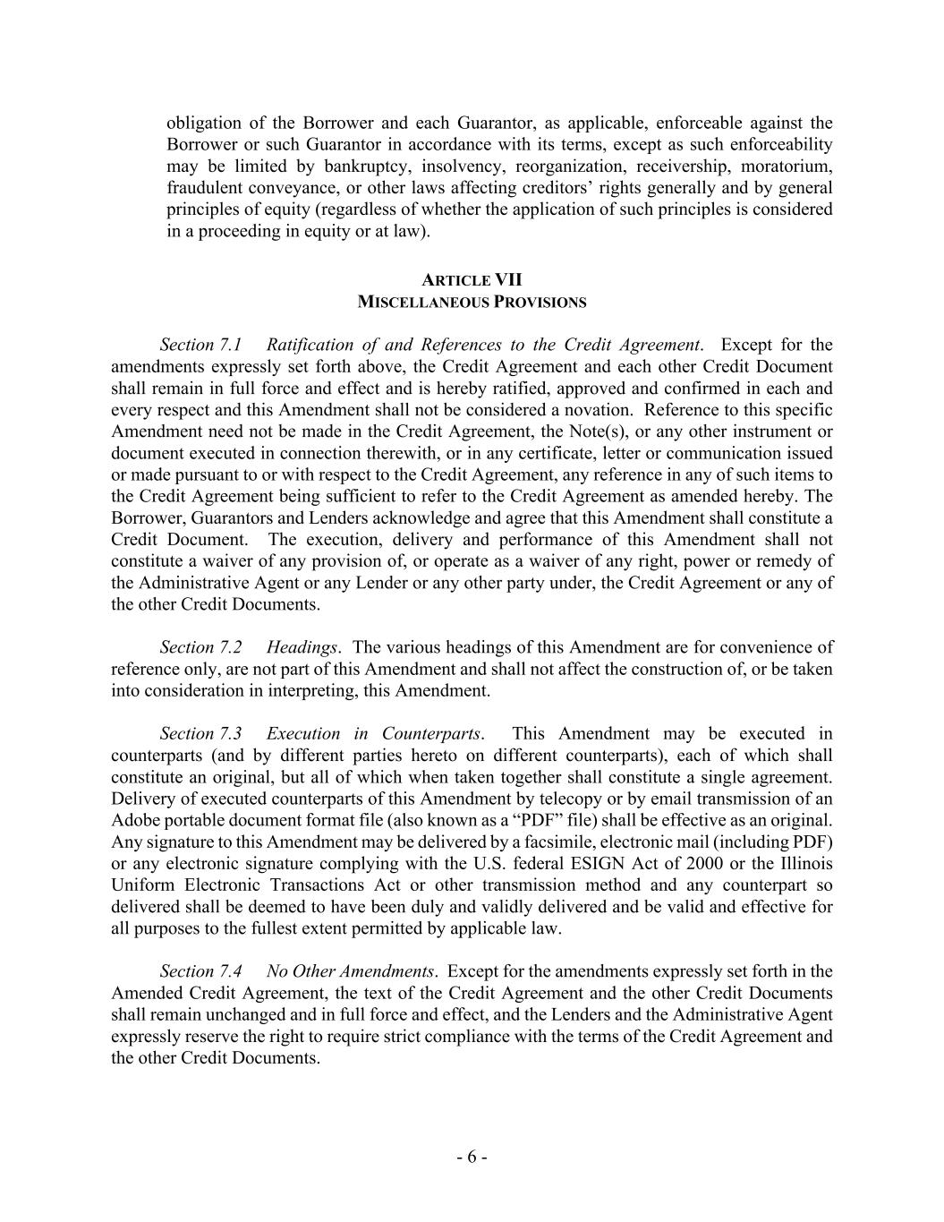 - 6 - obligation of the Borrower and each Guarantor, as applicable, enforceable against the Borrower or such Guarantor in accordance with its terms, except as such enforceability may be limited by bankruptcy, insolvency, reorganization, receivership, moratorium, fraudulent conveyance, or other laws affecting creditors’ rights generally and by general principles of equity (regardless of whether the application of such principles is considered in a proceeding in equity or at law). ARTICLE VII MISCELLANEOUS PROVISIONS Section 7.1 Ratification of and References to the Credit Agreement. Except for the amendments expressly set forth above, the Credit Agreement and each other Credit Document shall remain in full force and effect and is hereby ratified, approved and confirmed in each and every respect and this Amendment shall not be considered a novation. Reference to this specific Amendment need not be made in the Credit Agreement, the Note(s), or any other instrument or document executed in connection therewith, or in any certificate, letter or communication issued or made pursuant to or with respect to the Credit Agreement, any reference in any of such items to the Credit Agreement being sufficient to refer to the Credit Agreement as amended hereby. The Borrower, Guarantors and Lenders acknowledge and agree that this Amendment shall constitute a Credit Document. The execution, delivery and performance of this Amendment shall not constitute a waiver of any provision of, or operate as a waiver of any right, power or remedy of the Administrative Agent or any Lender or any other party under, the Credit Agreement or any of the other Credit Documents. Section 7.2 Headings. The various headings of this Amendment are for convenience of reference only, are not part of this Amendment and shall not affect the construction of, or be taken into consideration in interpreting, this Amendment. Section 7.3 Execution in Counterparts. This Amendment may be executed in counterparts (and by different parties hereto on different counterparts), each of which shall constitute an original, but all of which when taken together shall constitute a single agreement. Delivery of executed counterparts of this Amendment by telecopy or by email transmission of an Adobe portable document format file (also known as a “PDF” file) shall be effective as an original. Any signature to this Amendment may be delivered by a facsimile, electronic mail (including PDF) or any electronic signature complying with the U.S. federal ESIGN Act of 2000 or the Illinois Uniform Electronic Transactions Act or other transmission method and any counterpart so delivered shall be deemed to have been duly and validly delivered and be valid and effective for all purposes to the fullest extent permitted by applicable law. Section 7.4 No Other Amendments. Except for the amendments expressly set forth in the Amended Credit Agreement, the text of the Credit Agreement and the other Credit Documents shall remain unchanged and in full force and effect, and the Lenders and the Administrative Agent expressly reserve the right to require strict compliance with the terms of the Credit Agreement and the other Credit Documents.