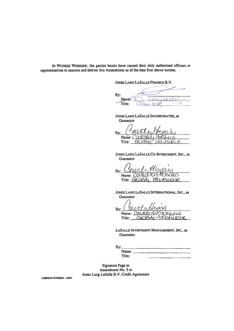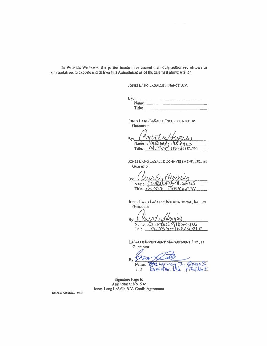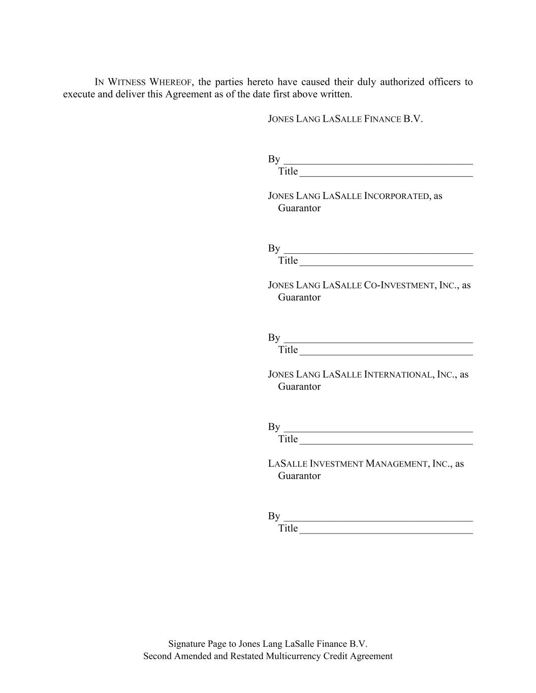 Signature Page to Jones Lang LaSalle Finance B.V. Second Amended and Restated Multicurrency Credit Agreement IN WITNESS WHEREOF, the parties hereto have caused their duly authorized officers to execute and deliver this Agreement as of the date first above written. JONES LANG LASALLE FINANCE B.V. By ____________________________________ Title _________________________________ JONES LANG LASALLE INCORPORATED, as Guarantor By ____________________________________ Title _________________________________ JONES LANG LASALLE CO-INVESTMENT, INC., as Guarantor By ____________________________________ Title _________________________________ JONES LANG LASALLE INTERNATIONAL, INC., as Guarantor By ____________________________________ Title _________________________________ LASALLE INVESTMENT MANAGEMENT, INC., as Guarantor By ____________________________________ Title _________________________________