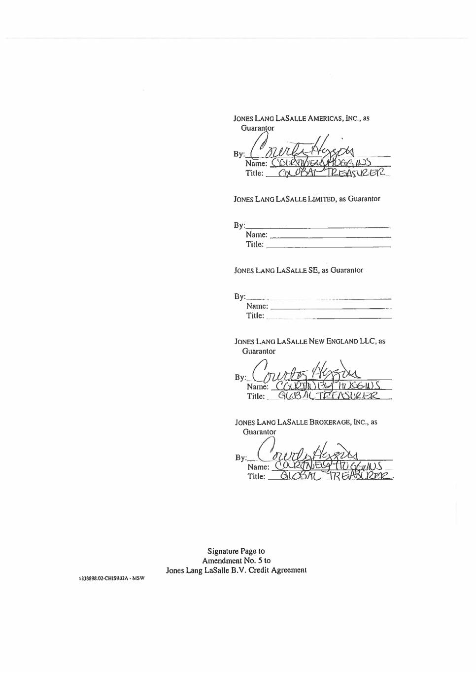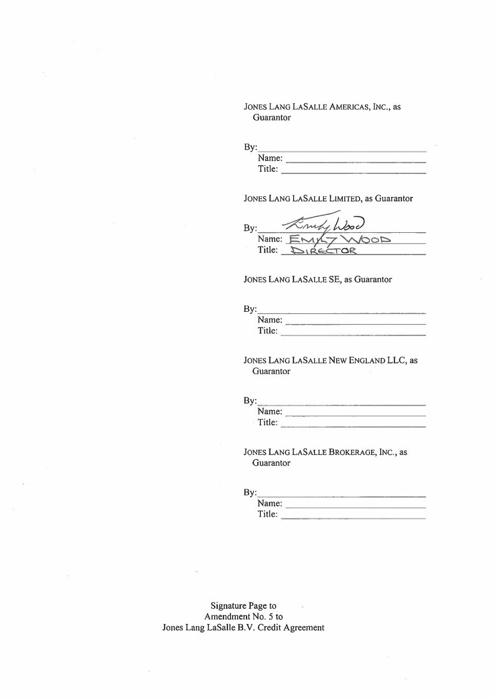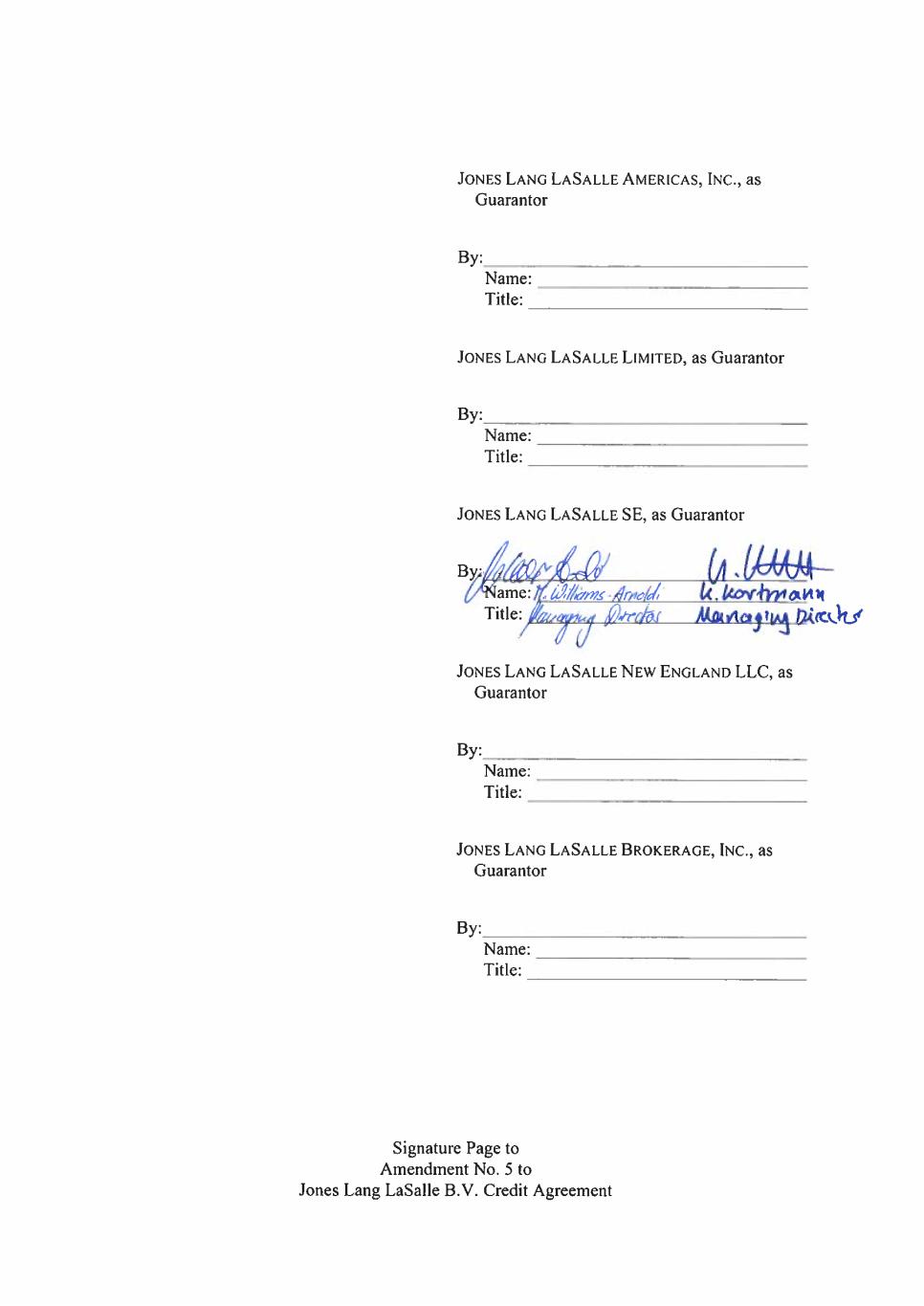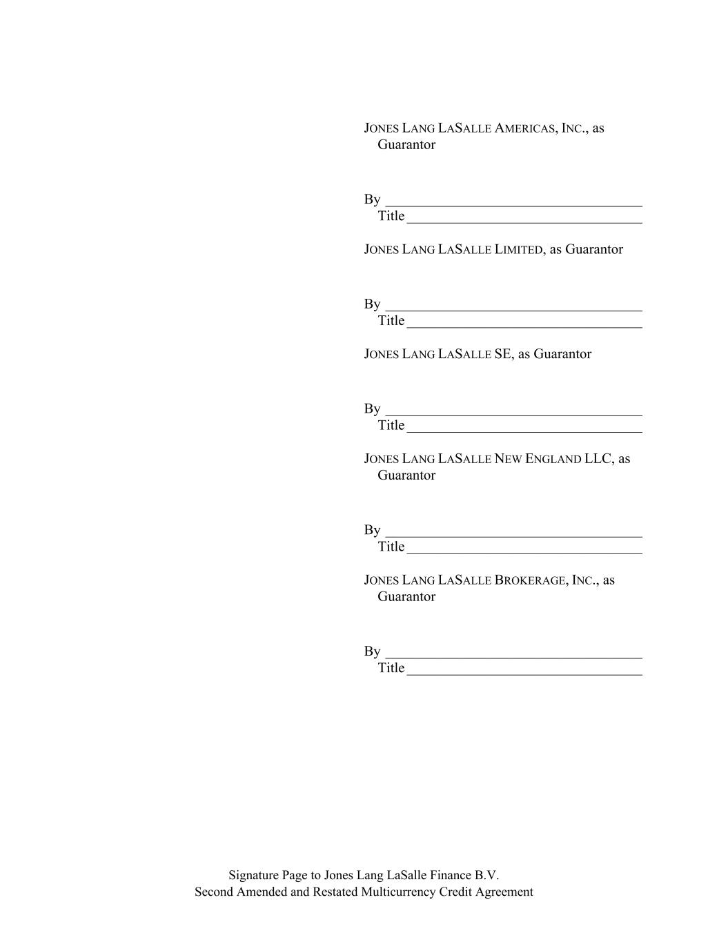 Signature Page to Jones Lang LaSalle Finance B.V. Second Amended and Restated Multicurrency Credit Agreement JONES LANG LASALLE AMERICAS, INC., as Guarantor By ____________________________________ Title _________________________________ JONES LANG LASALLE LIMITED, as Guarantor By ____________________________________ Title _________________________________ JONES LANG LASALLE SE, as Guarantor By ____________________________________ Title _________________________________ JONES LANG LASALLE NEW ENGLAND LLC, as Guarantor By ____________________________________ Title _________________________________ JONES LANG LASALLE BROKERAGE, INC., as Guarantor By ____________________________________ Title _________________________________