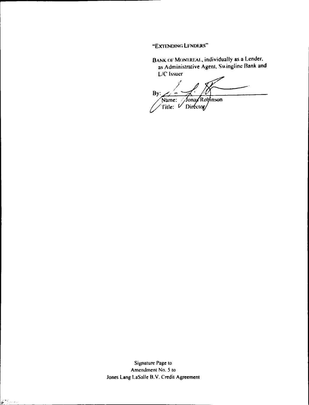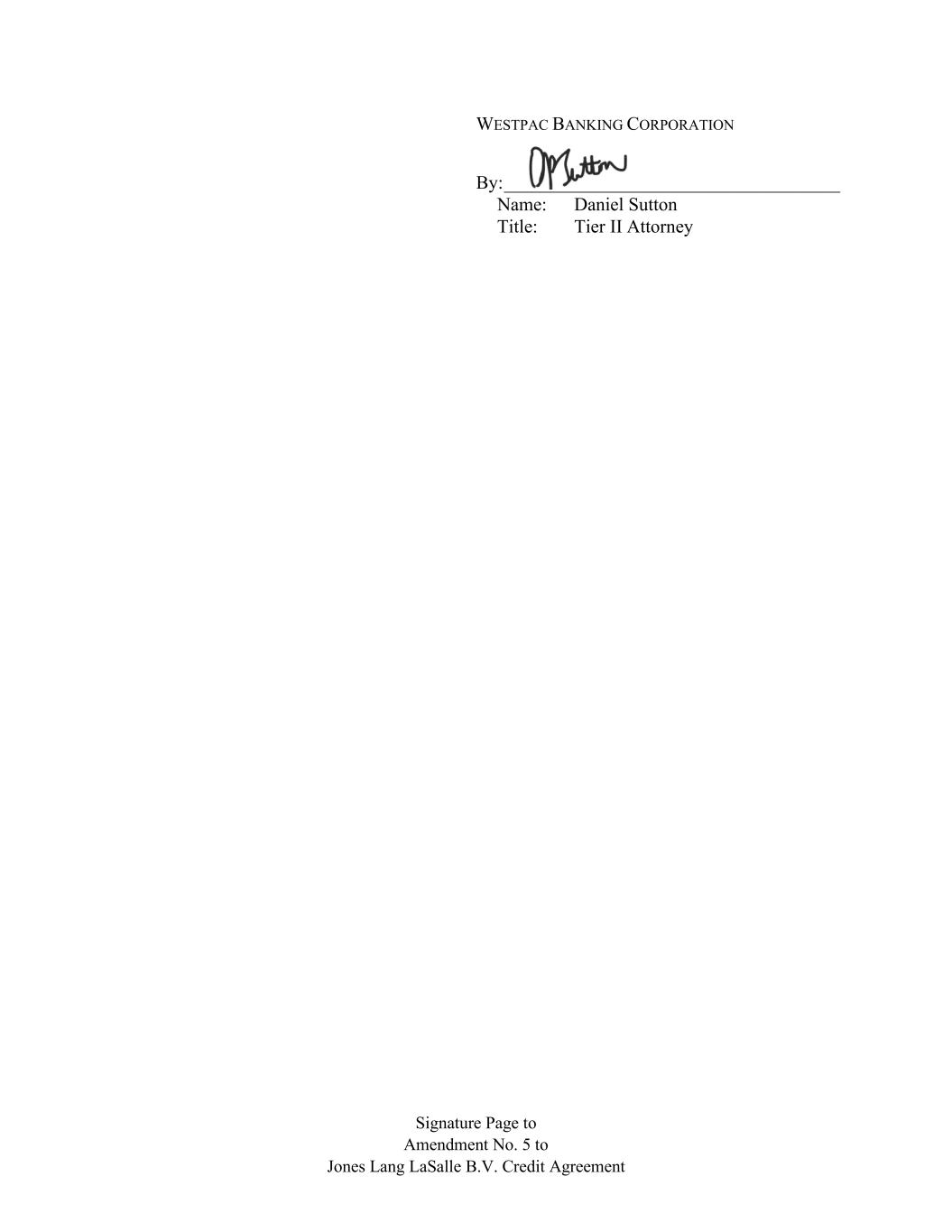 Signature Page to Amendment No. 5 to Jones Lang LaSalle B.V. Credit Agreement WESTPAC BANKING CORPORATION By: ____________________________________ Name: Daniel Sutton Title: Tier II Attorney