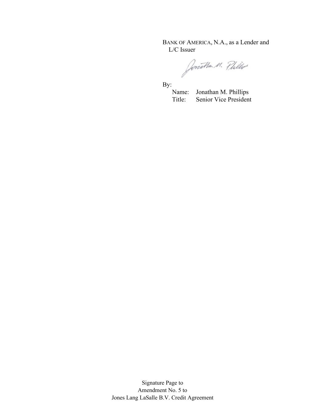 Signature Page to Amendment No. 5 to Jones Lang LaSalle B.V. Credit Agreement BANK OF AMERICA, N.A., as a Lender and L/C Issuer By: Name: Jonathan M. Phillips Title: Senior Vice President