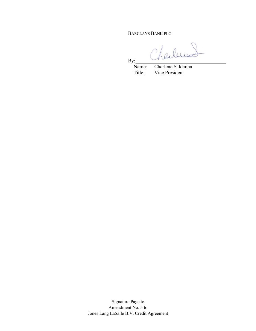 Signature Page to Amendment No. 5 to Jones Lang LaSalle B.V. Credit Agreement BARCLAYS BANK PLC By: ____________________________________ Name: Charlene Saldanha Title: Vice President