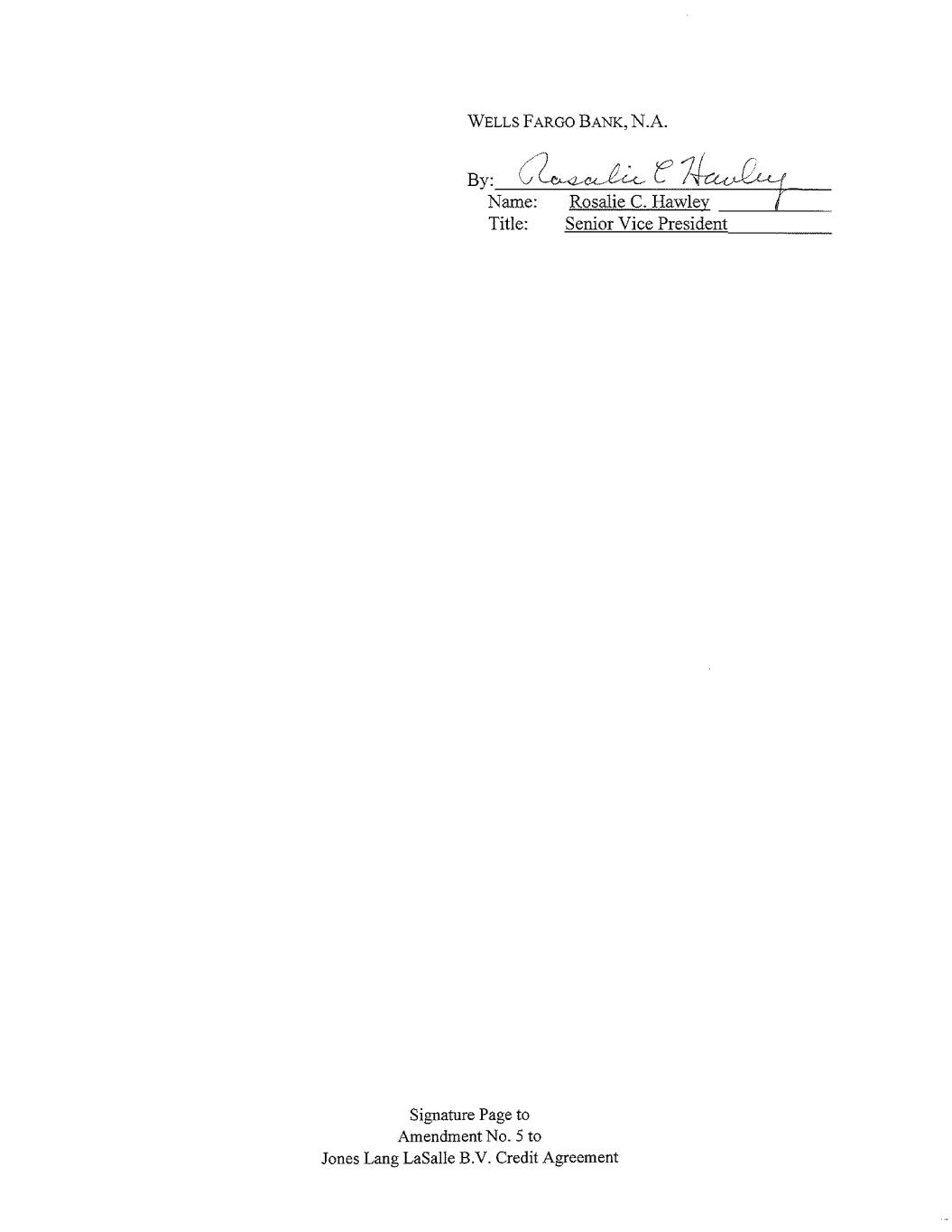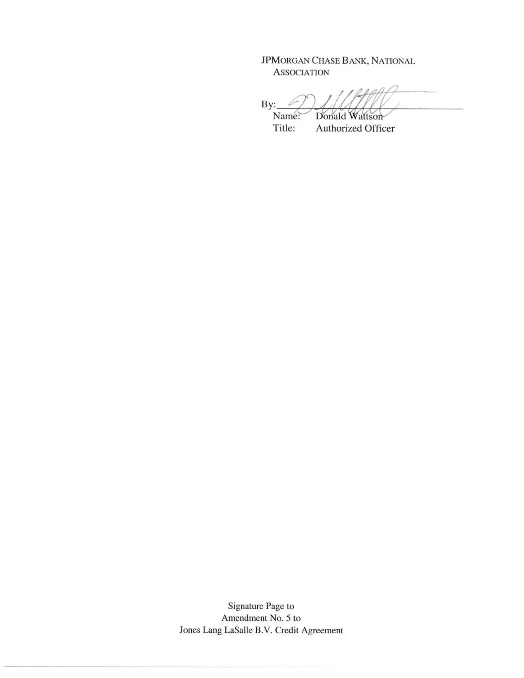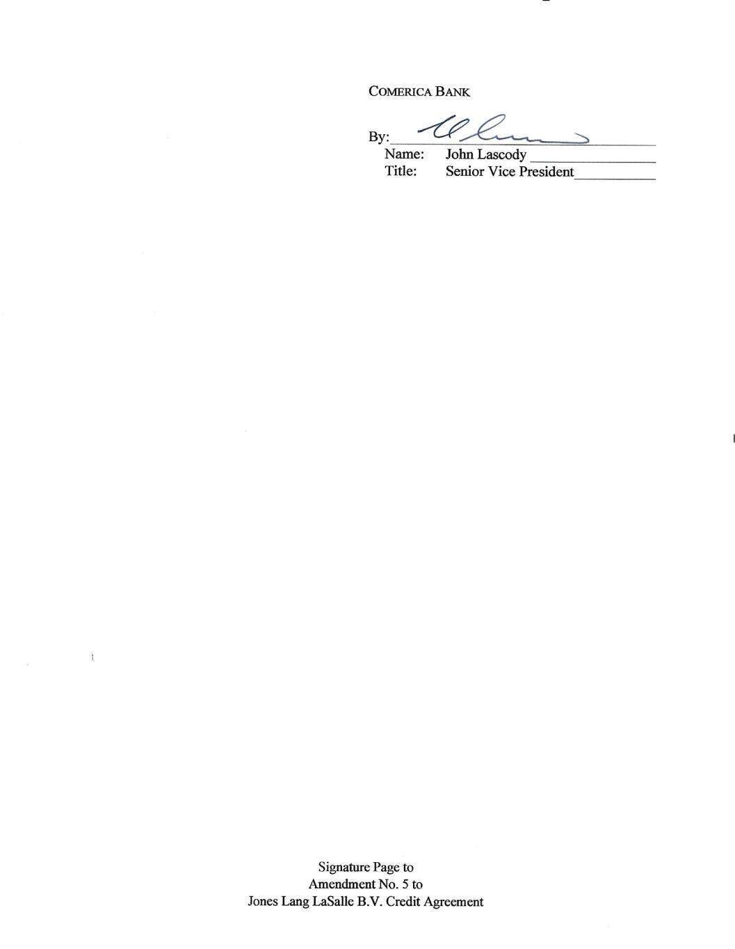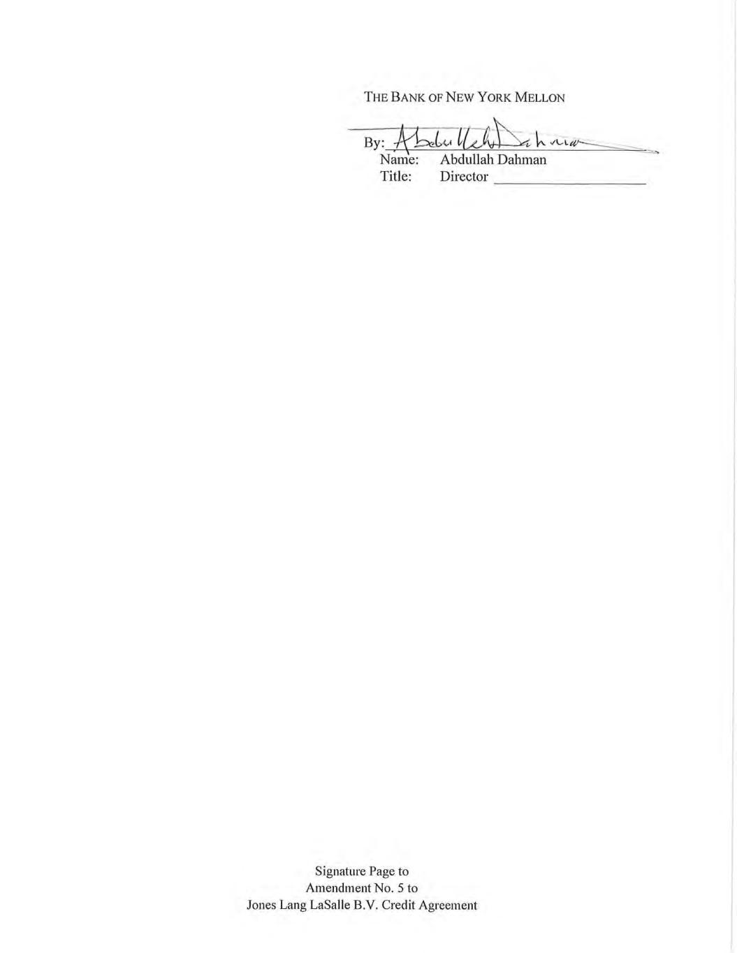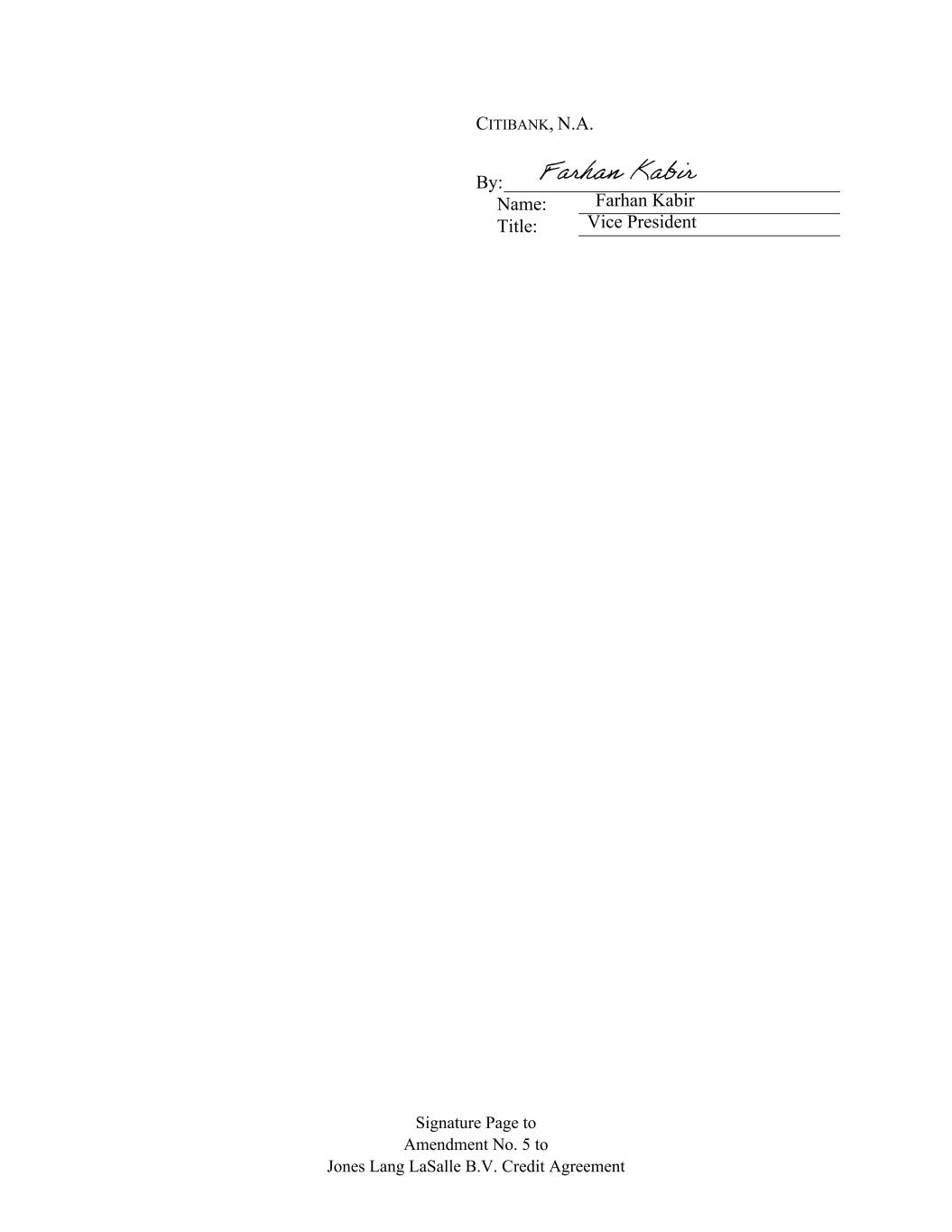 Signature Page to Amendment No. 5 to Jones Lang LaSalle B.V. Credit Agreement CITIBANK, N.A. By: ____________________________________ Name: ____________________________ Title: ____________________________ Farhan Kabir Vice President