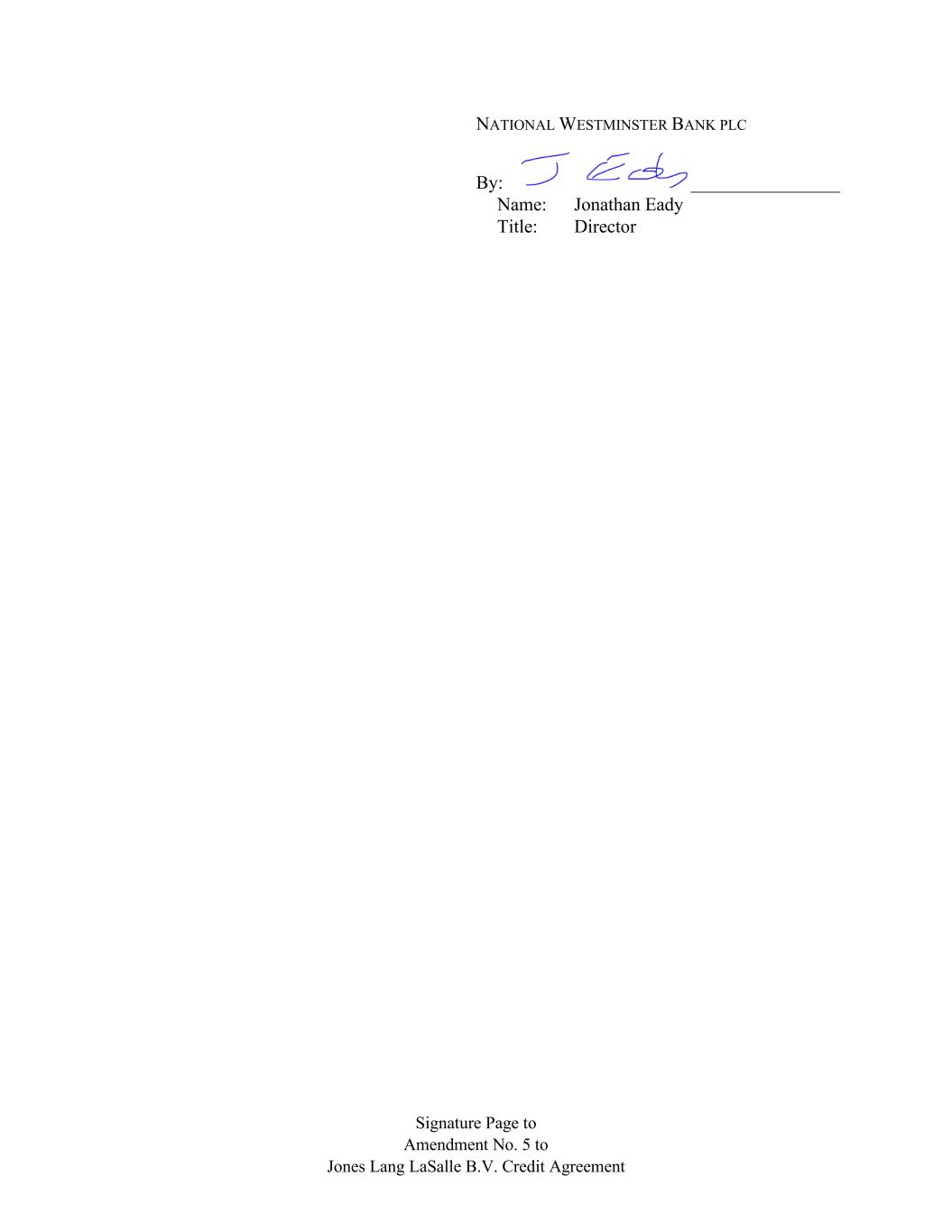 Signature Page to Amendment No. 5 to Jones Lang LaSalle B.V. Credit Agreement NATIONAL WESTMINSTER BANK PLC By: ________________ Name: Jonathan Eady Title: Director