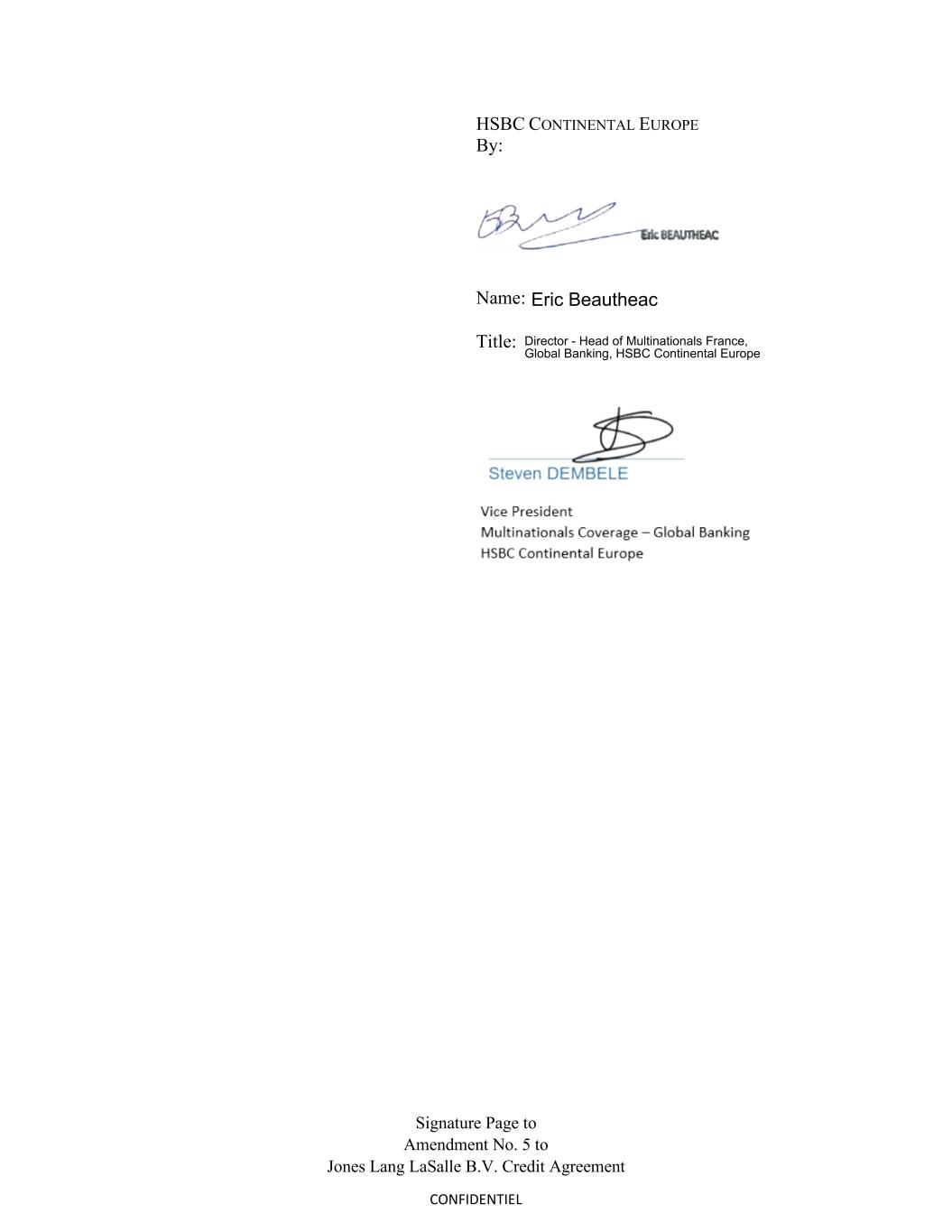 Signature Page to Amendment No. 5 to Jones Lang LaSalle B.V. Credit Agreement CONFIDENTIEL HSBC CONTINENTAL EUROPE By: Name: Title: Eric Beautheac Director - Head of Multinationals France, Global Banking, HSBC Continental Europe