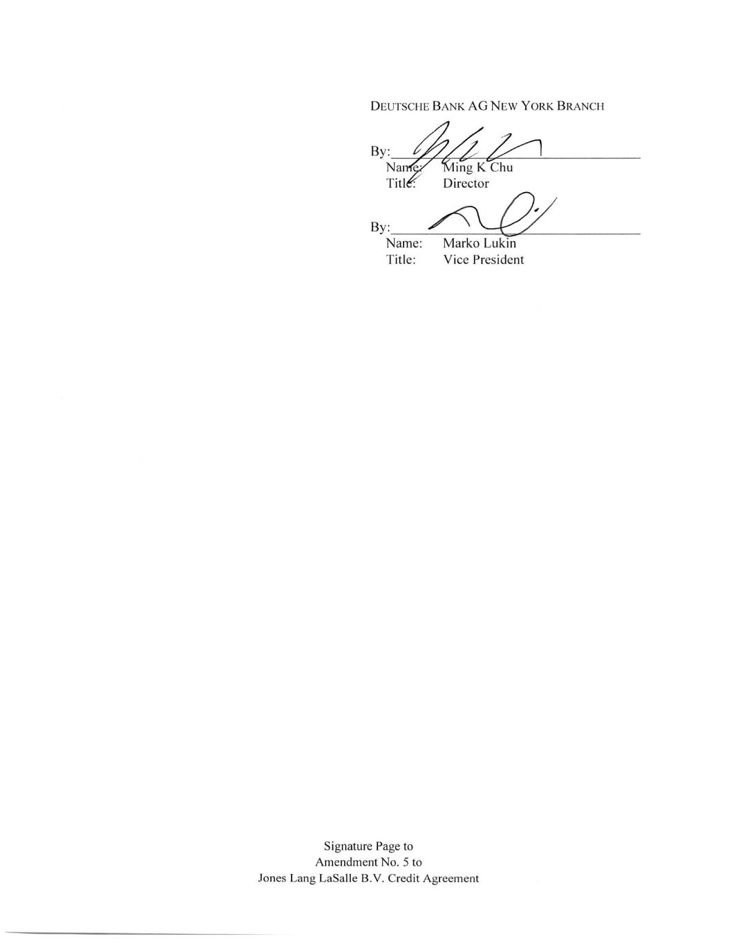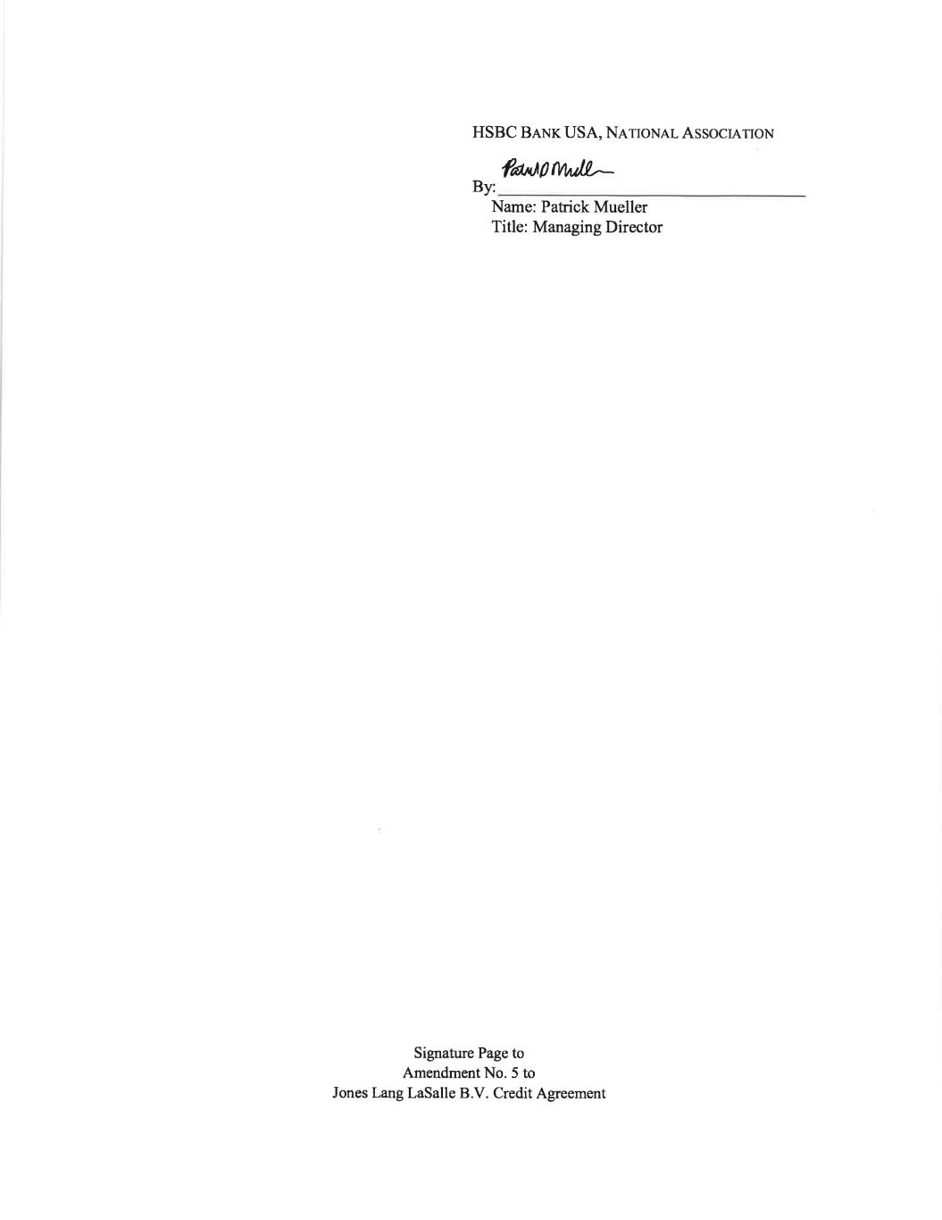 HSBC Bank USA, National Association Signature Page to Amendment No. 5 to Jones Lang LaSalle B.V. Credit Agreement By:___________________ Name: Patrick Mueller Title: Managing Director