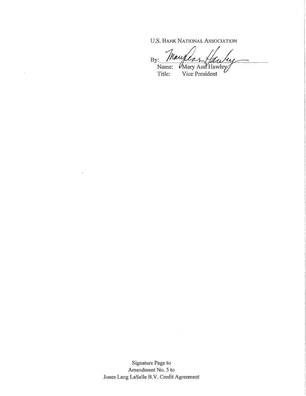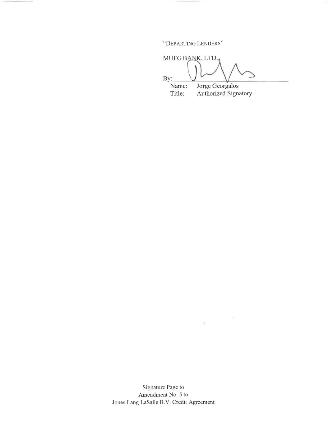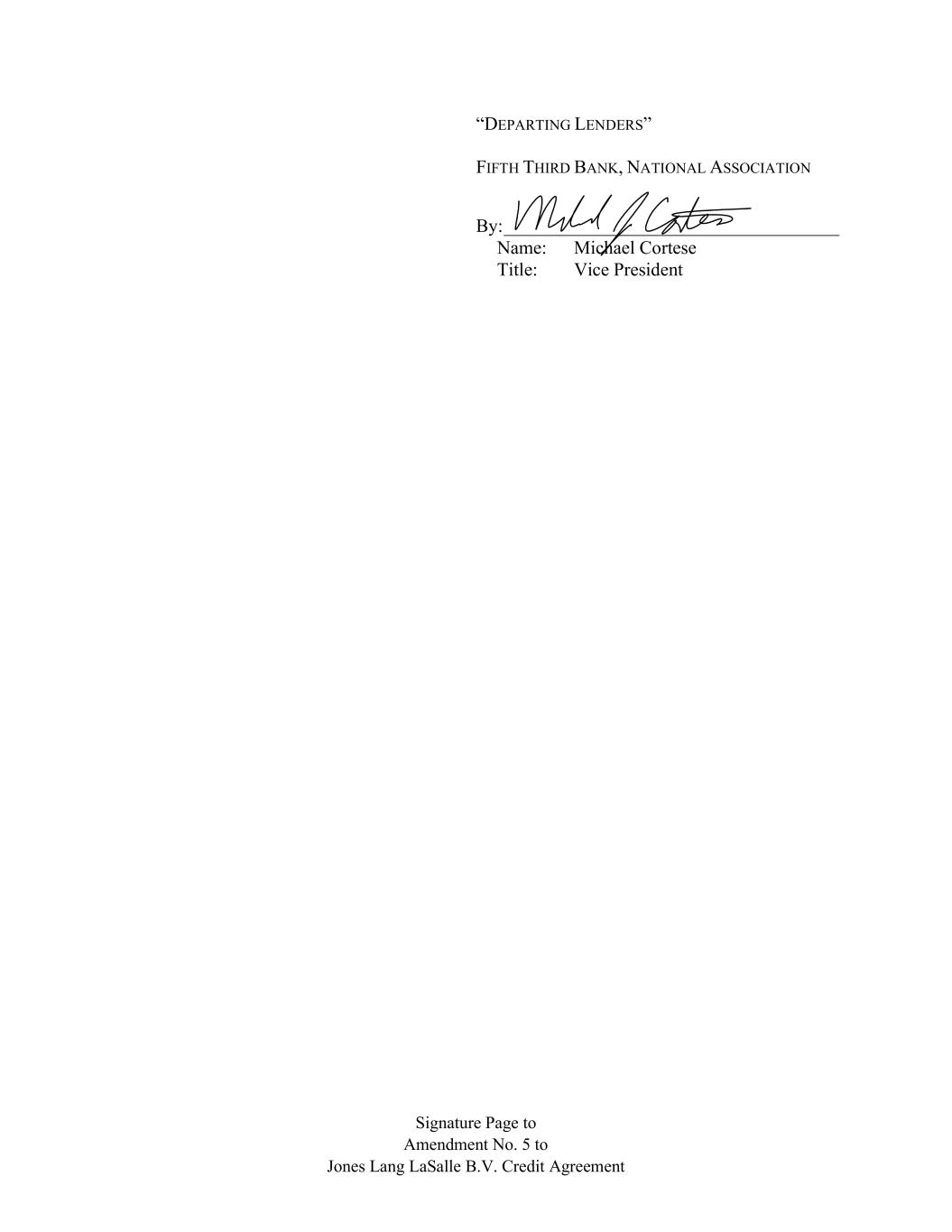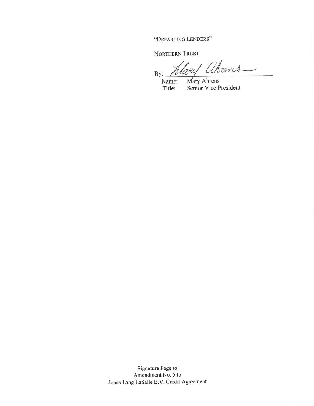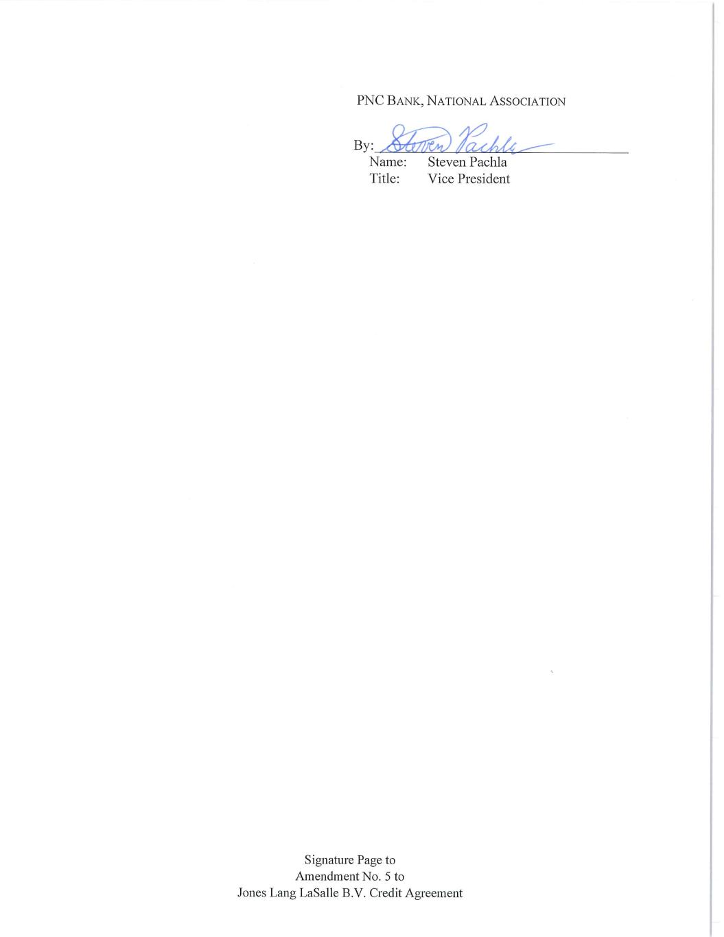 Signature Page to Amendment No. 5 to Jones Lang LaSalle B.V. Credit Agreement “DEPARTING LENDERS” FIFTH THIRD BANK, NATIONAL ASSOCIATION By: ____________________________________ Name: Michael Cortese Title: Vice President