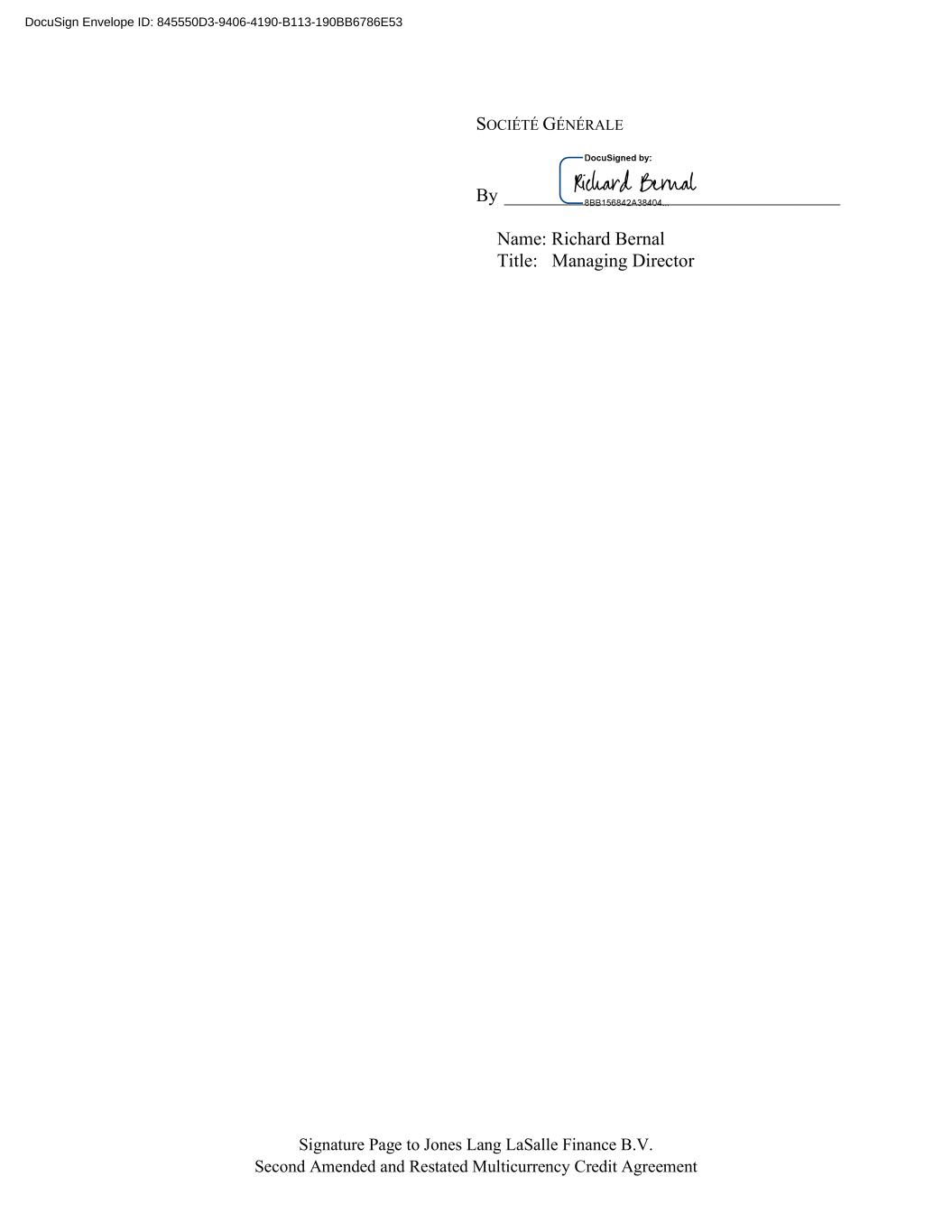 Signature Page to Jones Lang LaSalle Finance B.V. Second Amended and Restated Multicurrency Credit Agreement SOCIÉTÉ GÉNÉRALE By ____________________________________ Name: Richard Bernal Title: Managing Director DocuSign Envelope ID: 845550D3-9406-4190-B113-190BB6786E53
