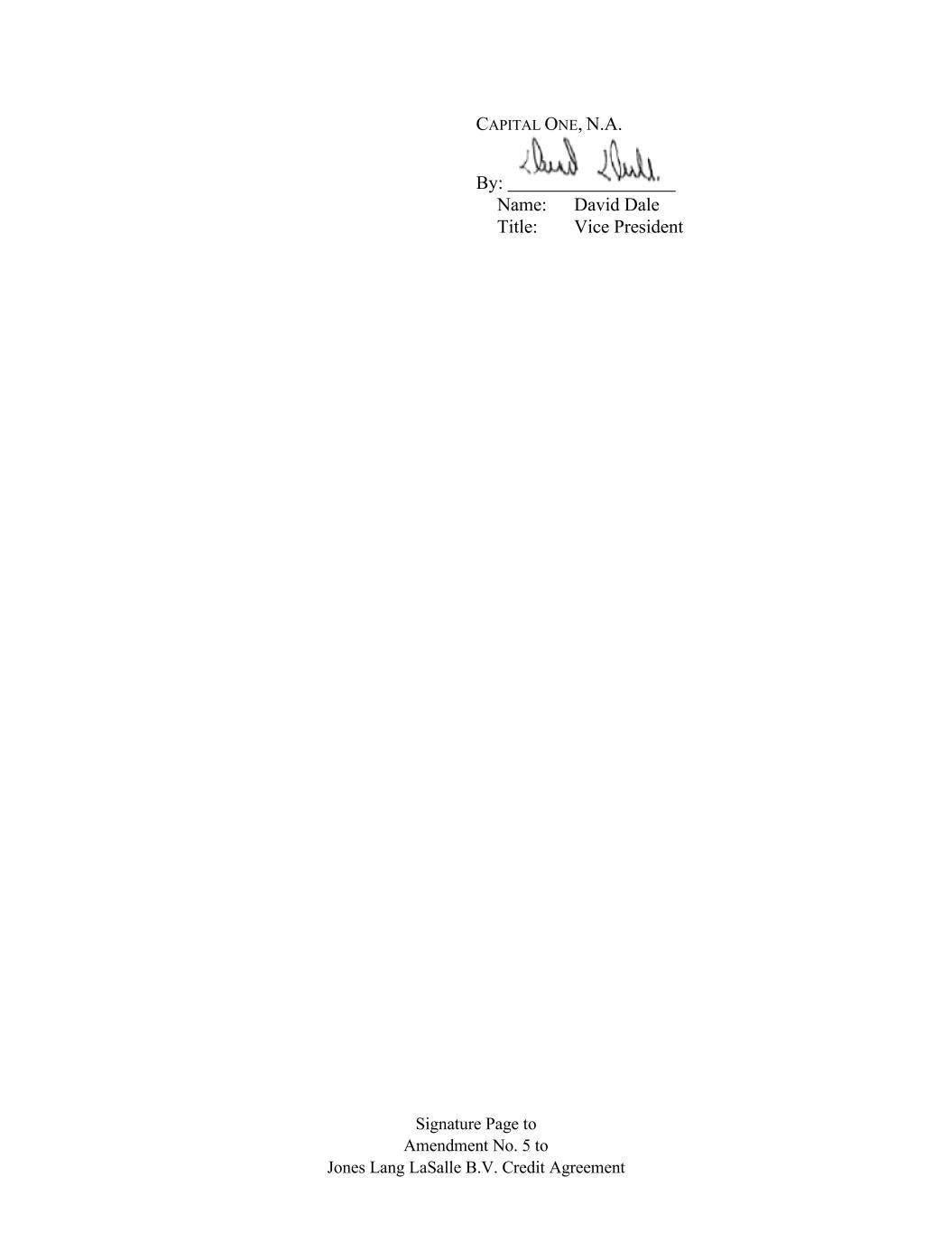 Signature Page to Amendment No. 5 to Jones Lang LaSalle B.V. Credit Agreement CAPITAL ONE, N.A. By: Name: David Dale Title: Vice President
