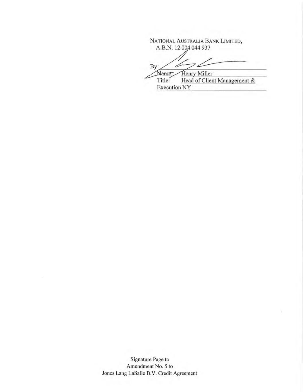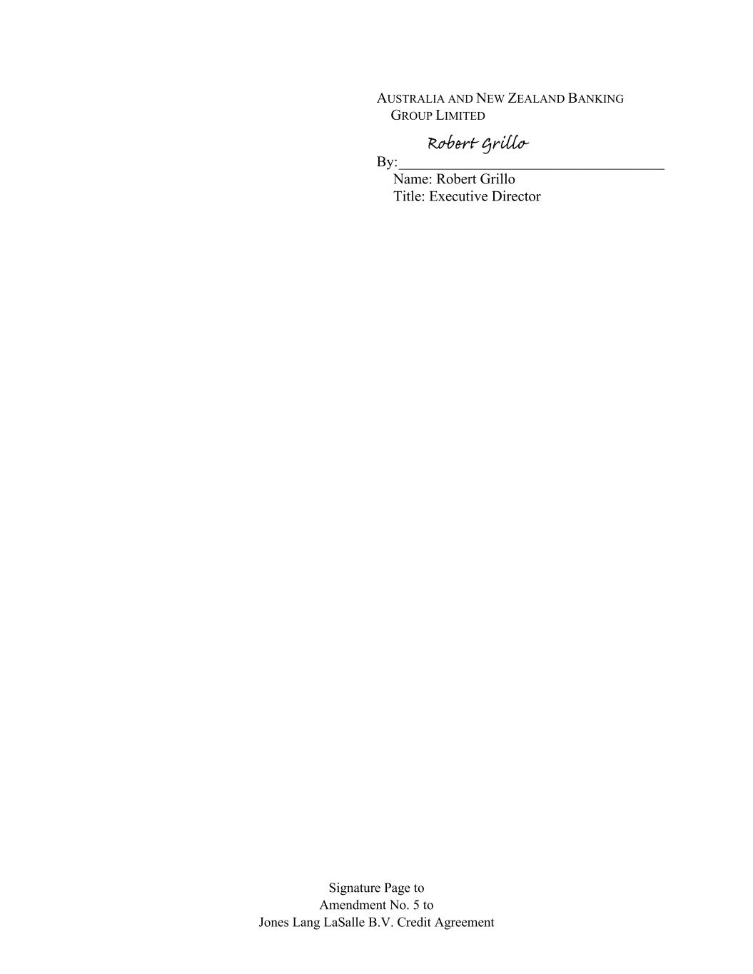 Signature Page to Amendment No. 5 to Jones Lang LaSalle B.V. Credit Agreement AUSTRALIA AND NEW ZEALAND BANKING GROUP LIMITED By: ____________________________________ Name: Robert Grillo Title: Executive Director