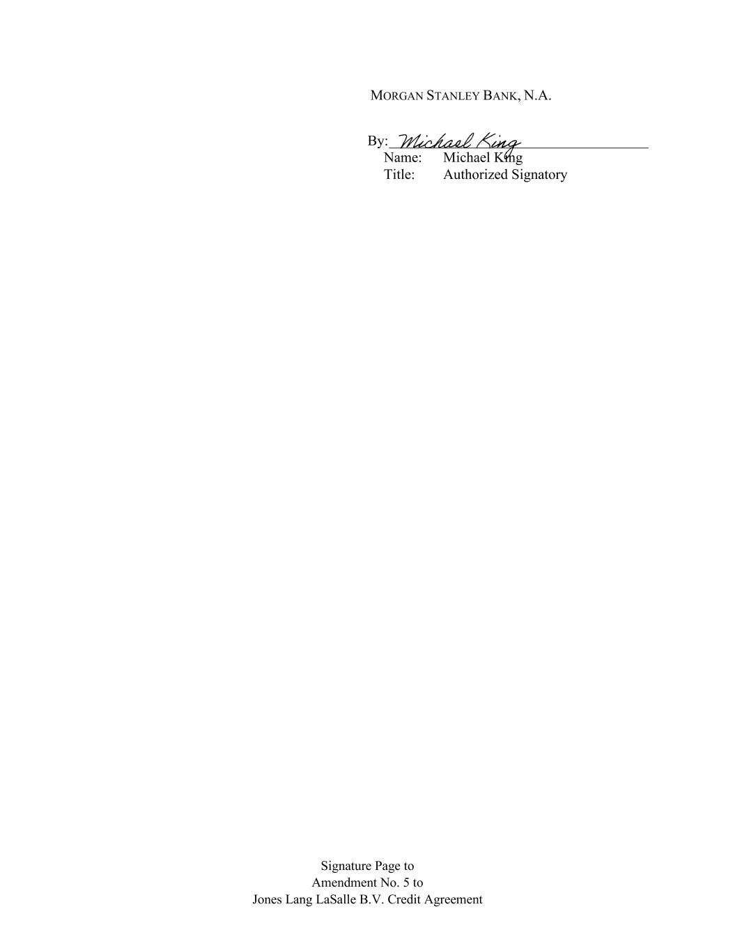 Signature Page to Amendment No. 5 to Jones Lang LaSalle B.V. Credit Agreement MORGAN STANLEY BANK, N.A. By: ____________________________________ Name: Michael King Title: Authorized Signatory