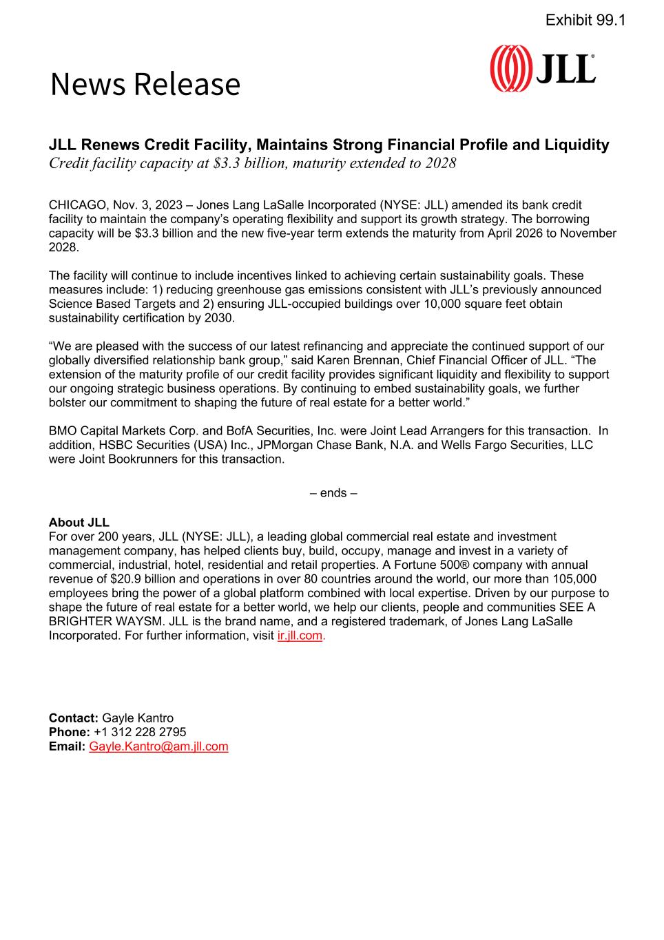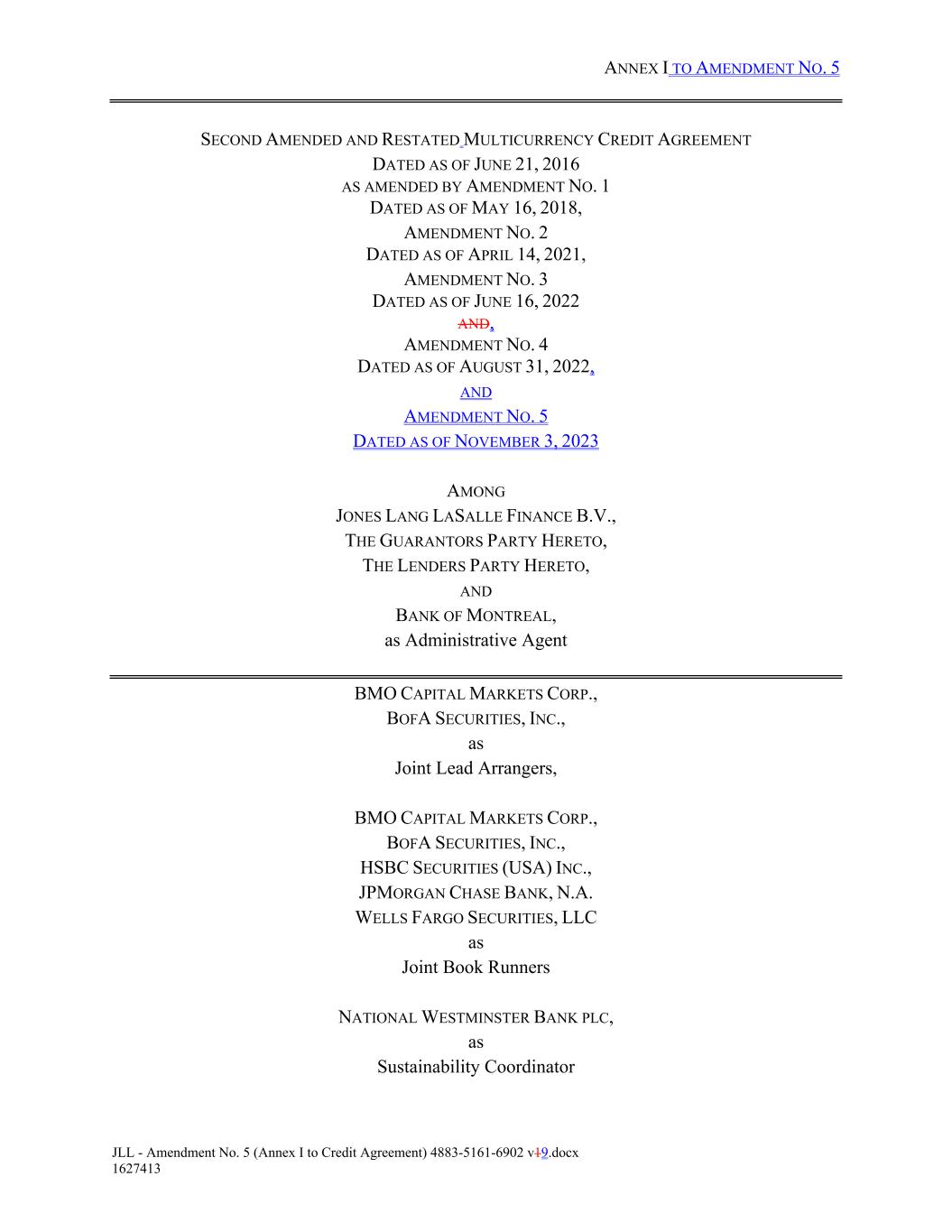 ANNEX I TO AMENDMENT NO. 5 JLL - Amendment No. 5 (Annex I to Credit Agreement) 4883-5161-6902 v19.docx 1627413 SECOND AMENDED AND RESTATED MULTICURRENCY CREDIT AGREEMENT DATED AS OF JUNE 21, 2016 AS AMENDED BY AMENDMENT NO. 1 DATED AS OF MAY 16, 2018, AMENDMENT NO. 2 DATED AS OF APRIL 14, 2021, AMENDMENT NO. 3 DATED AS OF JUNE 16, 2022 AND, AMENDMENT NO. 4 DATED AS OF AUGUST 31, 2022, AND AMENDMENT NO. 5 DATED AS OF NOVEMBER 3, 2023 AMONG JONES LANG LASALLE FINANCE B.V., THE GUARANTORS PARTY HERETO, THE LENDERS PARTY HERETO, AND BANK OF MONTREAL, as Administrative Agent BMO CAPITAL MARKETS CORP., BOFA SECURITIES, INC., as Joint Lead Arrangers, BMO CAPITAL MARKETS CORP., BOFA SECURITIES, INC., HSBC SECURITIES (USA) INC., JPMORGAN CHASE BANK, N.A. WELLS FARGO SECURITIES, LLC as Joint Book Runners NATIONAL WESTMINSTER BANK PLC, as Sustainability Coordinator